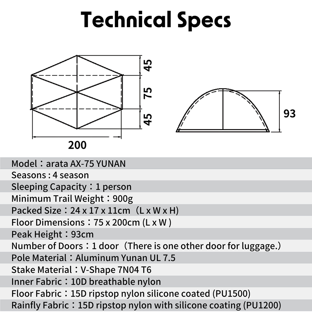 2024年夏にデビューする【arata】は、経験豊富なエンジニア達により設計される、ULで堅牢なギアの開発を行うブランド。 豊富なアウトドアの経験を生かし、エンジニアの視点で自分達が本当に使いたい、思わず友人に勧めたくなるギアを生み出していきます。 arataの最初の製品である山岳用テント、AXシリーズは軽量なテントポールを採用しながらも耐風性とユーザビリティに工夫を凝らしています。 特に独自のスリーブハブシステム、オプションのエマージェンシーガイラインキットはエンジニアとしての経験を持つarataの耐風性を高める独自の構造で他のテントには見られません。 『AX-75』は、小柄な人の体格に合わせたオールシーズン山岳テント。 約165cmまでの人が不自由なく使用することができる最適なサイズを設定し、また居住スペースよりも重量を優先するハイカーを想定しています。 横幅200cm、奥行75cm、高さ93cm、最小重量900gと、日本のダブルウォールの山岳テントとしては最軽量クラスに仕上がっています。 またAXシリーズ共通の独自のスリーブハブ構造とガイラインを駆使したトラス構造を採用、軽量ながらも強度が高く、天候に合わせてテントの強度を高めていけるようにしています。 スリーブハブにはガイラインの締結ポイントを設けてあり、ポールを縛り上げるようにクロスさせてペグダウンすることで、2本のポールをフック式のスイベルで結合したかのように剛結させることができる構造に。 インナーテントの短辺側の内側にはインナーガイロープを設置、これはプレハブ工法の建物でよく見られる補強のためのブレースと同じ役割を果たし長辺側からの風によるテント変形を抑制してくれます。 また、入口側の前室に加え、背面には後室空間を設け、荷室空間とともに、背面からの耐風性を高めています。 フライシートの下端は可能な限り低く設定し、雨を伴う強風時にフライシートをすくい上げるように雨を巻き込んだ風がテント内に侵入するリスクを低減しています。 煙突型メッシュ窓付ベンチレーションを完備し、入口下方のメッシュ窓より冷たい空気を取り入れ、温まった空気を上方より排出する設計としています。 インナーテント・フライシートの両方を濃いグレーにすることで、薄く軽量な生地ながら透けにくく、プライバシーの保護に配慮しています。 さらには、AXシリーズの強度をより高める『エマージェンシーガイラインキット』も別売りオプションで提供。 インナーテント内に張り巡らすことで、内部空間を犠牲にしてテントの強度を高めることもできます。天気の予測が困難な長距離の縦走時や天候が変わりやすいポイントにテントを設営する場合には携行することをおすすめします。 エンジニアのこだわりが詰まった、日本の山岳シーンに適した4シーズンテントです。 ※2025年モデルよりペグは付属せず、別売りオプションとなります。 インナーテントのみでも設営可能。 インナーテントとフライシート入口部は便利なダブルスライダー構造を採用しています。上部だけを開けて外の様子を確認できます。 調理や荷物置きに適した十分な前室を完備。 出入りしやすさに配慮した大型のドア(メッシュ切換可) L字型ドアは片手でドアの開閉が容易であり、逆U字型と異なり全開にしなくても出入りが可能。 入口反対側には後室へのアクセスが可能な小窓を備えます。 ※2025年モデルよりペグは付属せず、別売りオプションとなります。
