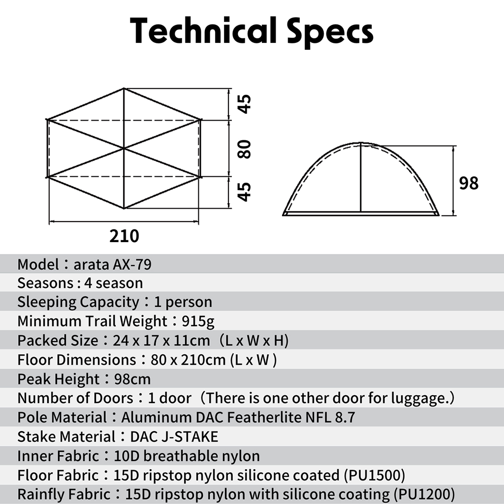 横幅210cm、奥行80cm、高さ98cm、最小重量915gと、日本のダブルウォールの山岳テントとしては最軽量クラスに仕上がっています。