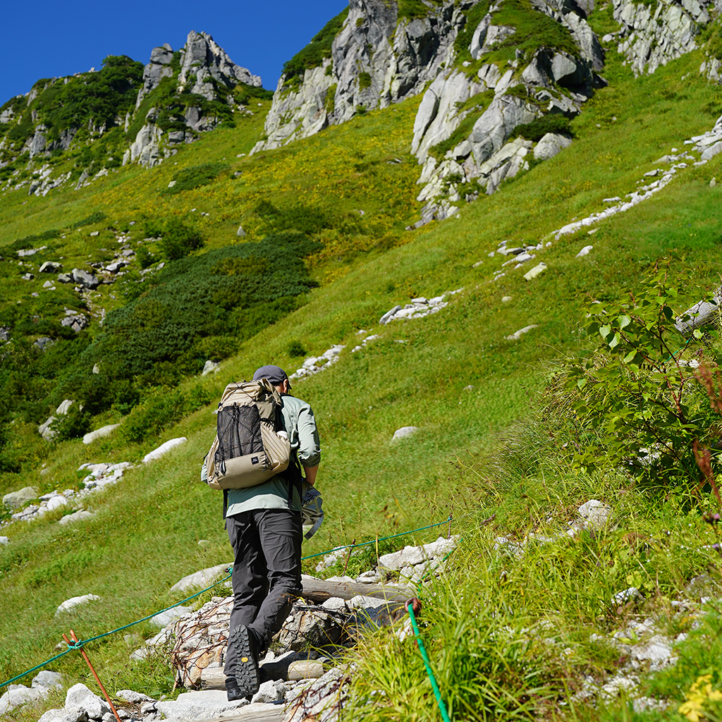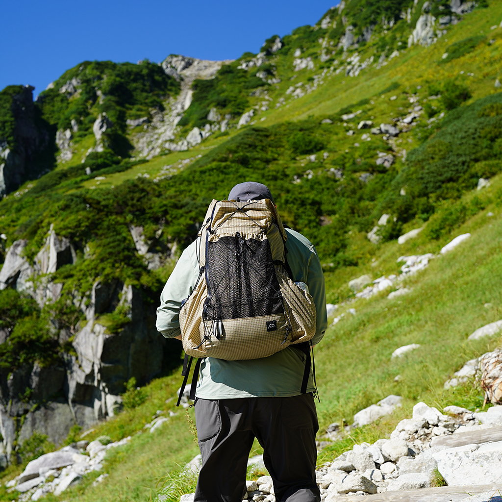 韓国のULハイキングシーンを牽引する、ソウル発のアウトドアブランドCAYL。 ユーザーからの要望も多かった荷物をスムーズに取り出せる大型バックパックが2024FWから遂にリリース! 新作『Unmun』(ウンムン)は、背面に内蔵されたシングルアルミフレームと、体の動きに合わせて寄り添う柔軟性のあるプレート、そして安心感のあるヒップベルトを備え、軽量ながらしっかりと腰に荷重を分散し、食料が多くなる長期間のハイキングでも安定して背負うことができます。 背面のフレームとヒップベルトは取り外せるので、スタイルに合わせてより軽量化することもできます。 ショルダーハーネスと背面には、しなやかで適度な厚みのある3Dエアメッシュを採用し、快適なクッション性に加え、蒸れも軽減しています。 ショルダースタビライザーを活用して、バックを身体側に引き寄せたり、逆に離して負荷のかかる場所を分散することもできます。 特徴的なフロントのダブルジッパーは、ロールトップ式の懸念点のひとつであるメイン部へのアクセスのしにくさを、デザインに落とし込みながら解決。 下方に収納した荷物も下から開けてすぐに出し入れできるので、上から順番に荷物を取り出す必要はありません。 荷造り時や山小屋、テント場では、上からジッパーを開ければどこに何があるかも一目瞭然。荷物が出し入れしやすく、パッキングも楽にしてくれます。 約45L(メイン40L、ポケット5L)という容量は、オールシーズンの小屋泊、テント泊から、ULスタイルなら長期のロングハイクにも使いやすい絶妙なサイズ。 メインスペースはロールトップ構造で、バックルを上、もしくはサイドに落として留めることができます。 またロールトップ入口はスナップボタン式なので、出し入れの時にフリースなどのウェアと干渉することもありません。 フロントにはジッパーポケットとメッシュポケット、両サイドにもポケットがあり、収納力はもちろん、整理もしやすい設計になっています。 使われているCAYL GRID生地は、210Dナイロンをベースに、超高分子量ポリエチレン(UHMWPE)を格子状に組み合わせた軽量で強靭な生地。 耐摩耗性、UV耐性に優れ、長期間の使用に適した耐久性があり、強度に加え撥水性も備えています。 ※完全防水ではありませんので、必要に応じてパックライナーやザックカバーなどで防水対策をおこなってください。 ※付属するビニール製の梱包袋がパックライナーとしてご使用いただけます。 フロントダブルジッパーによるアクセスしやすさに加え、取り外しもできるアルミフレーム、しっかりサポートしてくれるヒップベルトなど大型パックに欲しい機能を備えながらも、SMサイズで約870g(本体710g、ヒップベルト160g)と軽量に仕上がっています。 背面長に合わせて、SM、MLの2サイズ展開になります。 サイドのコンプレッションストリングを引くことで必要に応じてパックの容量を減らし、また荷物が背中側へ引き寄せられることでより安定して背負えます。 コンプレッションストリングは、上側はコンプレッション効果が高い伸縮しないタイプ、下側は収納性も重視した伸縮するタイプになっています。 ショルダーハーネスと背面、ヒップベルトには、クッション性と通気性を持つ3Dエアメッシュを採用。 チェストストラップはテンションバンドになっていて、動いている最中も柔らかにフィットします。 バックルの黄色部分はホイッスルになっています。ホイッスル部分だけ取り外しもできます。 ショルダースタビライザーを活用して、バックを身体側に引き寄せたり、逆に離して負荷のかかる場所を分散することもできます。 ヒップベルトのポケットもマチがあり十分な容量。ヒップベルトは簡単に取り外しも可能です。 スマホや行動食も余裕をもって収まります。 ロールトップなので、荷物の量に応じて容量を可変できます。 モデル:184cm / MLサイズ ロールトップ入口はスナップボタン式なので、出し入れの時にフリースなどのウェアと干渉することもありません。 荷造り時や山小屋、テント場では、上からジッパーを開ければどこに何があるかも一目瞭然。荷物が出し入れしやすく、パッキングも楽にしてくれます。 フロント上部のジッパーポケットと、下部のメッシュポケット。用途に応じて使い分けできます。 バンジーコードでコンプレッションすることで荷物の揺れを軽減します。 ロールトップ上部のバックルは、上で留める、もしくはこのようにサイドに落として留めることができます。 サイドで留めた方がより荷物が固定され安定します。 下方に収納した荷物も下からジッパーを開けてスムーズに出し入れできます。 ダブルウォールテント、冬用シュラフ、マット、インナーシュラフ、エマージェンシービビィ、レインウェア上下、ダウン上下、メリノベースレイヤー上下、グローブ、チェーンスパイク、保温ボトルなど、秋冬テント泊を想定したパッキング例。 モデル:182cm / MLサイズ