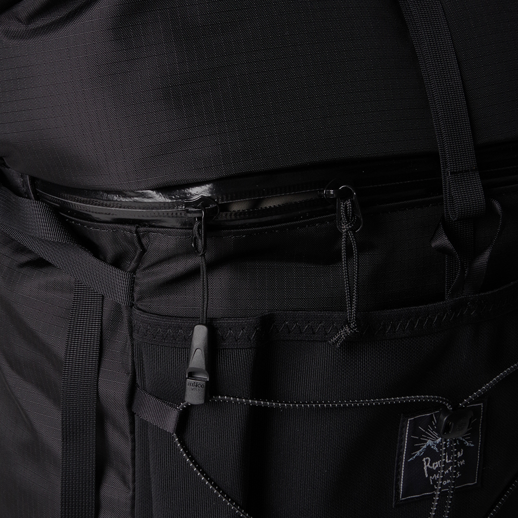 2023年のRLMW新作『Rascal』 約45Lクラスのテント泊縦走を想定したRLMW最大容量のバックパックで、開閉部はファスナー+ロールトップにすることで、容量の大幅な可変が可能です。 10-15kgのパッキングウエイトでのロングハイクや縦走を想定して、背面パッド、ハーネスのパターンや芯材を見直し、従来のRLMWバックパックよりソリッドな背負い心地。 基本的には肩加重のバックパックですが、極力重量が分散されるハーネスデザインとなっています。 また、パッキングのしやすさや使い勝手とサイズ感に徹底的に拘ったアウトポケット類は、中-上級者はもちろん、テント泊ビギナーのファーストバックパックとしても最適。 フロントの大型ストレッチメッシュポケットは大きくマチがとってあり大容量。 モデルによってはスノーシューやワカン、ショベル等を収納可能。(ポケット底部には水抜き穴) 止水ジップの小物入れ用ポケットはフルパッキング時に取り出しやすい様にあえて浅めの仕様(深さ約20cm) サイドポケットはボトル類はもちろん、シェルターやパックラフト用のパドルまで飲み込む大容量です(水抜き穴有り) ロードリフターの調整幅、フレキシブルなハーネスの取り付け角度、極力重さを感じさせないハーネスのサイズやインナーパッドの調整など、製品化まで約1年半のフィールドテストを費やし、厳冬期にも使用できる4シーズン対応のバックパックに仕上がっています。 RLMWの真骨頂でもある軽さと丈夫さの絶妙なバランス、適材適所の素材使いは流石。 カラー:Olive ファスナートップをマックスまでパッキングした状態。 S/M:45L M/L:48L ロールトップした際のシルエット。 耐摩耗性や引き裂き強度に優れるストレッチメッシュの大容量フロントポケット。 フルパッキング時でも取り出しやすい浅型のファスナーポケット(深さ約 20cm) ハイドレーション対応。中央部からホースを出せます。 500mlペットボトル2本、ナルゲン1Lボトルを余裕で飲み込むサイドポケット。 着脱可能なウエストストラップ。 同社の『Antelope』にも採用されている内部コンプレッションベルト(縦方向に圧縮可能) カラー:Black カラー:Black カラー:Olive カラー:Olive カラー:Gray カラー:Black 別売りのRascal Waist Harness Kitを装着可能