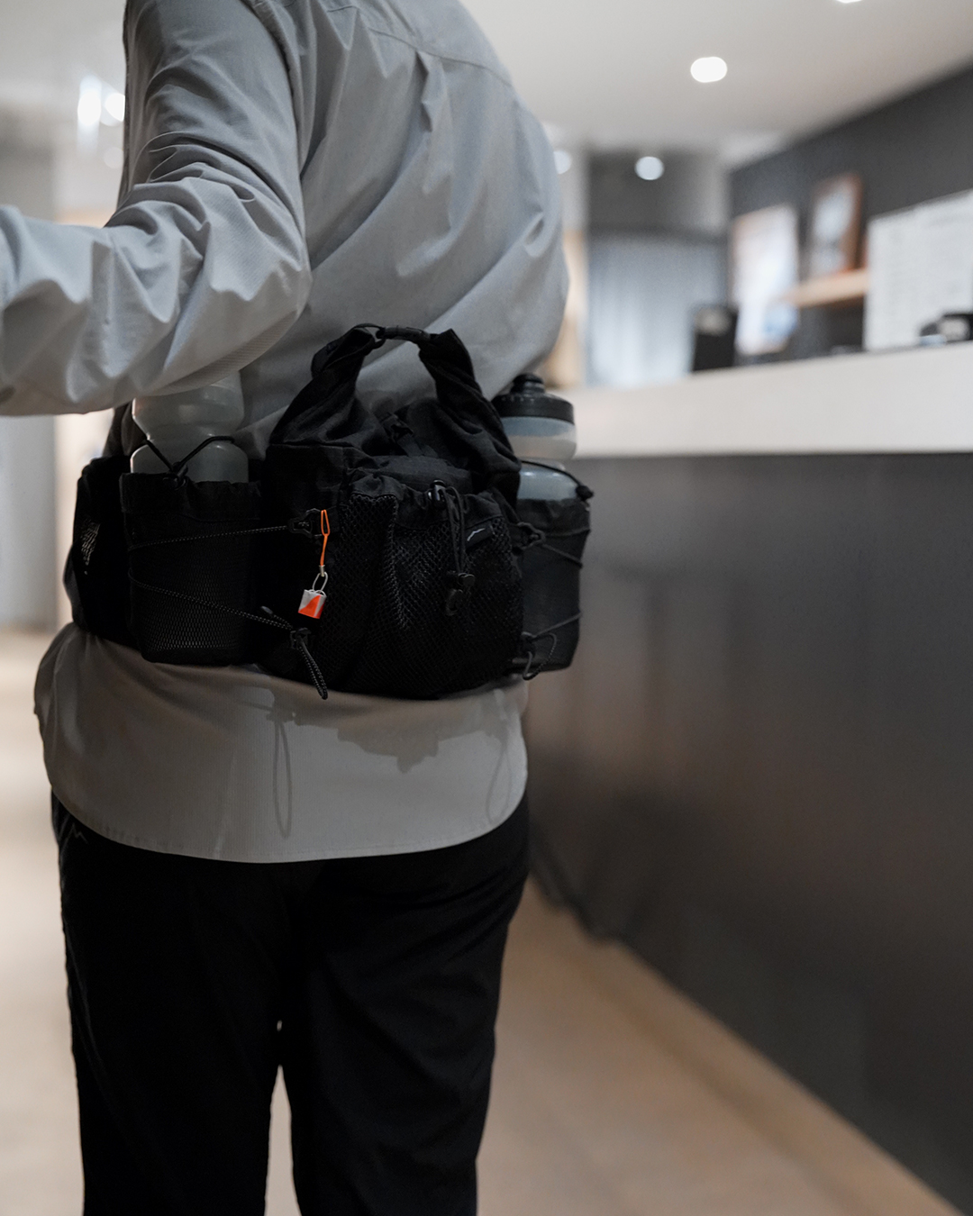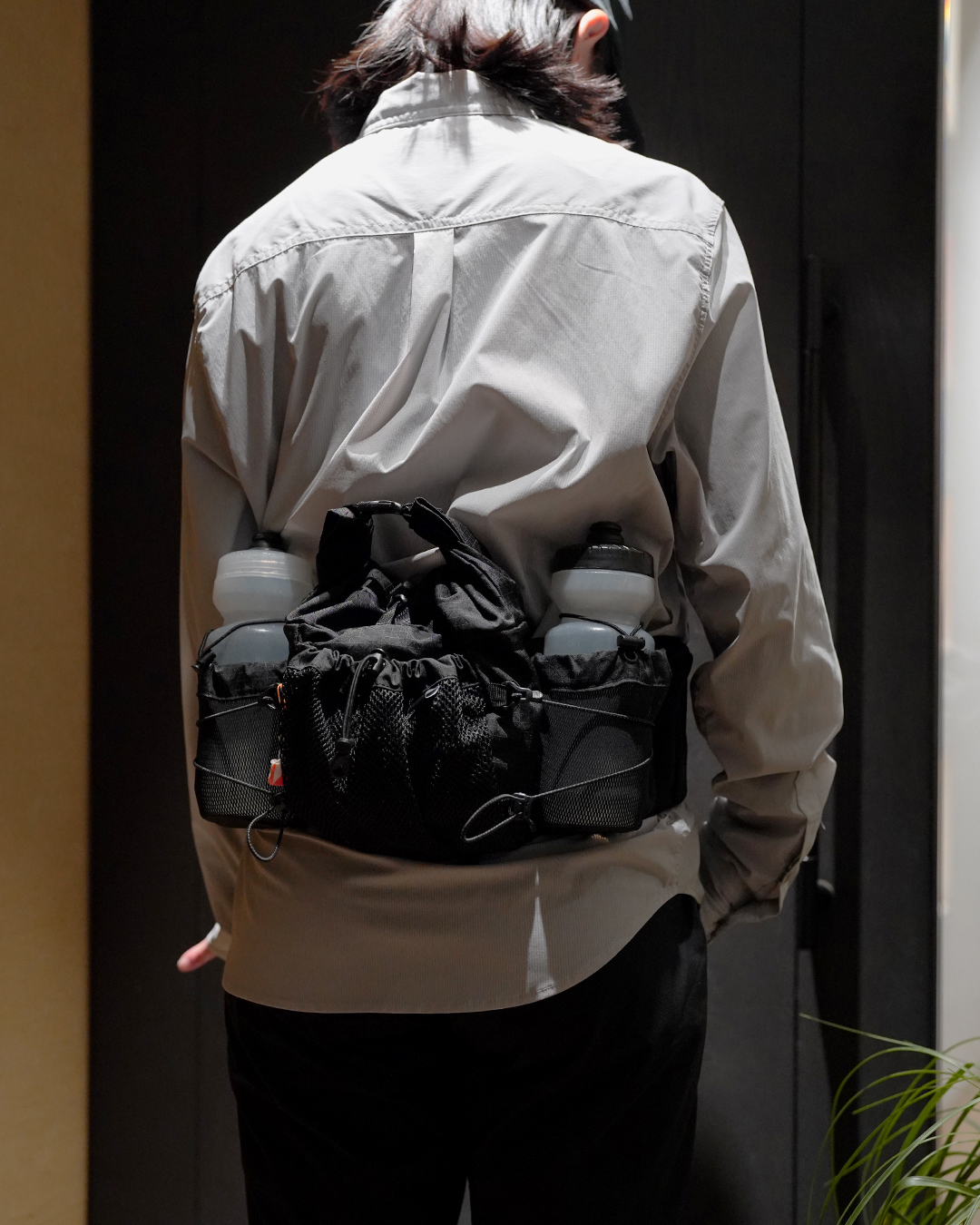 CAYL『Fanny Pack』は、暑い時期のデイハイクや自転車ライド、軽いランニングを快適にする新しいウエストパック。 ロールトップタイプのメインスペース、外側にメッシュポケット。2か所のドリンクボトルポケット、2つのファスナーポケットを備えます。 ドリンクボトルポケットは、2か所をコードで固定することで脱落を防止、また、ストリングを引いてテンションをかけることで、ボトルが身体側に近寄り、揺れにくくなります。 身体に触れる内側は通気性の高いパッドを採用し、快適性を確保しています。 リフレクター効果のあるストリングを使っているため、夜間の車からの視認性もあります。 容量はおよそ5L。行動食やウェア、コーヒーセット、カメラバッグなど。 絶妙なサイズ感と、体型に合わせて細かくフィッティングできるベルトをおかげで、ボトルを2本収納してもブレにくく、ウエストパックの軽快さを幅広いシーンで味わえます。 コンパクトに収納できるので、テント泊、小屋泊時のアタックパックとしても。 遊びの可能性を広げてくれる新たなパックをぜひお試しあれ。 ※ドリンクボトルや荷物が重すぎると、ランニング時などに揺れてしまうことがありますので、ご自身で調整しながらご活用ください。 カラー:Black カラー:Grey カラー:Beige 身体に触れる内側は通気性の高いパッドを採用しており快適。 写真はX-Pacモデル このリフレクターストリングを引いてテンションをかけることで、メインスペースとボトルポケットが身体側に引き寄せられ、揺れにくくなります。 軽めのランニングやハイキング、自転車ライドにおすすめ。 158cm Women 158cm Women 158cm Women