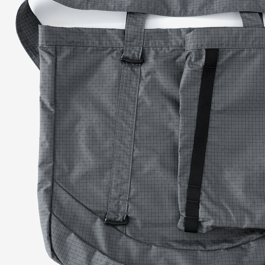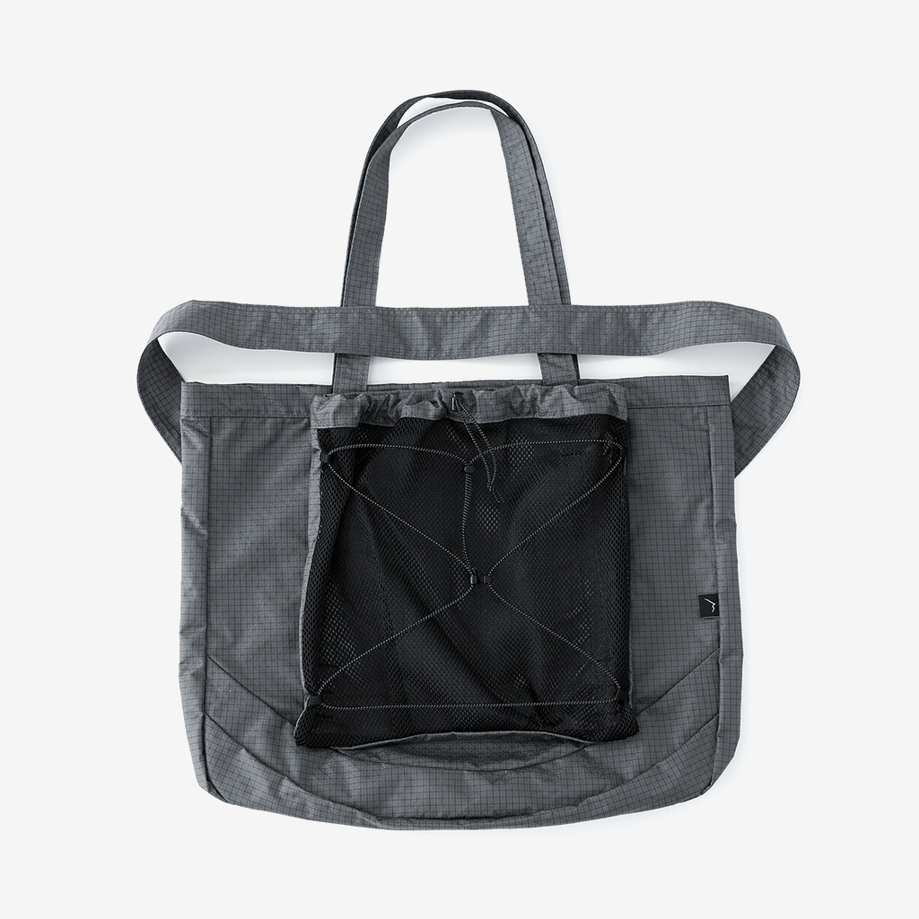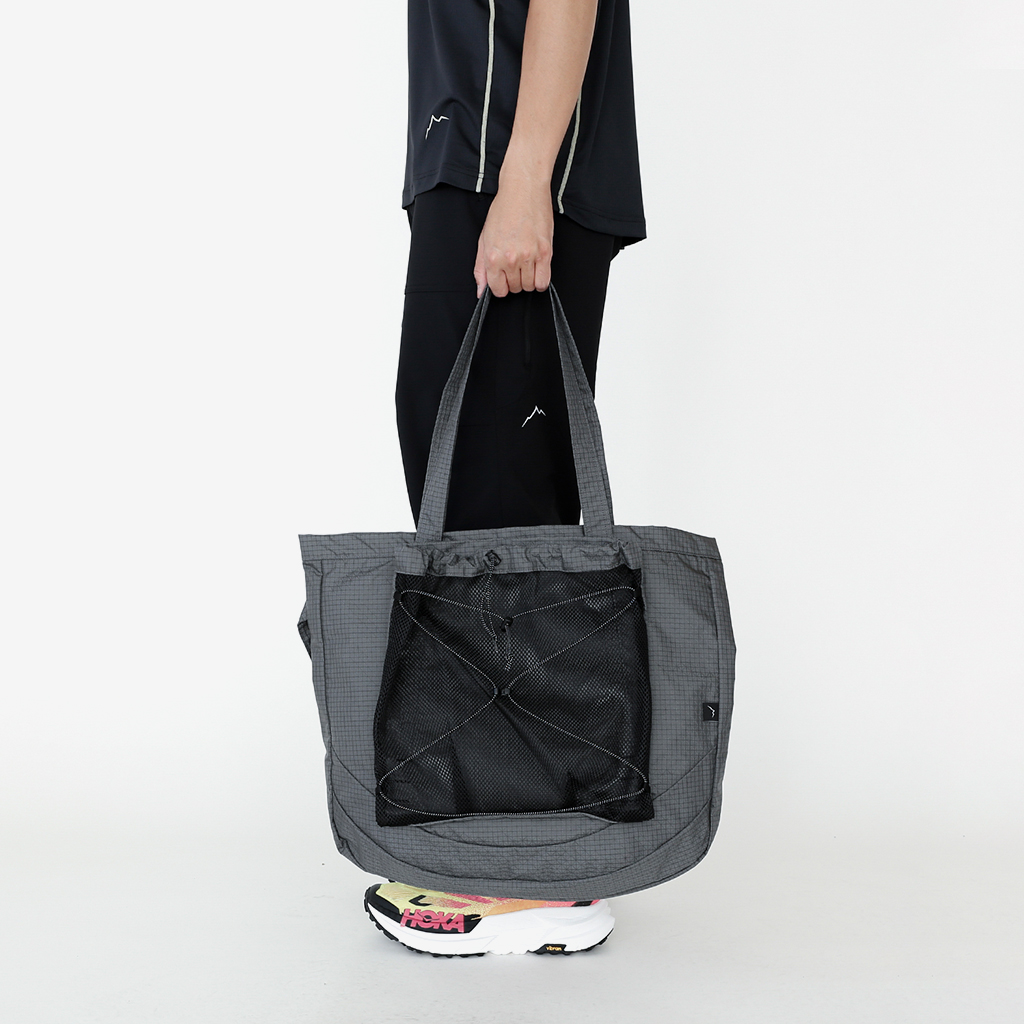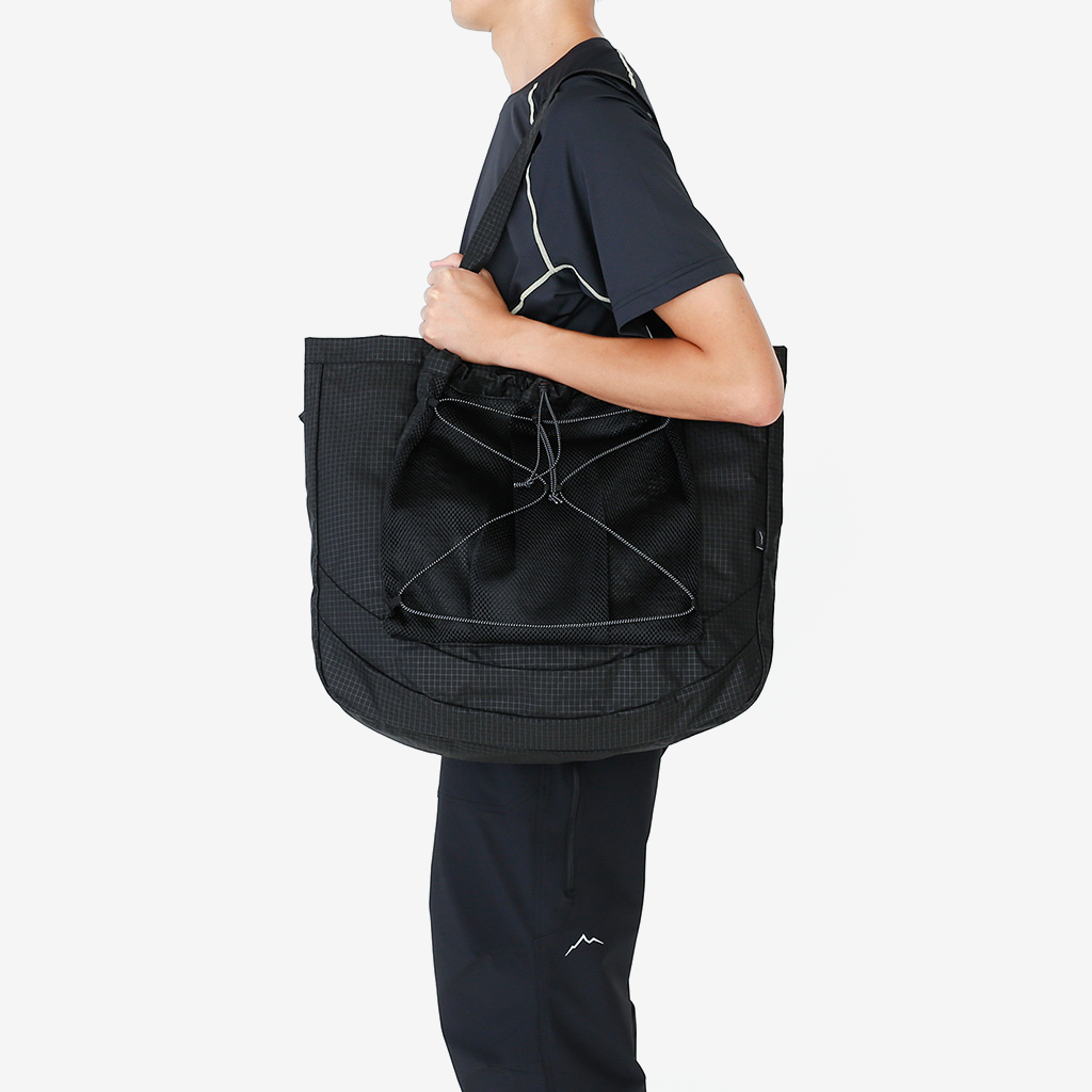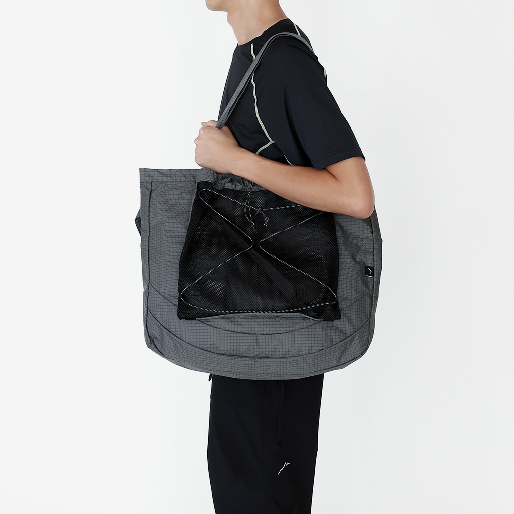 デイリーユースや旅、アクティビティの荷物用バッグにおすすめな大容量トート『Trail Tote』 一番の特徴は、2タイプのバッグが一体化している構造。フロントのポケットを取り外せば、単独でショルダーバッグとしても使えます。シューズも収納できる十分な大きさです。 トートのメインコンパートメントの内部は、2か所のストレッチメッシュポケットがあり、しっかりと仕分けできます。 入口部分も、スナップボタンとバックルでスムーズに閉じられます。 ハイクやレースに出る際に、必要なウェアやシューズを持ち運ぶ。 いつもの必携アイテムをまとめて入れて保管しておく。 軽量コンパクトなので、旅に持って行って、帰りのお土産をたくさん詰め込む。 荷物が少ないなら、小さいショルダーバッグだけで。 使い方の想像がふくらむ、楽しいトートバッグです。 カラー:B-Grid Black カラー:B-Grid Grey フロントポケットはクリップパーツで簡単に脱着できます。 メインスペース入口は、スナップボタンとバックルで留められます。 計4か所の収納スペースで、トートながらしっかり仕分けできます。