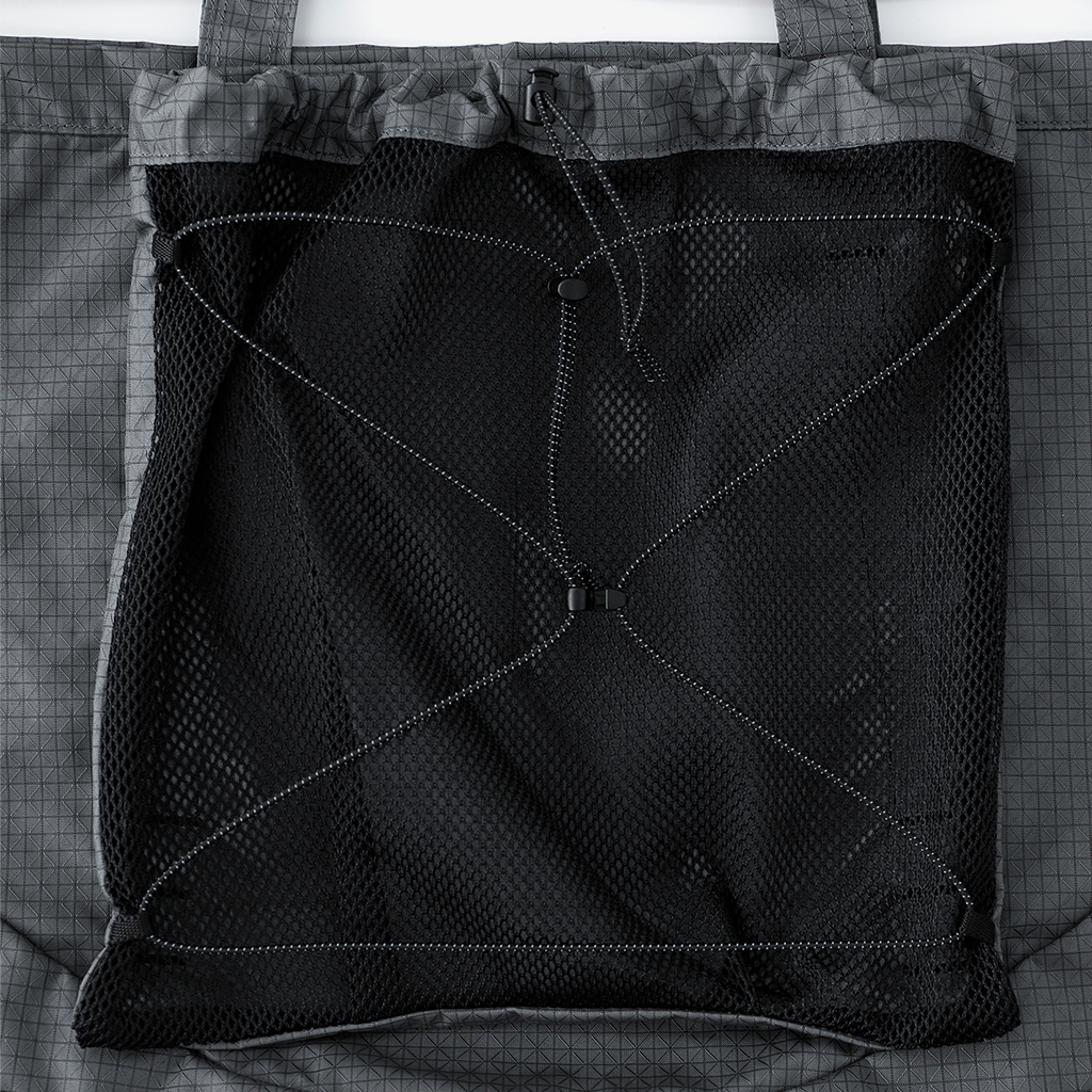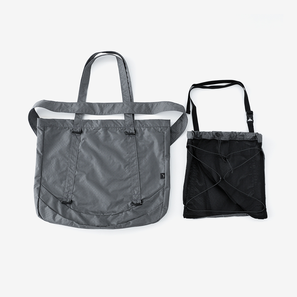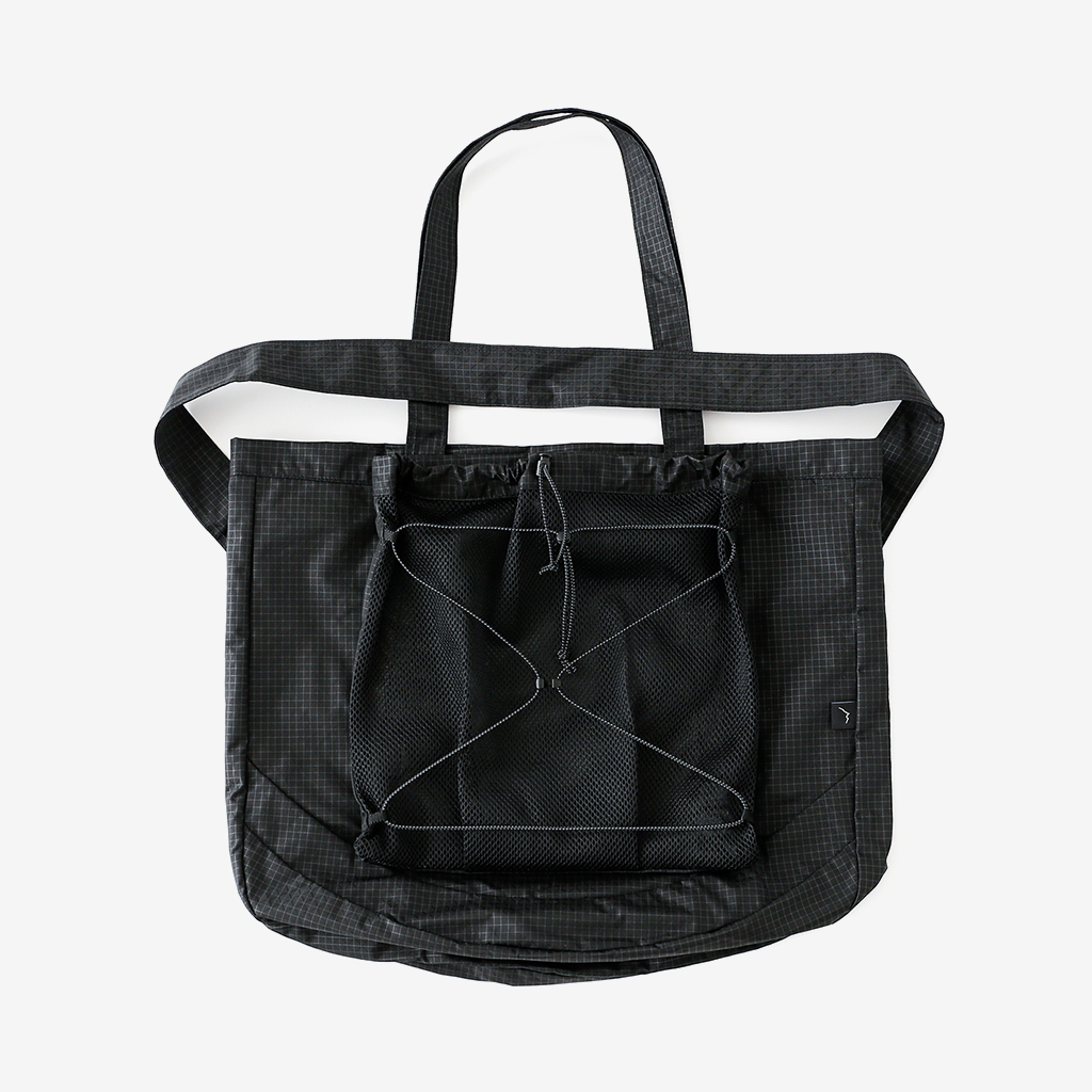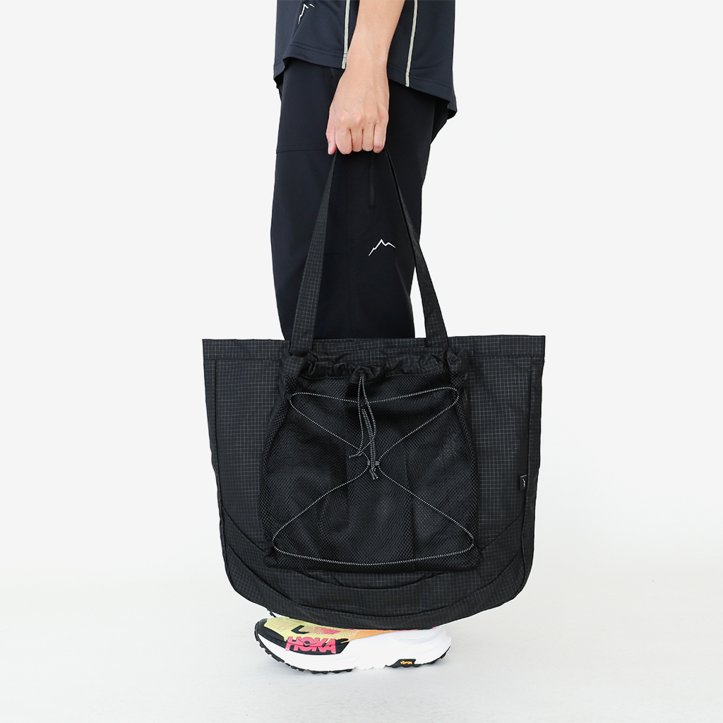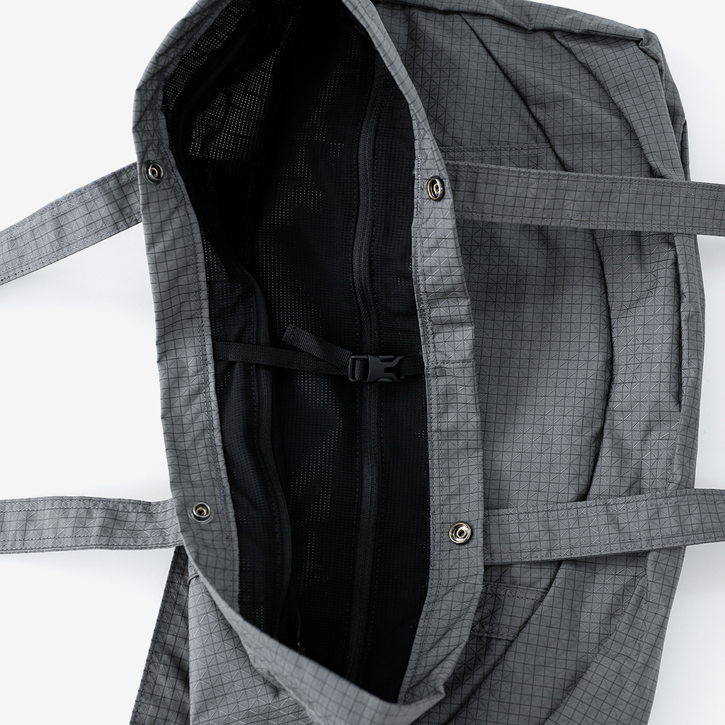 デイリーユースや旅、アクティビティの荷物用バッグにおすすめな大容量トート『Trail Tote』 一番の特徴は、2タイプのバッグが一体化している構造。フロントのポケットを取り外せば、単独でショルダーバッグとしても使えます。シューズも収納できる十分な大きさです。 トートのメインコンパートメントの内部は、2か所のストレッチメッシュポケットがあり、しっかりと仕分けできます。 入口部分も、スナップボタンとバックルでスムーズに閉じられます。 ハイクやレースに出る際に、必要なウェアやシューズを持ち運ぶ。 いつもの必携アイテムをまとめて入れて保管しておく。 軽量コンパクトなので、旅に持って行って、帰りのお土産をたくさん詰め込む。 荷物が少ないなら、小さいショルダーバッグだけで。 使い方の想像がふくらむ、楽しいトートバッグです。 カラー:B-Grid Black カラー:B-Grid Grey フロントポケットはクリップパーツで簡単に脱着できます。 メインスペース入口は、スナップボタンとバックルで留められます。 計4か所の収納スペースで、トートながらしっかり仕分けできます。