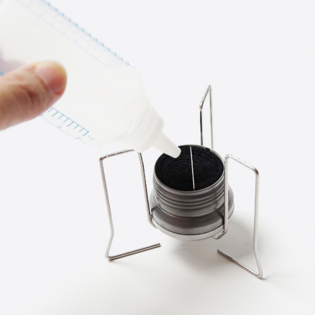 Sanpo's FunLiteGear(サンポズファンライトギア)のsanpo CF stoveは、道具しての機能はもちろんのこと、まるでオブジェのような佇まいのアルコールストーブです。 空き缶から作られたとは思えないほどの精巧な作りで、非常に燃焼効率も良いつくりです。 カーボンフェルトを使用することで、万が一転倒してしまった時の炎上を最小限に防ぎ、プレヒートの必要がなく、低温化でも使用できるといったメリットもあります。 芯の出し入れにより、簡単に火力調整ができるギミックは秀逸。弱火はより長い時間燃焼可能。最大まで引き上げれば強火になります。また、消化蓋があることで、途中で消火も可能です。 計算され尽くされた専用五徳は、燃焼効率と道具としての佇まいの美しさを両立しています。 風防と一緒に使うとより効率良く使用できます。 芯の出し入れにより、簡単に火力調整可能 消化蓋があることで途中で消火も可能 カーボンフェルトを使用 しっかり蓋も閉められます。燃料を入れたまま持ち運ぶ時には、アルコール燃料は半分程度にしZiplocなどの密閉袋に入れて持ち運んでください。 持ち運びしやすいデザイン 計算され尽くされた専用五徳 丁寧な取り扱い説明書付きなので、初めてアルコールストーブを使う方も安心です。 持ち運びもしやすいデザインで、パッキングもよりシンプルになります。 EVERNEW(エバニュー)チタンカップ400FDにも収納可能