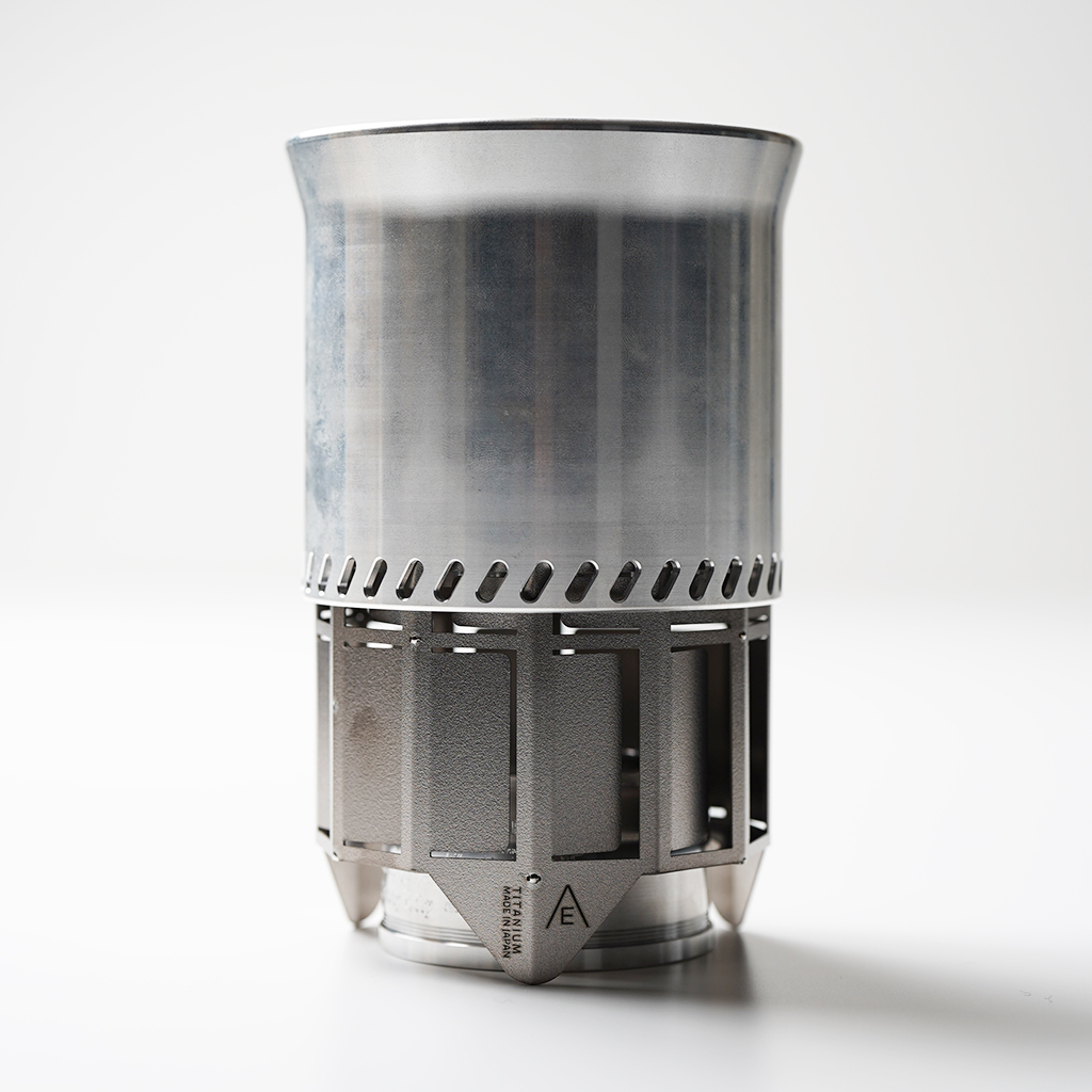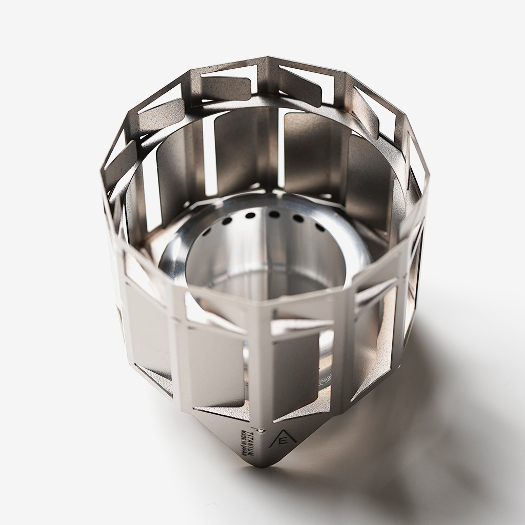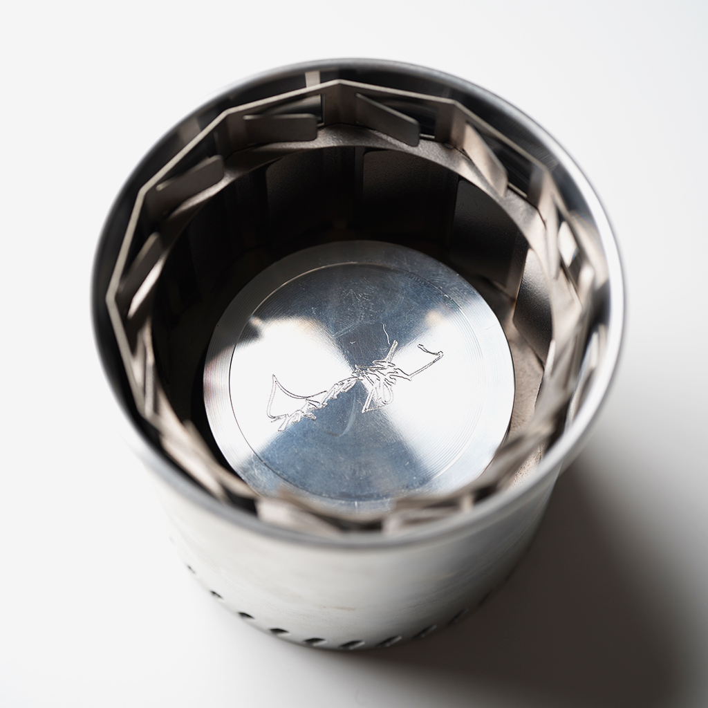 HONOAKARI社の持つ特許構造をベースに、燃焼工学を用いた綿密な計算のもと配置されたフィンが炎を旋回させ、加熱効率を高める風防『Tornado flamer』 旋回炎は燃焼に伴う熱エネルギーを放射熱にシフトし(青い炎が輝度の高い赤い炎に変化)、より一層の加熱効率化に実現、COの発生も抑制します。 組み立てもゴトクも必要なし。 地面の凹凸の影響を受けにくい3本脚、溶接により一体化した構造がガタつきを防ぎます。 同社の『Ti Mug pot 500』『MP500 Flat』にすっぽり収納できるように設計されています。 ※こちらの商品は風防本体のみで、ストーブやクッカーは付属しません。 使用イメージ。 TMR industries『L.T.Cooker』にもすっきり収まります。 『MP500 Flat』への収納例。 フィンが炎を旋回させ、加熱効率を高めます。
