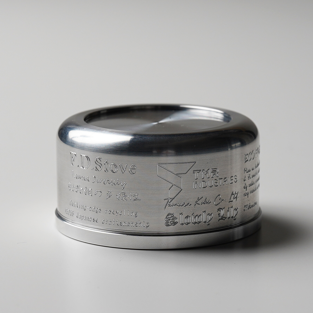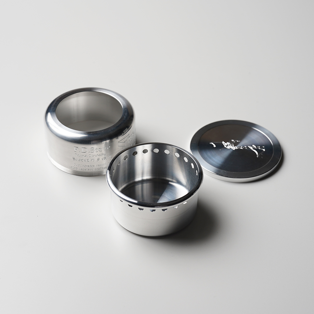 TMRによる、Eco-friendlyな植物由来エタノール燃料『FireDragon SOLID FUEL』の使用に適したオリジナルストーブ『F.D.Stove』 FireDragonは、廃棄される野菜や穀物から抽出した植物由来エタノールを原料とした、人体にも環境にも優しい新しい固形燃料。 燃料本体、燃焼ガスはほぼ無臭。エタノールなので消毒効果もあり、ナイフで簡単にカットでき、カットしたナイフでそのまま食材を扱うことができます。 また、従来の固形燃料はライターのみではなかなか着火しづらく、アルコールを少し垂らしたりと工夫が必要なケースが多いですが、FireDragonは素早く簡単に着火できます。 濡れていたり、強風下でも着火しやすく、低温下でも安定して燃焼します。 FireDragonは、燃焼すると液体化する特徴があり、不完全燃焼時には煤を含むガスが発生して、鍋底を煤だらけになってしまいます。 そこで、『F.D.Stove』は火力不足にならずに、完全燃焼させるために最適な量の新鮮な酸素を火元に取り込む、独自の二次燃焼構造で開発されました。 また、蓋を使って消火し密閉が可能で、残った燃料は再利用することができます。 ※本体を薄く仕上げるために、ネジ山が低くなっております。 ■使用方法 ・蓋を開け、内筒を取り出し、外筒を内筒にかぶせます (上下の向きにご注意ください) ・FireDragonを適量カットして入れます ・マッチやライターなどで着火します ※蓋をかぶせると途中で消火できます ※アルコール燃料も使用できます ※ストーブはとても熱くなりますので、火傷には十分ご注意ください 収納時はすっきりコンパクトに。 燃焼効率を高めるためには、同社の『W.R.Trivet』などがオススメです。