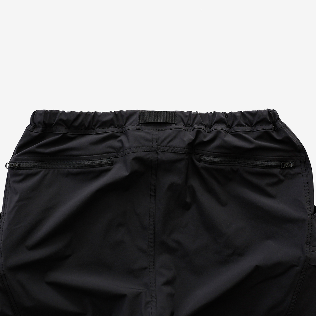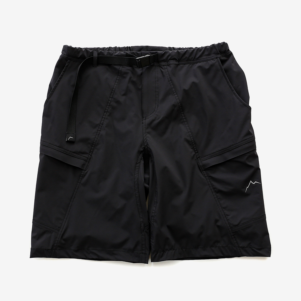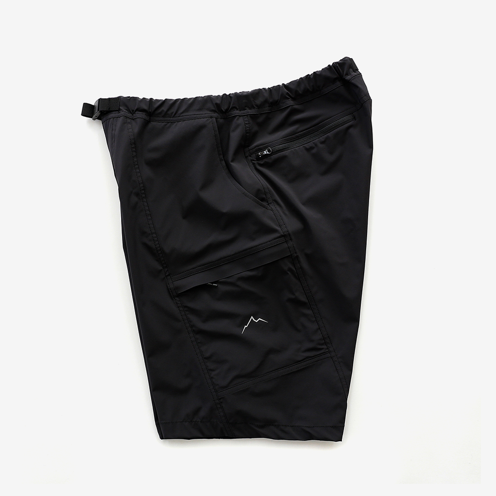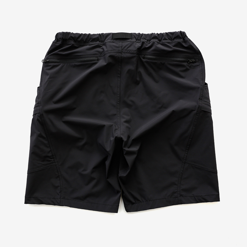 CAYL『Stretch Shell Shorts』は、通気性の良いナイロンスパン生地で、ストレッチ性抜群のハイキングショーツ。 計6か所の収納ポケットを備え、両サイドと背面は鍵や財布などの貴重品も安心して収納できるジッパーポケットになっています。 ウエストはゴムとウェビングベルトで直感的に絞り具合を調整可能。腰上で留めてアクティブに動いたり、食事などリラックスしたい時は緩めたり。 丈は長めで太すぎない品のあるシルエットのショートパンツです。 カラーは、Black、Grey、Oakの3カラー展開です。 背面。 モデル:184cm/Lサイズ