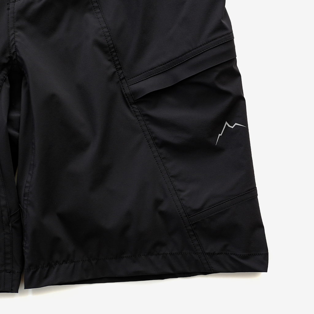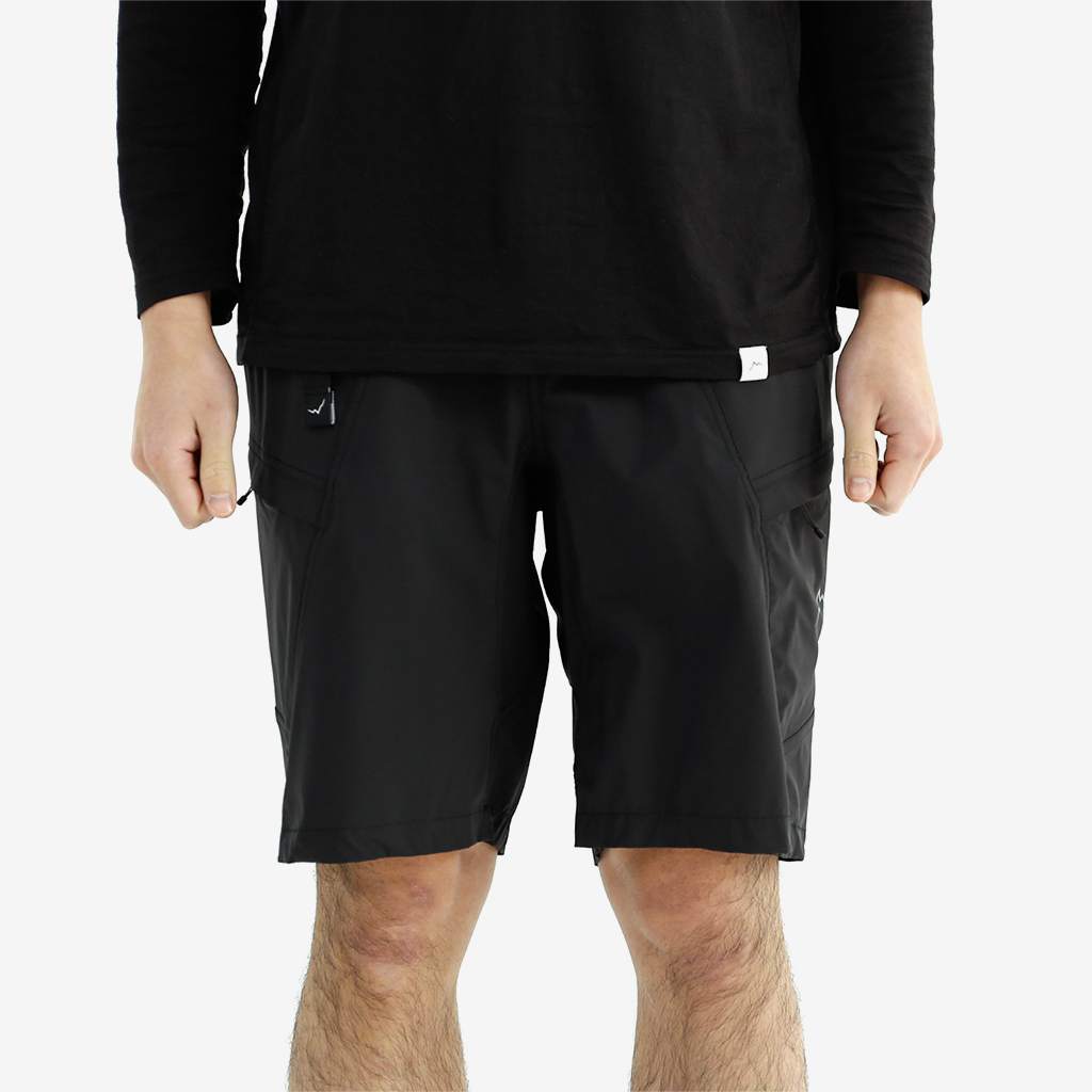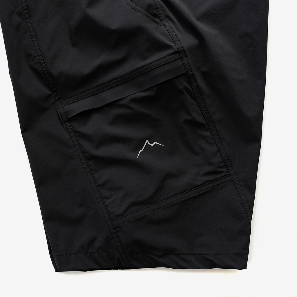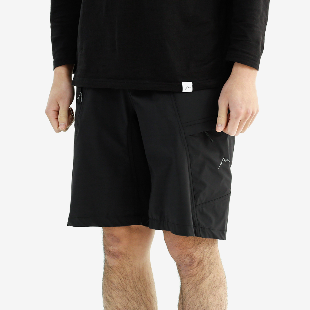 CAYL『Stretch Shell Shorts』は、通気性の良いナイロンスパン生地で、ストレッチ性抜群のハイキングショーツ。 計6か所の収納ポケットを備え、両サイドと背面は鍵や財布などの貴重品も安心して収納できるジッパーポケットになっています。 ウエストはゴムとウェビングベルトで直感的に絞り具合を調整可能。腰上で留めてアクティブに動いたり、食事などリラックスしたい時は緩めたり。 丈は長めで太すぎない品のあるシルエットのショートパンツです。 カラーは、Black、Grey、Oakの3カラー展開です。 背面。 モデル:184cm/Lサイズ