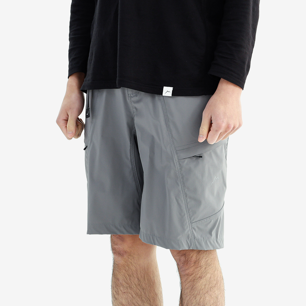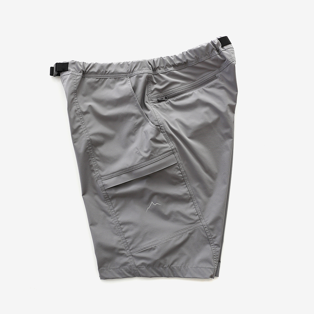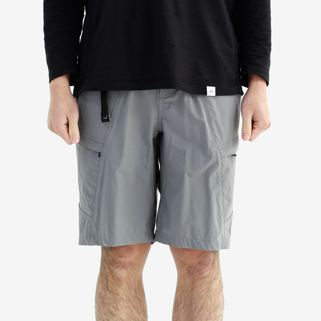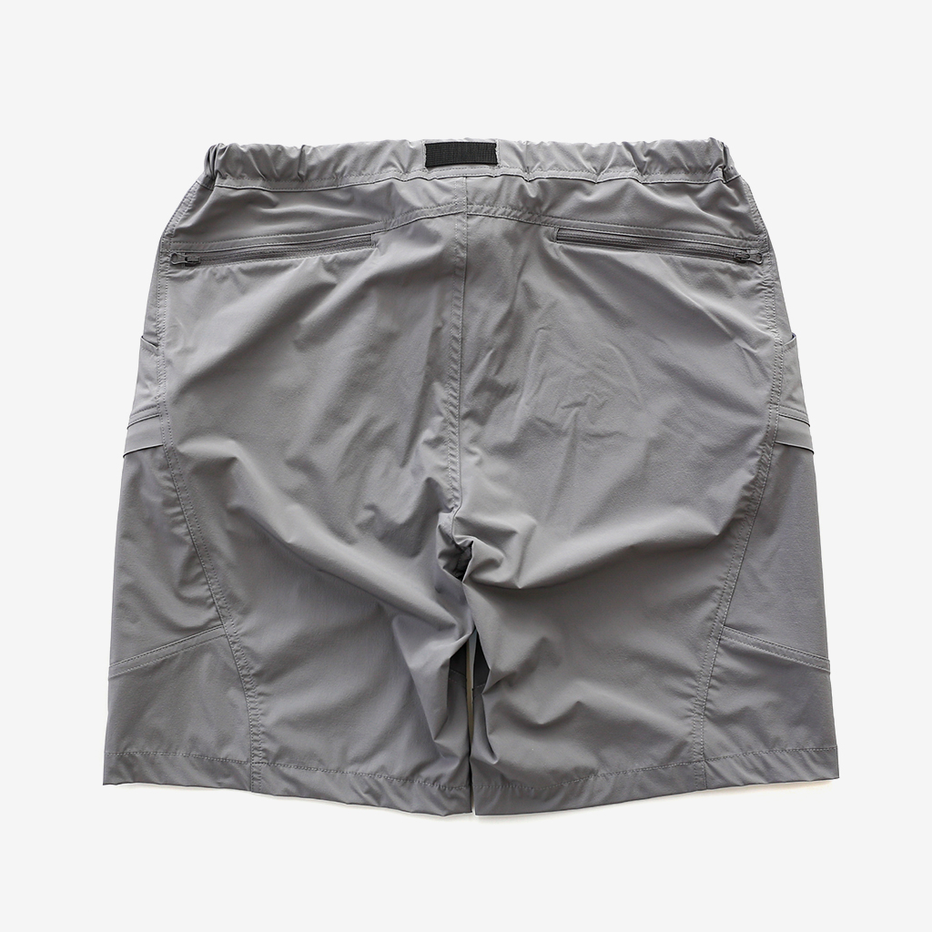 CAYL『Stretch Shell Shorts』は、通気性の良いナイロンスパン生地で、ストレッチ性抜群のハイキングショーツ。 計6か所の収納ポケットを備え、両サイドと背面は鍵や財布などの貴重品も安心して収納できるジッパーポケットになっています。 ウエストはゴムとウェビングベルトで直感的に絞り具合を調整可能。腰上で留めてアクティブに動いたり、食事などリラックスしたい時は緩めたり。 丈は長めで太すぎない品のあるシルエットのショートパンツです。 カラーは、Black、Grey、Oakの3カラー展開です。 背面。 モデル:184cm/Lサイズ