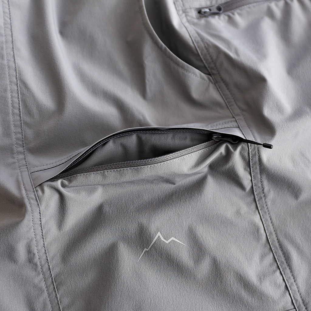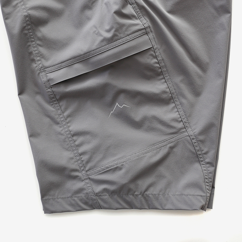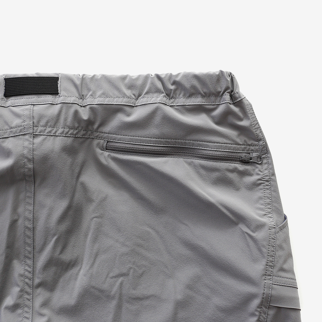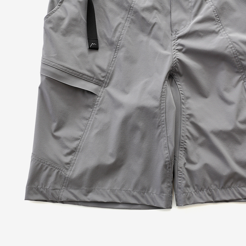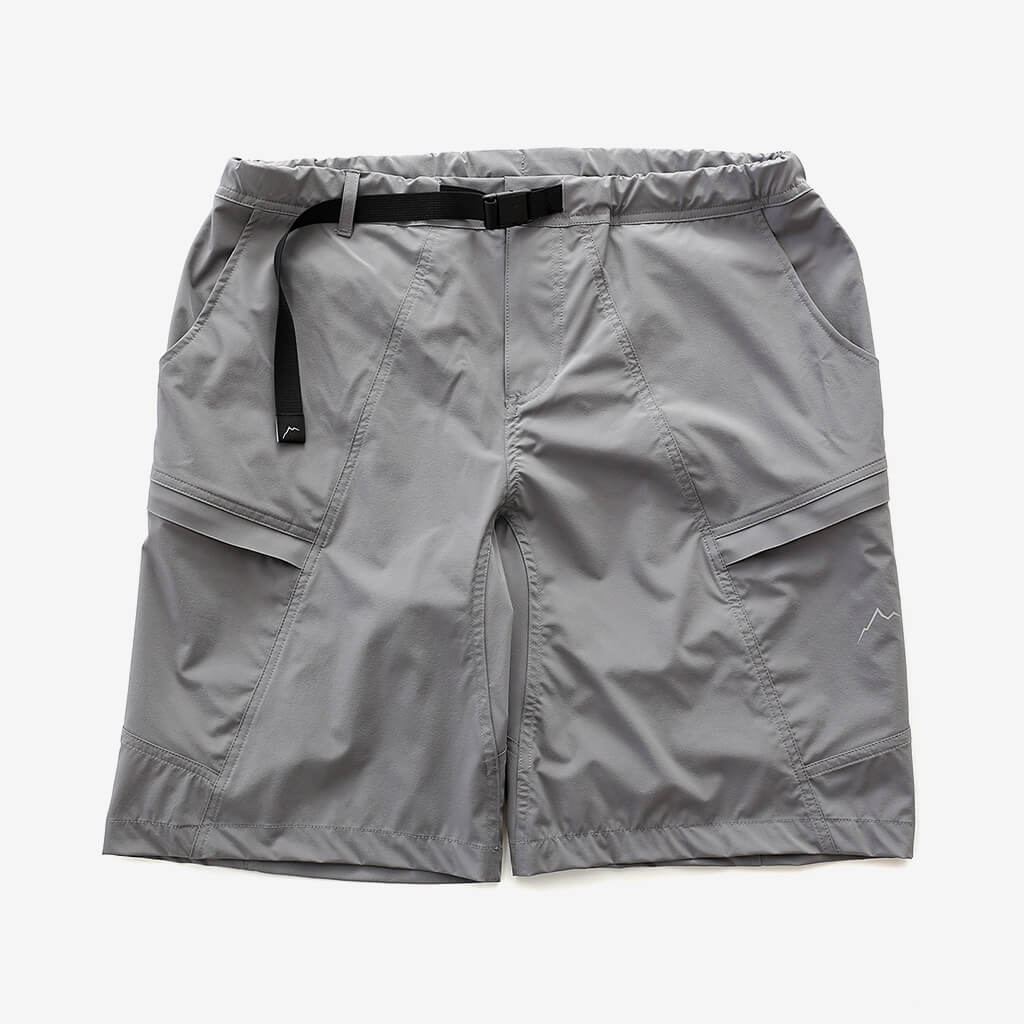 CAYL『Stretch Shell Shorts』は、通気性の良いナイロンスパン生地で、ストレッチ性抜群のハイキングショーツ。 計6か所の収納ポケットを備え、両サイドと背面は鍵や財布などの貴重品も安心して収納できるジッパーポケットになっています。 ウエストはゴムとウェビングベルトで直感的に絞り具合を調整可能。腰上で留めてアクティブに動いたり、食事などリラックスしたい時は緩めたり。 丈は長めで太すぎない品のあるシルエットのショートパンツです。 カラーは、Black、Grey、Oakの3カラー展開です。 背面。 モデル:184cm/Lサイズ