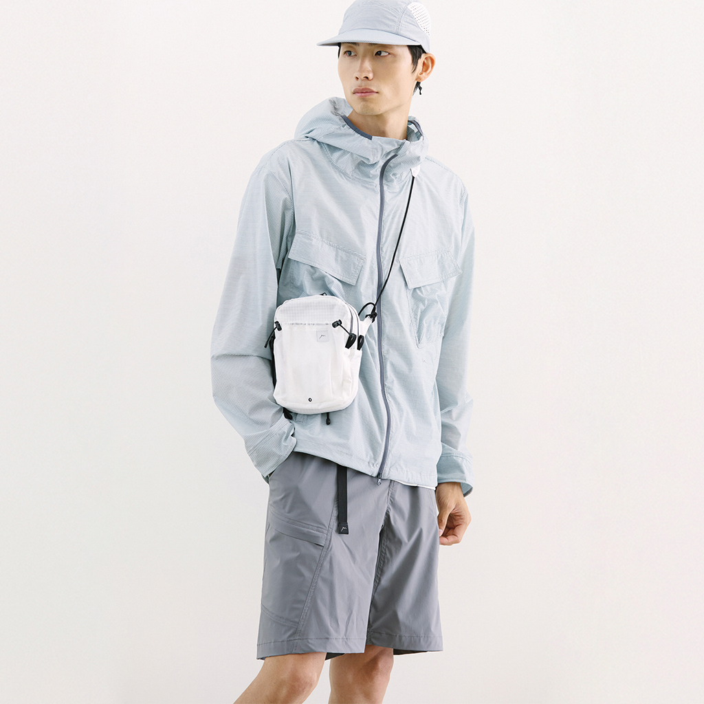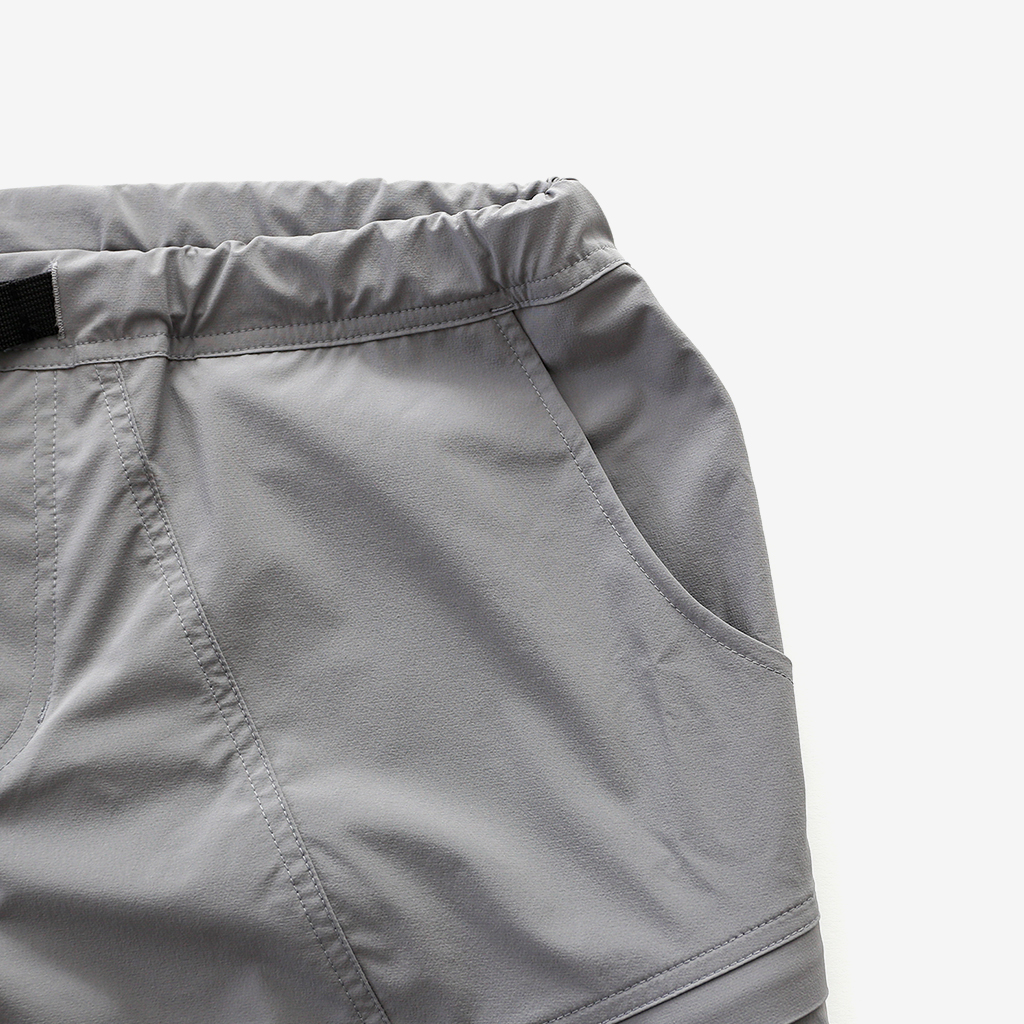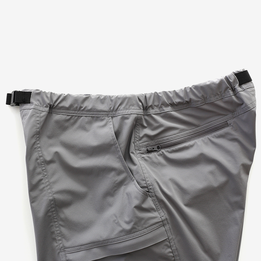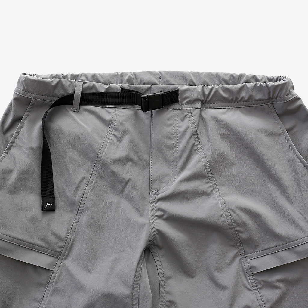 CAYL『Stretch Shell Shorts』は、通気性の良いナイロンスパン生地で、ストレッチ性抜群のハイキングショーツ。 計6か所の収納ポケットを備え、両サイドと背面は鍵や財布などの貴重品も安心して収納できるジッパーポケットになっています。 ウエストはゴムとウェビングベルトで直感的に絞り具合を調整可能。腰上で留めてアクティブに動いたり、食事などリラックスしたい時は緩めたり。 丈は長めで太すぎない品のあるシルエットのショートパンツです。 カラーは、Black、Grey、Oakの3カラー展開です。 背面。 モデル:184cm/Lサイズ