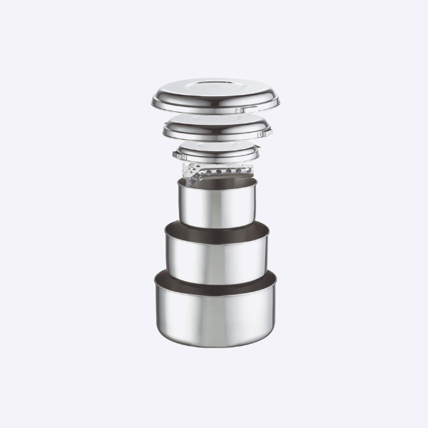 3〜4人のグループに対応できる1L、2L、3Lのポットのセットです。 蓋がプレートにもなります。 丈夫なステンレス製なのでメンテナンスフリーで長く使用できます。 収納袋付き。
