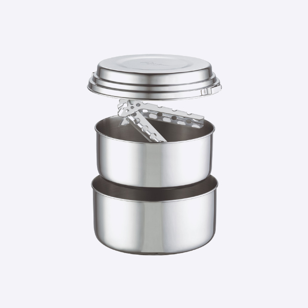 2〜3人のグループに対応できる2Lと1.5Lのポットのセットです。 蓋がプレートになります。 丈夫なステンレス製なのでメンテナンスフリーで長く使用できます。 収納袋付き。