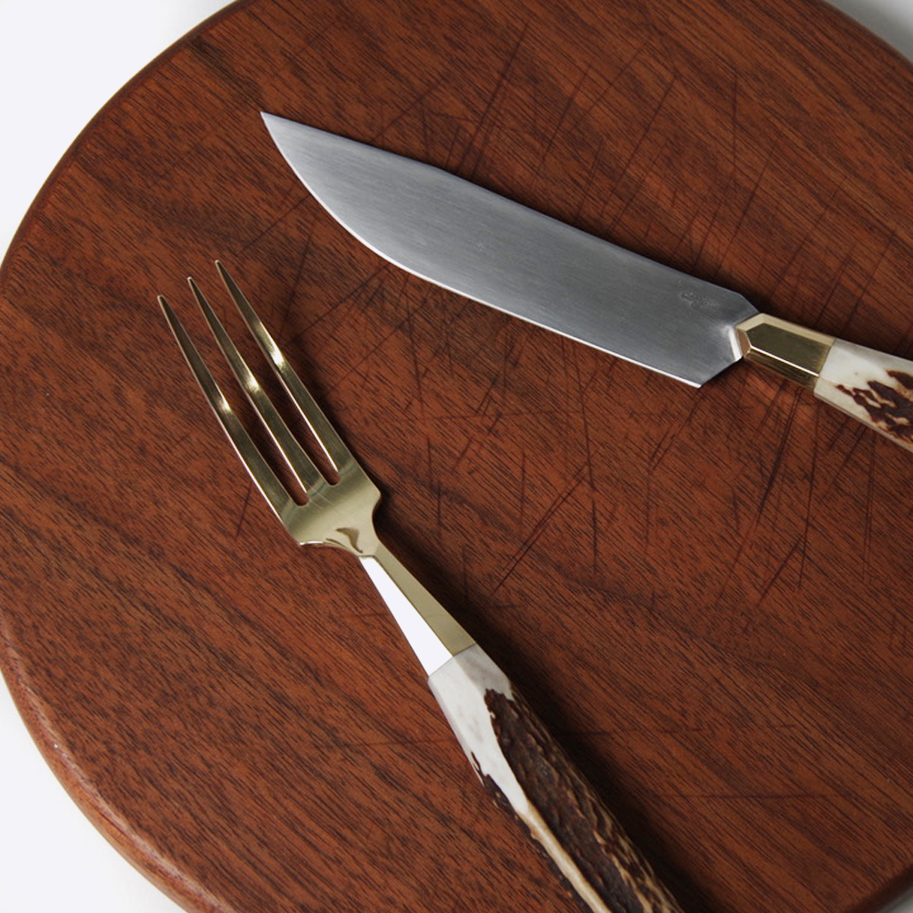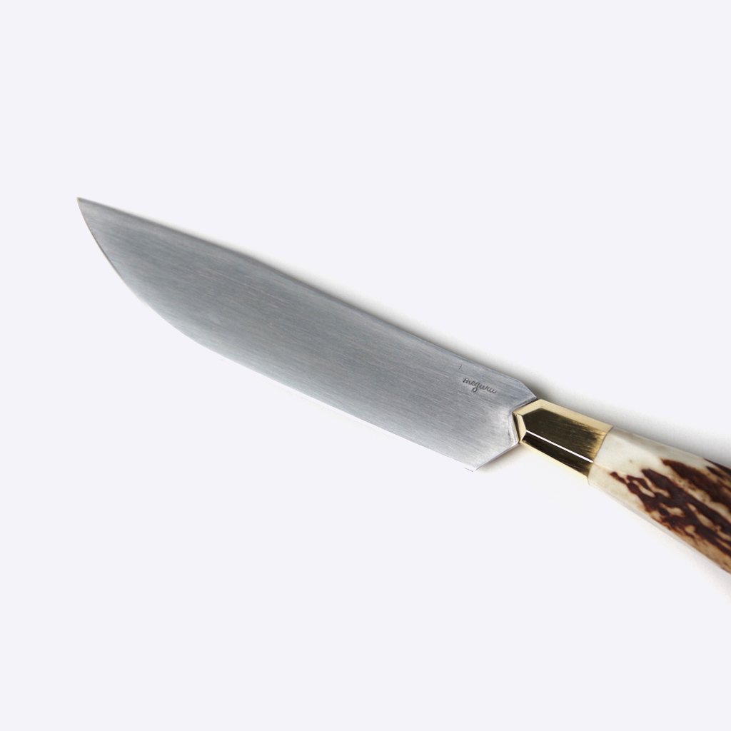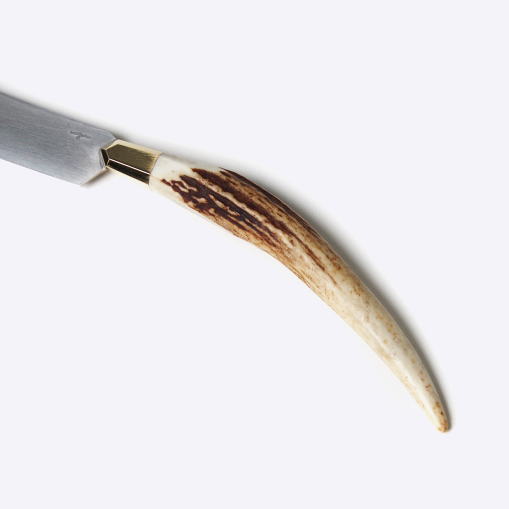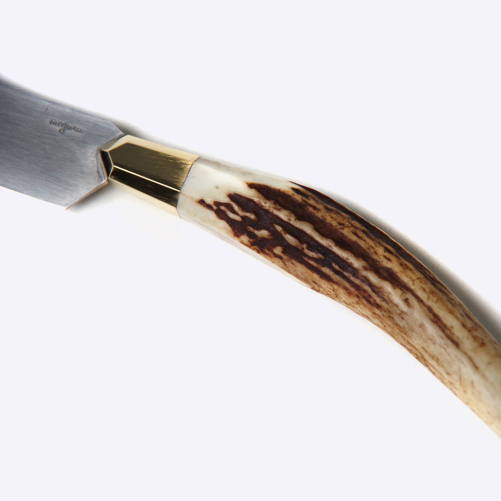 鹿の角を柄の素材としたステーキナイフ。 鹿の角を握り、どの角度を活かすのが持ちやすいのか、一つ一つ丁寧に確認しながら製作していきます。 自然のものなので一つとして同じ形のものはありません。 授かった野生の命、その美しさをを余すことなく活かす。 自身が作り手となる必然性と真摯に向き合う。 【meguru】の作品はその謙虚な姿勢と、野生の素材が持つ手触り、不思議な魅力に満ち溢れています。 【meguru】 合田大智 / Daichi Goda 滋賀で狩猟や養蜂を行いながら、身の回りにある素材や、自分で獲った素材を使ってものづくりを始める。 2017年より、狩猟、養蜂、ものづくりの活動名を meguru とし、現在、新潟へ移住し活動中。 左:鹿角スプーン 中:鹿角フォーク 右:鹿角ステーキナイフ