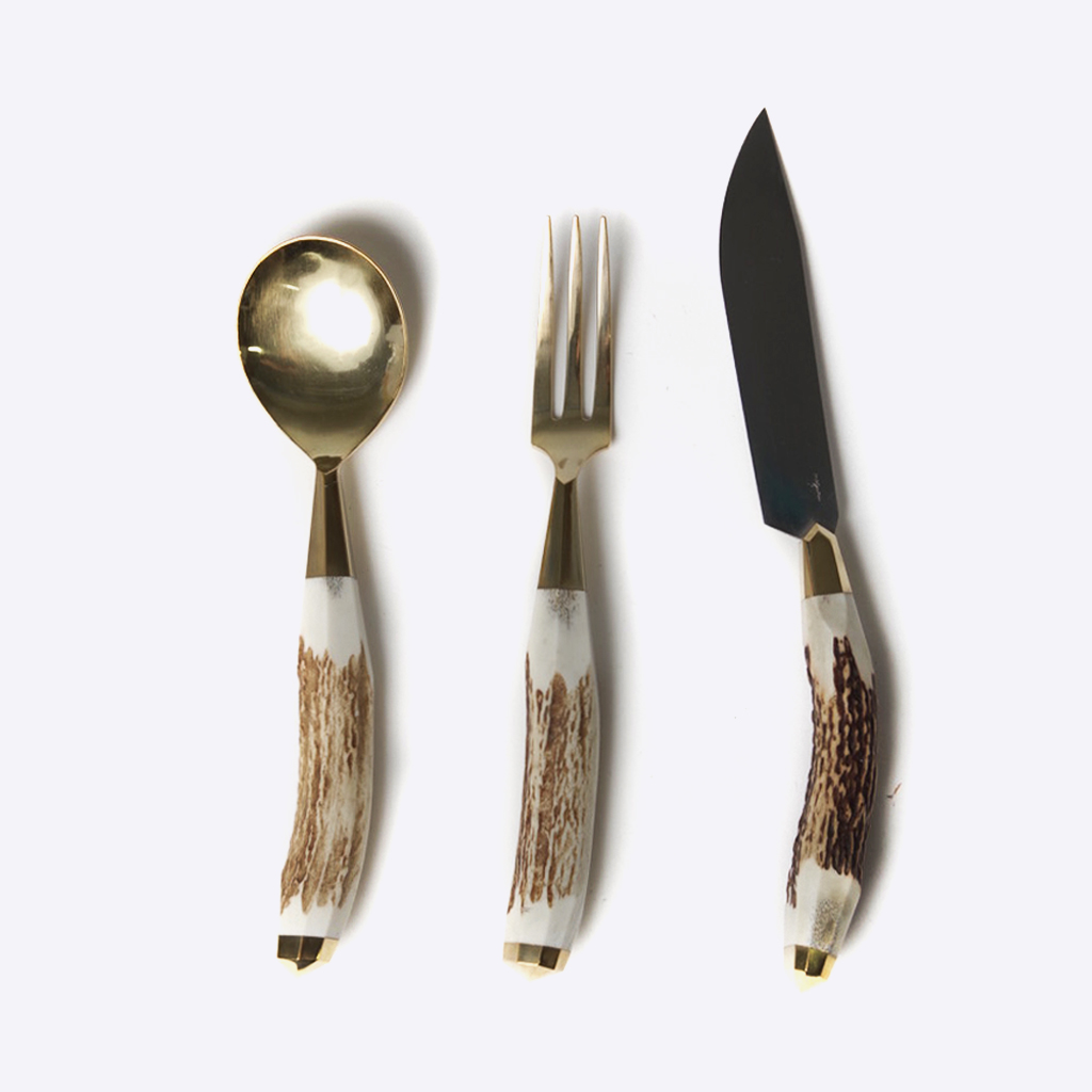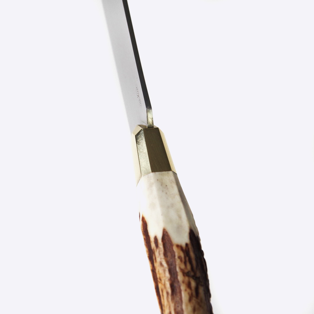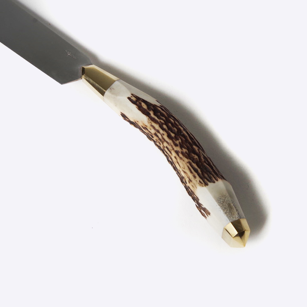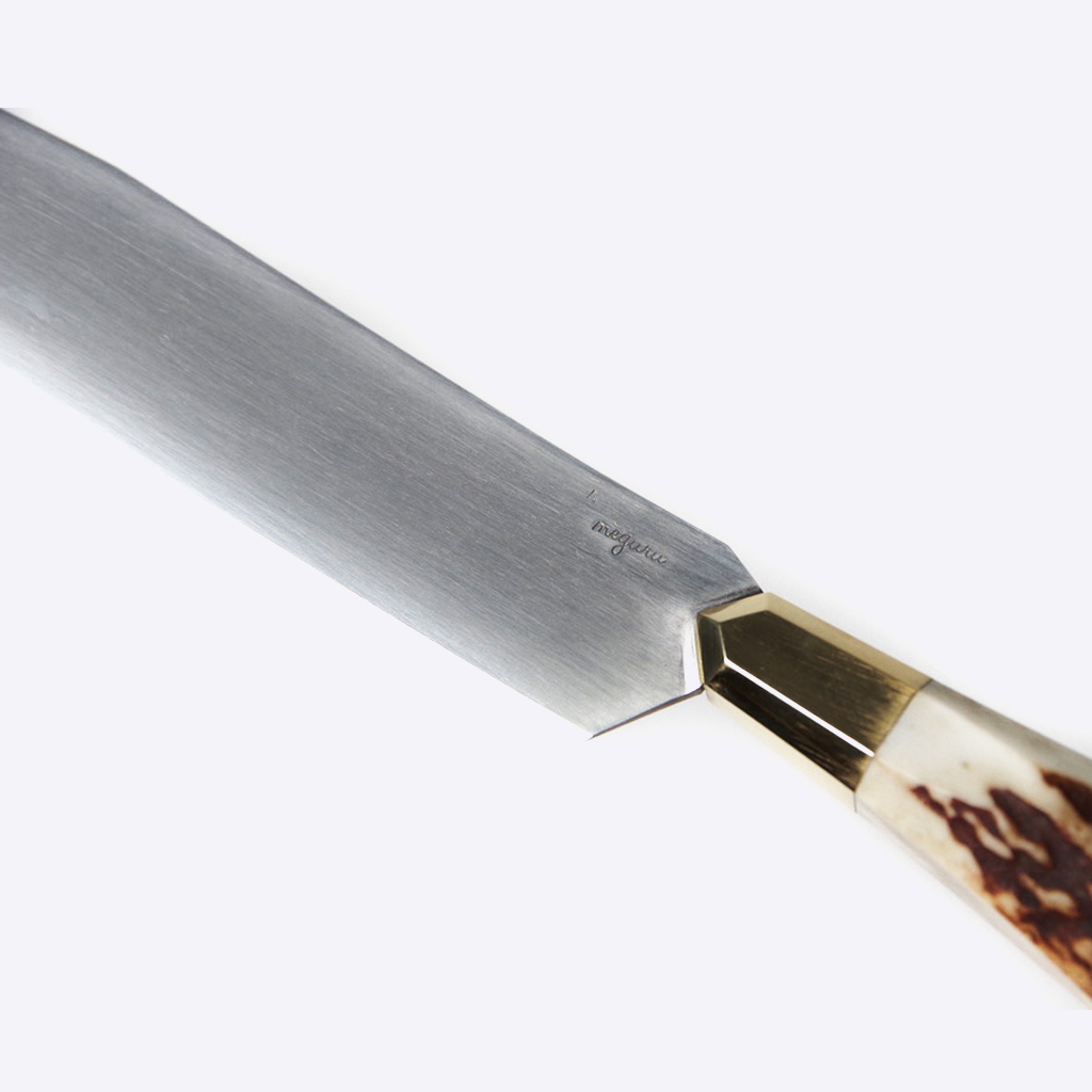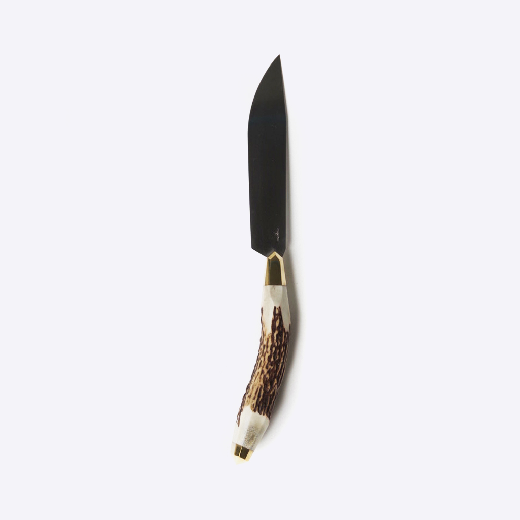 鹿の角を柄の素材としたステーキナイフ。 鹿の角を握り、どの角度を活かすのが持ちやすいのか、一つ一つ丁寧に確認しながら製作していきます。 自然のものなので一つとして同じ形のものはありません。 授かった野生の命、その美しさをを余すことなく活かす。 自身が作り手となる必然性と真摯に向き合う。 【meguru】の作品はその謙虚な姿勢と、野生の素材が持つ手触り、不思議な魅力に満ち溢れています。 【meguru】 合田大智 / Daichi Goda 滋賀で狩猟や養蜂を行いながら、身の回りにある素材や、自分で獲った素材を使ってものづくりを始める。 2017年より、狩猟、養蜂、ものづくりの活動名を meguru とし、現在、新潟へ移住し活動中。 左:鹿角スプーン 中:鹿角フォーク 右:鹿角ステーキナイフ