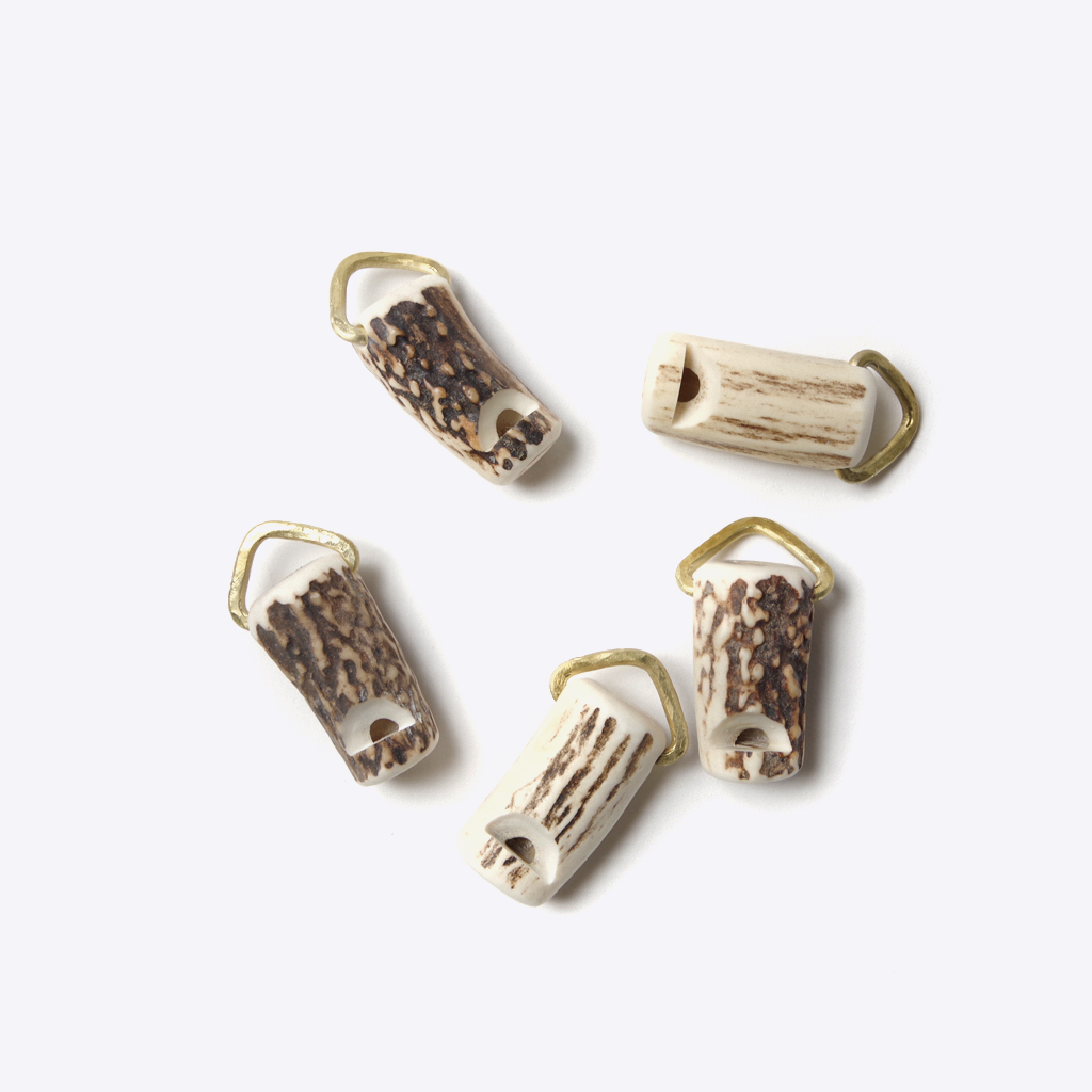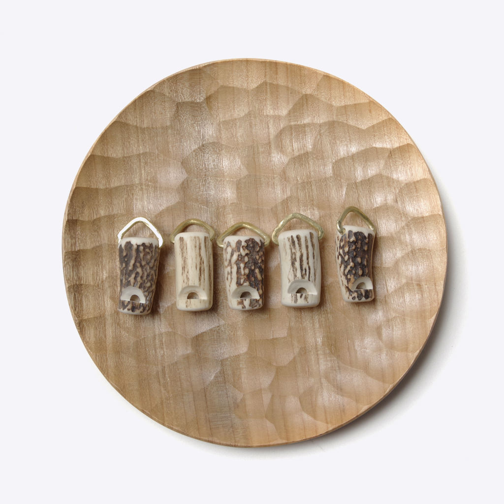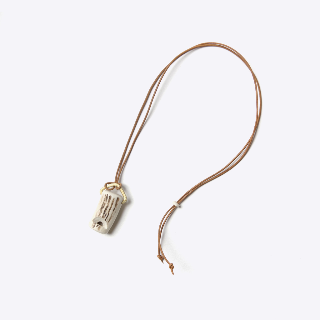 北海道の北部、中川町にある小さな工房で山ア哲平氏がハンドメイドで製作する【deer whistles】 北海道に生息する蝦夷鹿の角を使った笛は、ひとつひとつ形や音に個性があり、口に当てるととてもしっくりきます。 心地よく鳴り響くので、山に入る人は鳴らしながら歩けば、熊よけや自分の居場所を知らせるのに役に立ちます。 犬を飼われている方は少し訓練することで、「犬笛」として愛犬の呼んだりすることもできます。 古来より鹿の角はお守りとしても重宝されてきました。 バッグにぶら下げたり、付属するレザーコードでネックレスの様に首からさげても。 ハイキングはもちろん、日常や旅先での防犯、お守りとして、大切な人へ。 ※自然物を使用しているため、サイズや形状、模様、鳴り方に個体差があります。予めご了承ください。