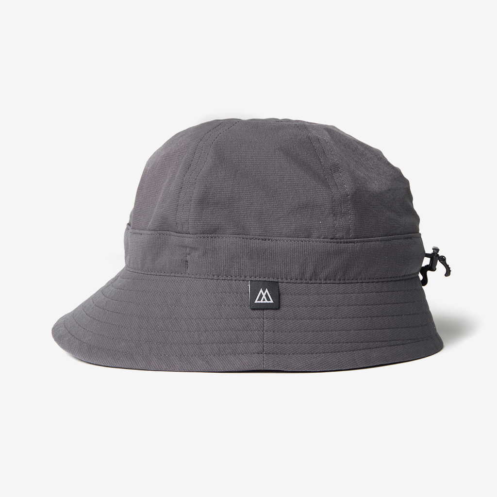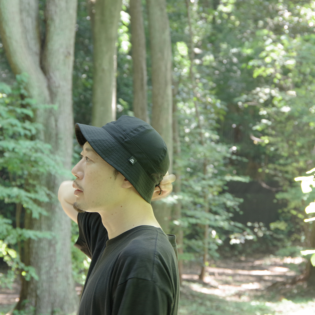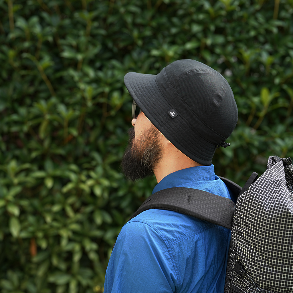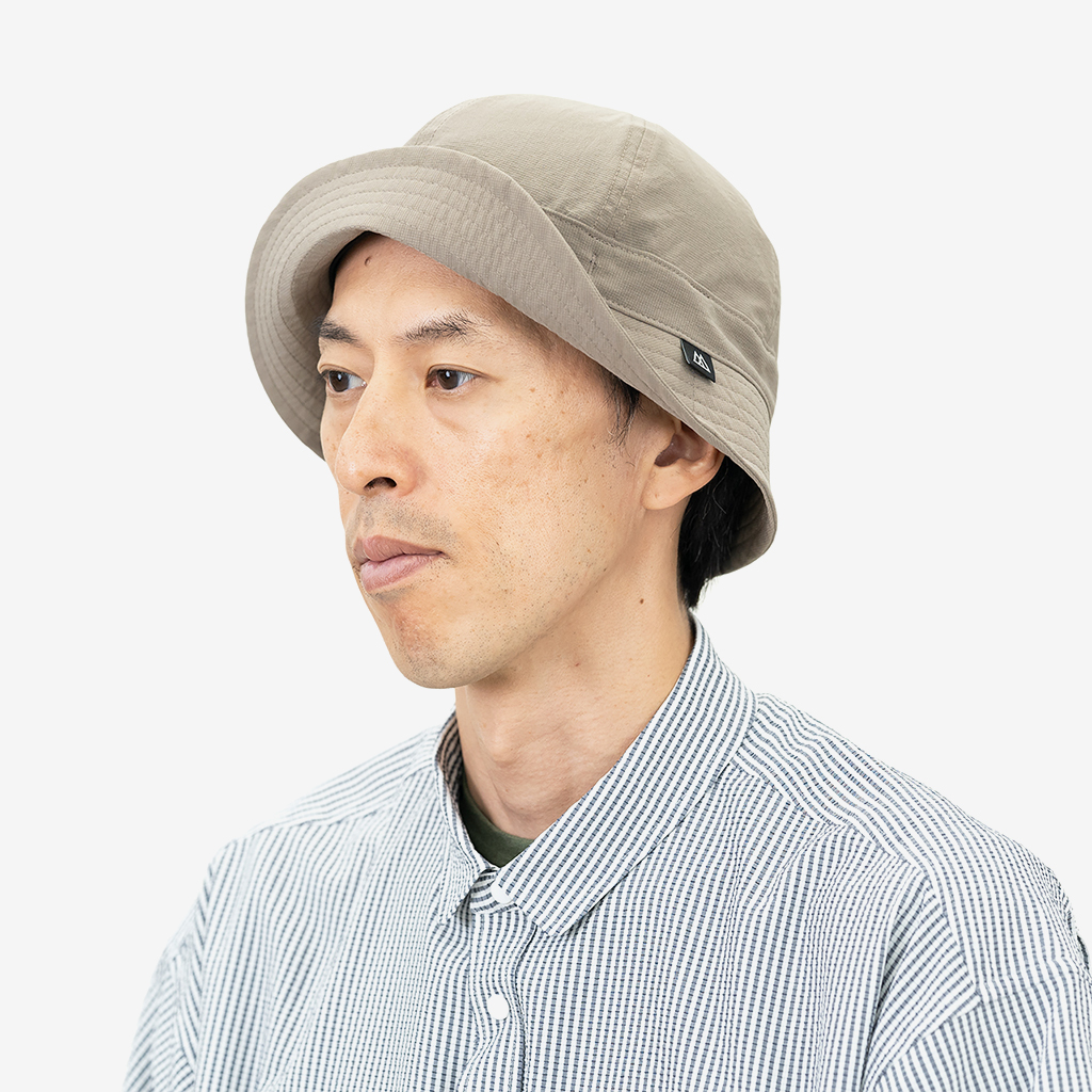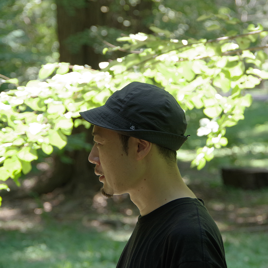 『Nicetime Mountain Gallery』の5周年を記念し、RIDGE MOUNTAIN GEARとコラボレーションしたスペシャルアイテム。 RIDGE MOUNTAIN GEARの代表的なアイテムのひとつ『Enough Hat』 代表の黒澤さんが、夏場の高地の稜線歩きなどで、キャップでは耳が丸出しになって日焼けして困っていたことから製作されました。 一番の特徴はブリムの形状。通常だと平均的に開いているブリムを、前、横、後ろそれぞれで開き具合を変えています。 前側はまるでキャップのヒサシのようなカーブを描いた形状に、横は耳を覆うギリギリの開き具合。後もあまり開きすぎず風の影響を受けないよう短めに設定しています。 シチュエーションや好みに応じて、形や被り方をアレンジできる、とても面白いハットです。 この名作を、より活動量の多いシチュエーションに適した素材で作りたい。黒澤さんにご提案したところ、さっそく試作品を作っていただけました。 出来上がったハットは、僕らも黒澤さんも思わずニヤッとする出来栄えで、まさに作りたかったものでした。 素材は、『Poly Basic Long Sleeve Shirt』で使用している「COOL DOTS」 小松マテーレ株式会社が開発した、無数の微細な空気孔を持つポリエステル100%で、4Wayストレッチ(縦、横方向にストレッチ)と通気性に優れた高機能素材は、着用時の透け感を抑えつつ、内側からの優れた通気性を保持しています。 撥水性、通気性、速乾性、紫外線防止機能など登山に必要な機能を兼ね備えながら、日常でも着用したくなる落ち着いた色味と質感。ザックにくしゃっと入れても、洗濯した後もすぐに形状を回復してくれます。 「日常と山を分け隔てなく」1年中被りたいと思えるハットが出来ました。 カラー:Coast Grey カラー:Black カラー:Sage Green カラー:Tawny Brown 104g/m2という軽さに、高い防シワ性を実現しています。バックパックのポケットなどに押し込んでくしゃくしゃなった状態でもすぐに形状を回復します。 前側はまるでキャップのヒサシの様なカーブを描いた形状をしています。 ピスネームタグもさりげないシンプルなものに。 サイズが大きい場合や風の影響を受けやすいシチュエーションでは、後ろのプラスチックタブを引きゴムを引き締める事によりサイズ調整が可能です。 横は耳を覆うギリギリの開き具合。 日差しが少なめの時や前方の視界を広く確保したい場合はブリムの前側を上げて。 ブリムの後ろ側を上げるとキャップの様な、チロリアンハットの様な雰囲気で被ることも出来ます。