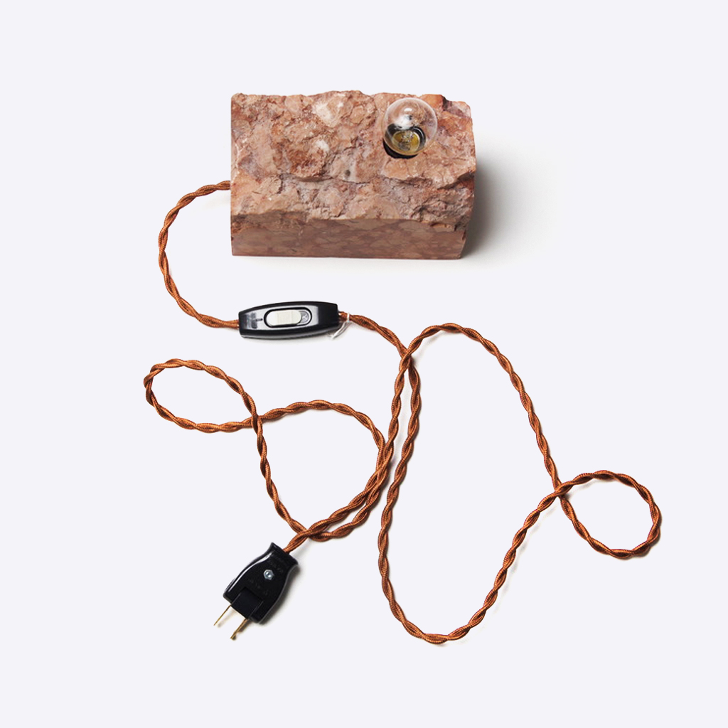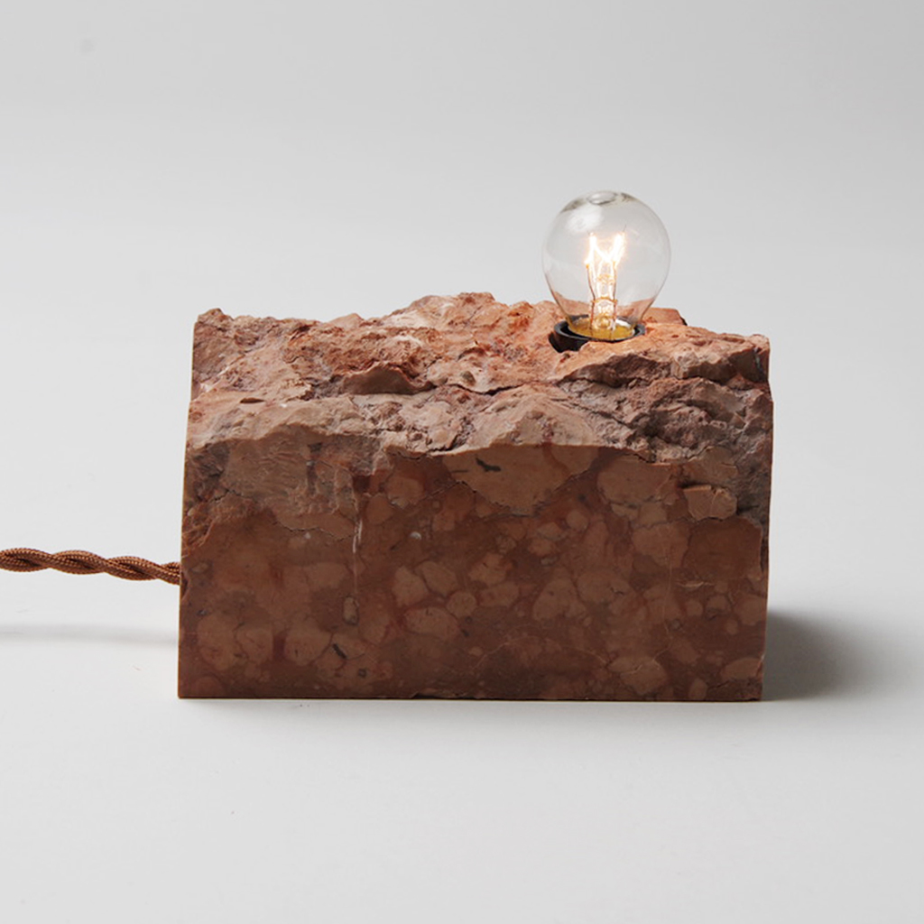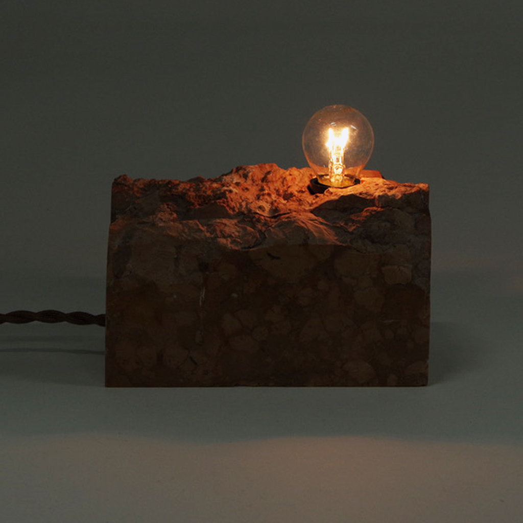 空間デザインをベースに店舗設計や展示会などイベントの会場構成、ディスプレイデザインを手がける外山翔さんによるアートプロジェクト【Atelier matic(アトリエ マティック)】 「品がありユーモアもある」「大胆さと繊細さ」をテーマに、現在は天然石やアクリルなどの樹脂を用いた一点ものを製作しています。 アクリルに亀裂を入れたり、花やアンティークアイテムを閉じ込めることで、まるで時間が止まったように一瞬を切り取ったような作品や、天然石のアートピースでは、石を選別する中で、石の自然な模様や無骨な荒々しい部分など、そのものの持つ美しさや力強さを表現しています。 こちらは、独特な赤味を帯びた茶色の、しぼり染めに似たぼかしのような模様が特徴的なイタリア原産の大理石であるロッソマニャボスキ(Rosso Magnaboschi)を用いた照明。 無骨な荒々しさをあえて残した断面は、見る角度によって表情が変わり、どこか山肌を思わせる印象。石自体が持つ奥深い美しさが際立っています。 照明としてはもちろん、オブジェとしても。棚に置いたり、床にそのまま置いて使用するのもオススメです。 すべてハンドメイドの1点ものとなります。 ※点灯確認用にE17 (10W) の電球が付属します。ご自身でお好みの電球を探してみてください。