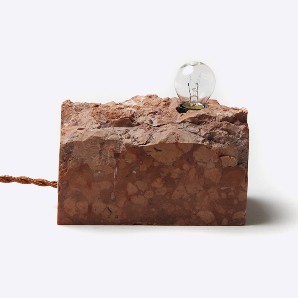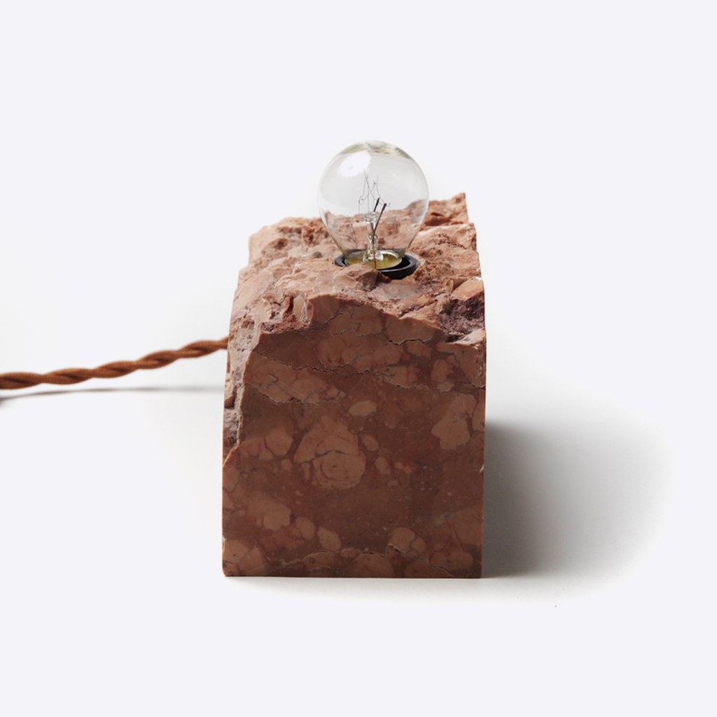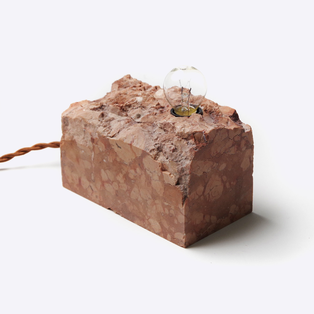 空間デザインをベースに店舗設計や展示会などイベントの会場構成、ディスプレイデザインを手がける外山翔さんによるアートプロジェクト【Atelier matic(アトリエ マティック)】 「品がありユーモアもある」「大胆さと繊細さ」をテーマに、現在は天然石やアクリルなどの樹脂を用いた一点ものを製作しています。 アクリルに亀裂を入れたり、花やアンティークアイテムを閉じ込めることで、まるで時間が止まったように一瞬を切り取ったような作品や、天然石のアートピースでは、石を選別する中で、石の自然な模様や無骨な荒々しい部分など、そのものの持つ美しさや力強さを表現しています。 こちらは、独特な赤味を帯びた茶色の、しぼり染めに似たぼかしのような模様が特徴的なイタリア原産の大理石であるロッソマニャボスキ(Rosso Magnaboschi)を用いた照明。 無骨な荒々しさをあえて残した断面は、見る角度によって表情が変わり、どこか山肌を思わせる印象。石自体が持つ奥深い美しさが際立っています。 照明としてはもちろん、オブジェとしても。棚に置いたり、床にそのまま置いて使用するのもオススメです。 すべてハンドメイドの1点ものとなります。 ※点灯確認用にE17 (10W) の電球が付属します。ご自身でお好みの電球を探してみてください。
