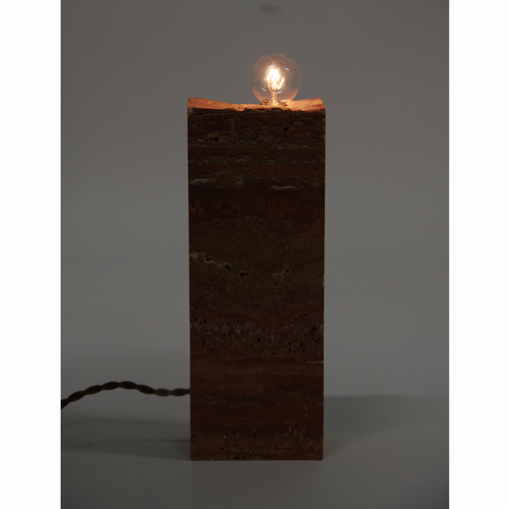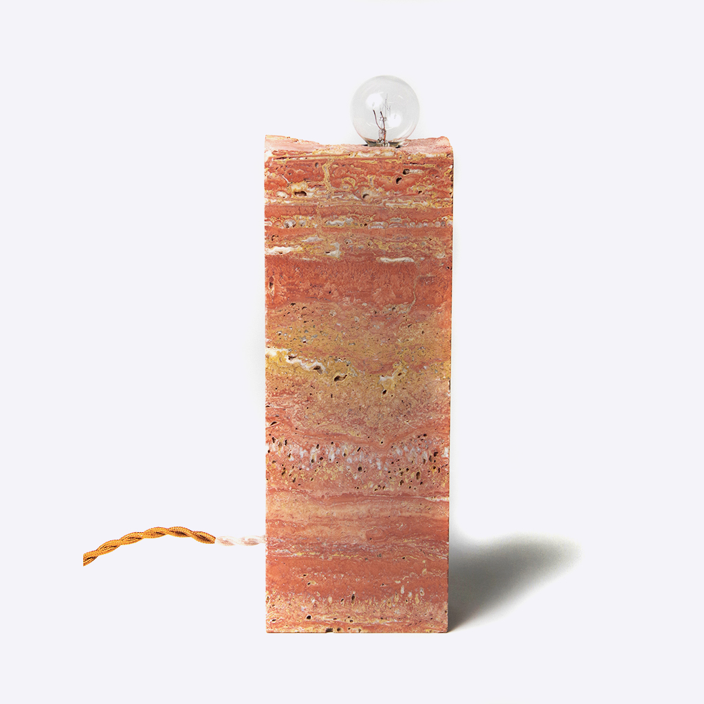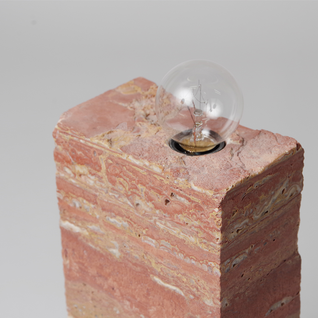 空間デザインをベースに店舗設計や展示会などイベントの会場構成、ディスプレイデザインを手がける外山翔さんによるアートプロジェクト【Atelier matic(アトリエ マティック)】 「品がありユーモアもある」「大胆さと繊細さ」をテーマに、現在は天然石やアクリルなどの樹脂を用いた一点ものを製作しています。 アクリルに亀裂を入れたり、花やアンティークアイテムを閉じ込めることで、まるで時間が止まったように一瞬を切り取ったような作品や、天然石のアートピースでは、石を選別する中で、石の自然な模様や無骨な荒々しい部分など、そのものの持つ美しさや力強さを表現しています。 こちらは、温泉水や地下水に含まれる石灰質が沈殿して固まったもので、赤系色のグラデーションが美しいレッドトラバーチン(Red Travertine)を用いた照明。 地層のような縞模様は、長い時間をかけて出来上がったものであることがわかり、雄大な時の経過を感じることができます。 照明としてはもちろん、オブジェとしても。棚に置いたり、床にそのまま置いて使用するのもオススメです。 すべてハンドメイドの1点ものとなります。 ※点灯確認用にE17 (10W) の電球が付属します。ご自身でお好みの電球を探してみてください。