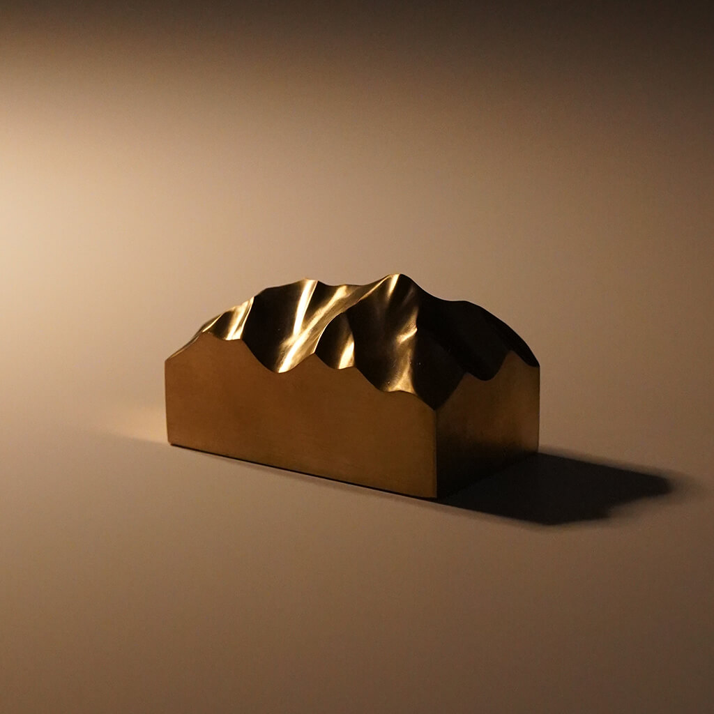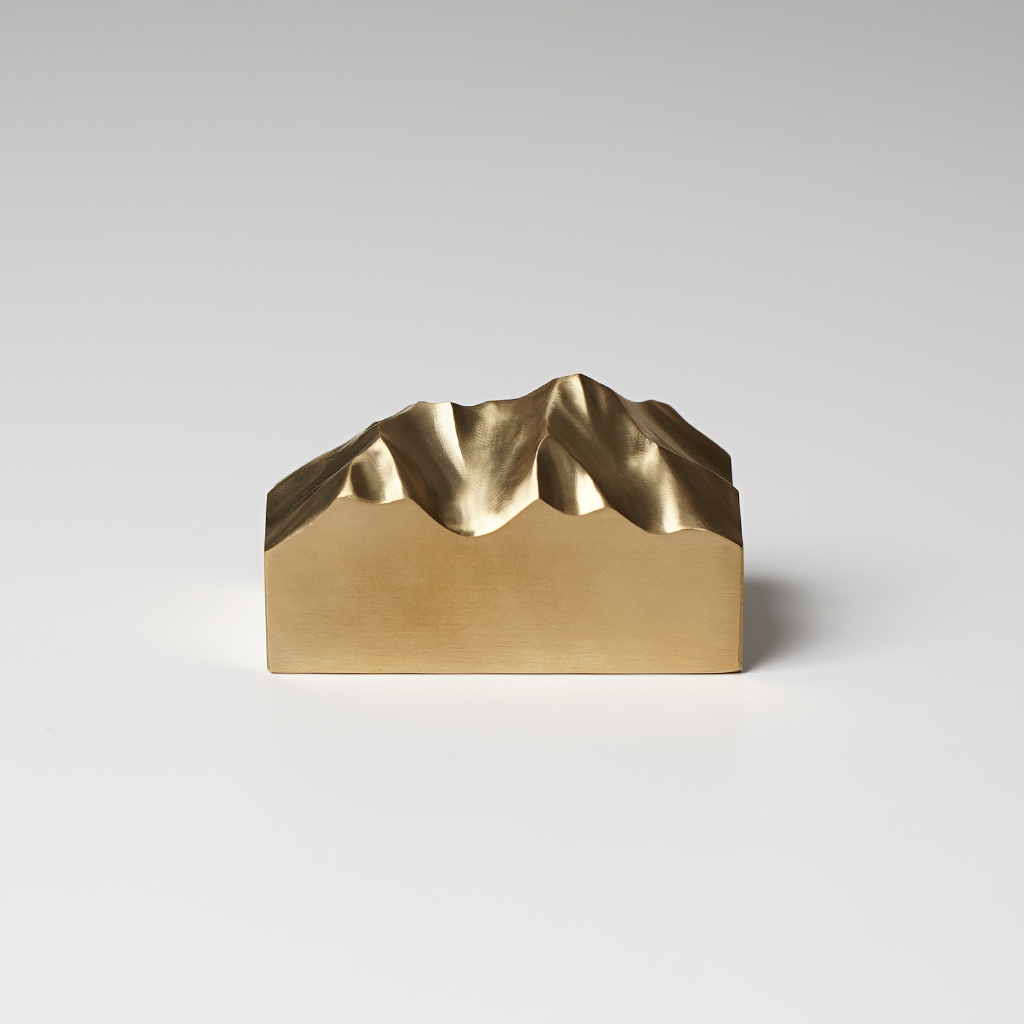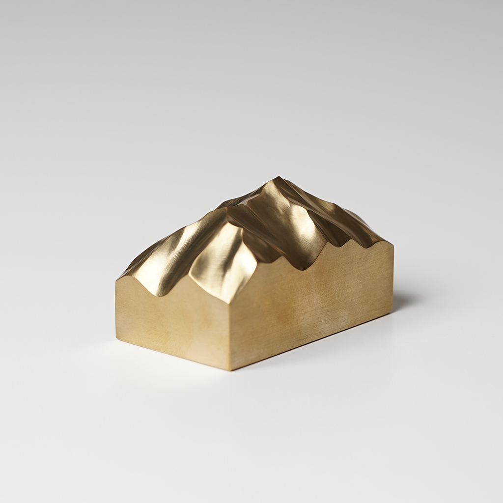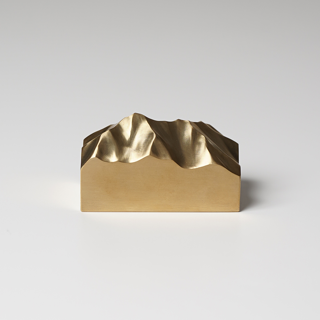 山梨県北杜市を拠点に創作活動をおこなう作家である井出裕太氏(ikkaku mosaic.)の作品。 私たちを魅了し様々なかたちでインスピレーションを与えてくれる雄大な自然。 井出裕太氏もまた、見てきた山麓からの景色や、稜線を歩くことで目にする大地のシワのような沢筋や尾根、氷河地形の痕跡など、作家自身の記憶や体験を通し、雄大な自然が移植されたかのような名もなき山の作品群を精力的に制作しています。 2024年秋に届いた最新の作品群は、真鍮の塊から削り出した名もなき山。 木の作品とはまた違った陰影、真鍮特有の黄金色が美しく、経年変化することで落ち着いた重厚感のある雰囲気が漂っていきます。 ■井出 裕太 1982年 長野県南佐久出身。 山梨県北杜市在住。 2002年頃より登山、バックカントリースノーボードをはじめ、山を中心とした生活を送る。 2010年、北アルプスに魅了され、松本市内の登山用品店に勤務。 2017年、北杜市へ移住し、木工をはじめる。 自作したアトリエで創作活動をおこない、アウトドブランドとのコラボやワークショップを開催。 現在は、見てきた山、歩いた稜線、滑った地形から受けたイメージを表現するべく、山の造形作品を展開している。 眺める角度、光の当たり方によって、豊かな陰影が浮かび上がります。
