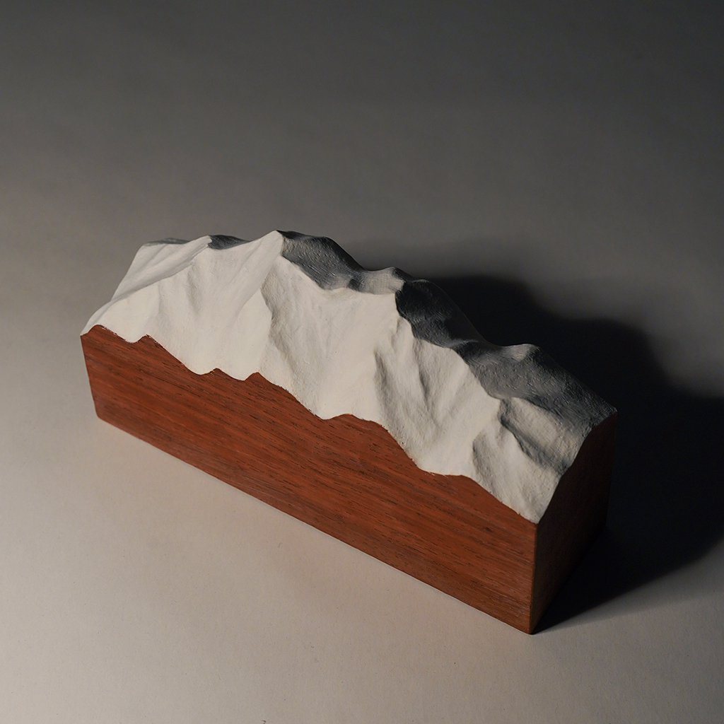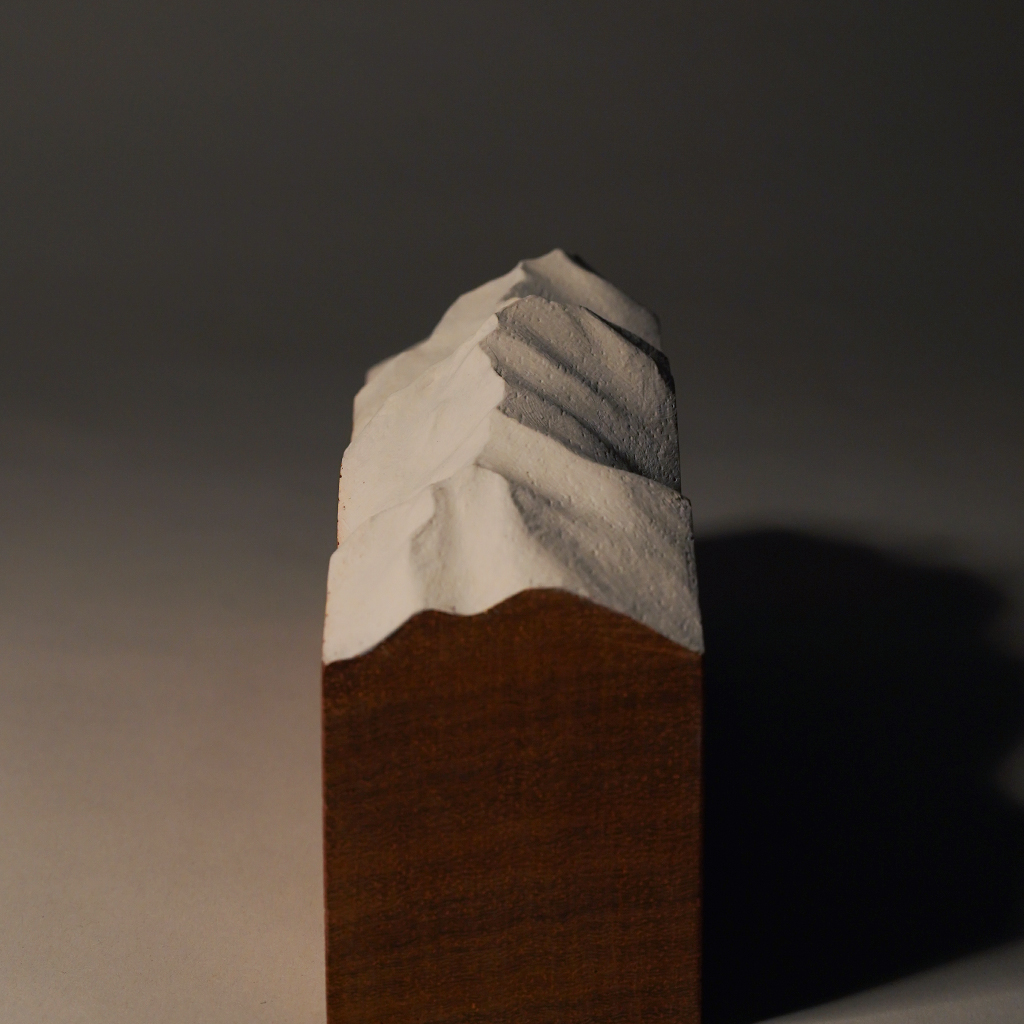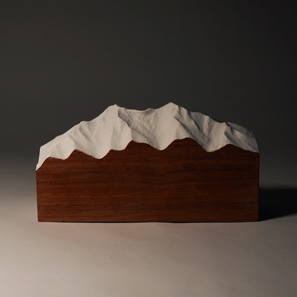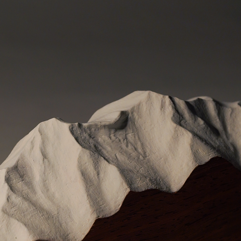 山梨県北杜市を拠点に創作活動をおこなう、木工作家である井出裕太氏(ikkaku mosaic)の作品。 私たちを魅了し様々なかたちでインスピレーションを与えてくれる雄大な自然。 井出裕太氏もまた、見てきた山麓からの景色や、稜線を歩くことで目にする大地のシワのような沢筋や尾根、氷河地形の痕跡など、作家自身の記憶や体験を通し、雄大な自然が移植されたかのような名もなき山の作品群を精力的に制作しています。 2025年1月にNicetime Mountain Galleryで開催された最新の個展【La Ni_a】も大盛況に終わり、僕らも今後の活動を本当に楽しみにしています。 ※こちらの作品は厳冬季限定モデル【snowy】バージョンになります。 ■井出 裕太 1982年 長野県南佐久出身。 山梨県北杜市在住。 2002年頃より登山、バックカントリースノーボードをはじめ、山を中心とした生活を送る。 2010年、北アルプスに魅了され、松本市内の登山用品店に勤務。 2017年、北杜市へ移住し、木工をはじめる。 自作したアトリエで創作活動をおこない、アウトドブランドとのコラボやワークショップを開催。 現在は、見てきた山、歩いた稜線、滑った地形から受けたイメージを表現するべく、山の造形作品を展開している。 光の当たり方によって、豊かな陰影が現れます。