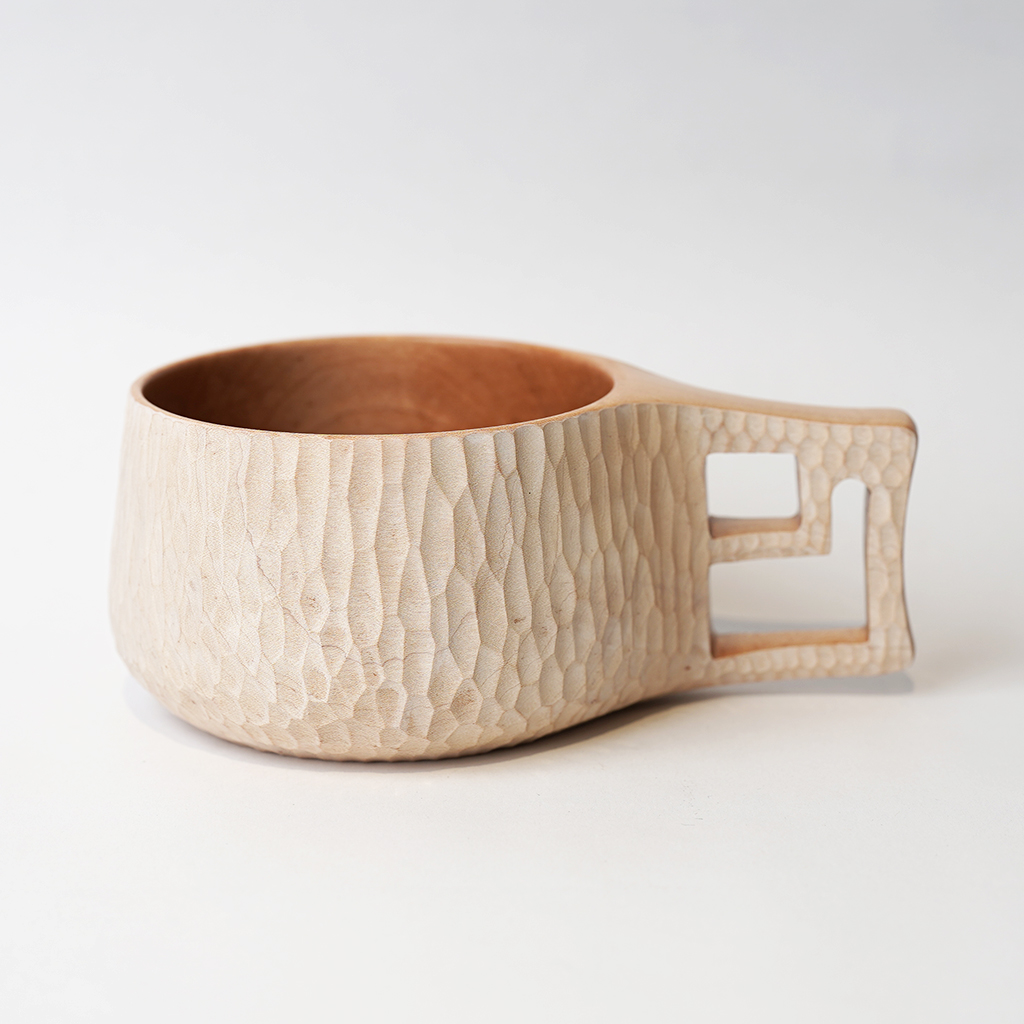 【atelier dehors】(アトリエ・ドゥオル)による楓の木から削り出したカップ。 外側のみチタンホワイト着色を施し、ガラス塗料で仕上げてあります。耐水性の高いコーティングですので、オイル仕上げの器のようなお手入れは必要ありません。 カップ部は手彫りの手馴染みの良い形状で、独特なデザインの二つ穴の持ち手。 温かい飲み物、冷たい飲み物、アイスクリーム、ヨーグルトなど、様々な用途にお使いいただけます。 ※ハンドメイドによる1点ものになります。 【atelier dehors/アトリエ・ドゥオル】 長谷川 誠 千葉県で制作活動を行う木工作家。「dehors」は「外」を意味しており、活動拠点である外房の”外”という意味を込められています。 小さな端材でも、その材自体の木目や個性を生かす方法を考え、無駄の無い丁寧な作品作りが特徴。