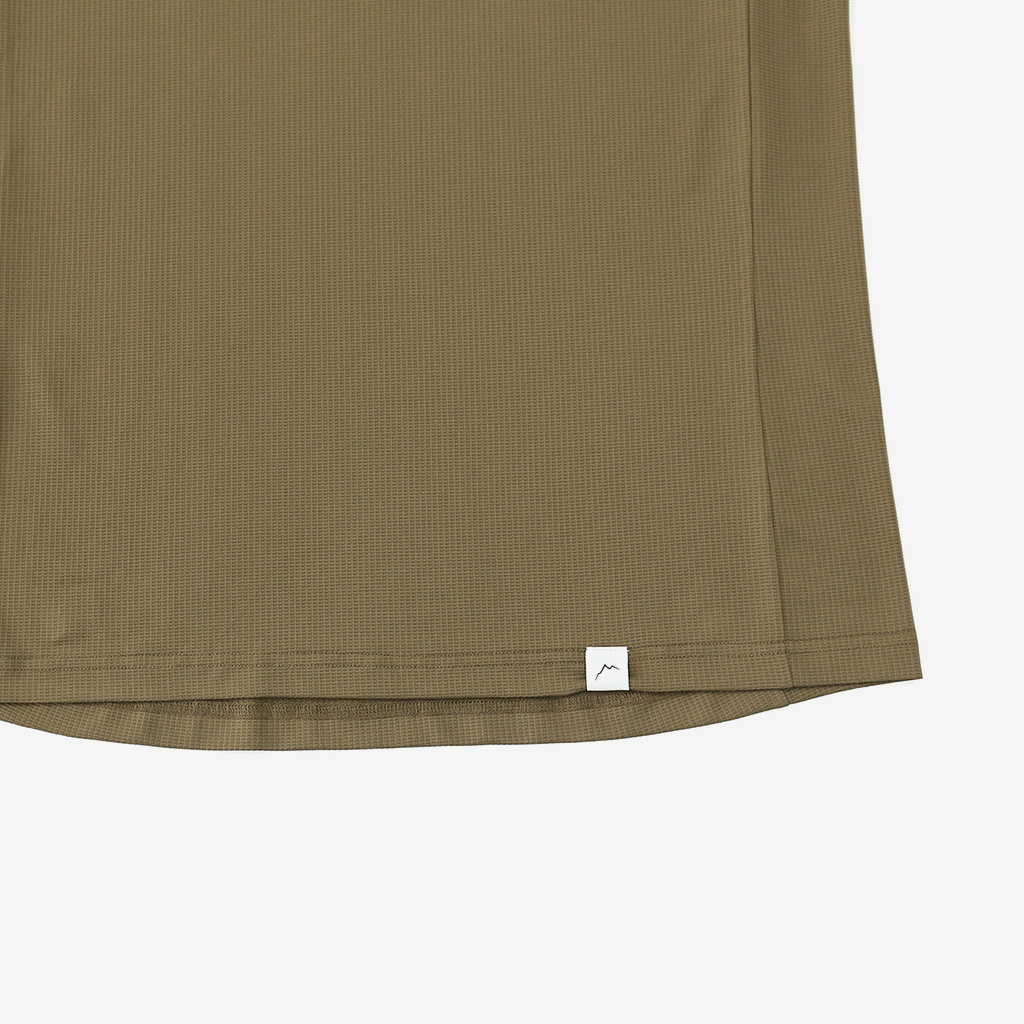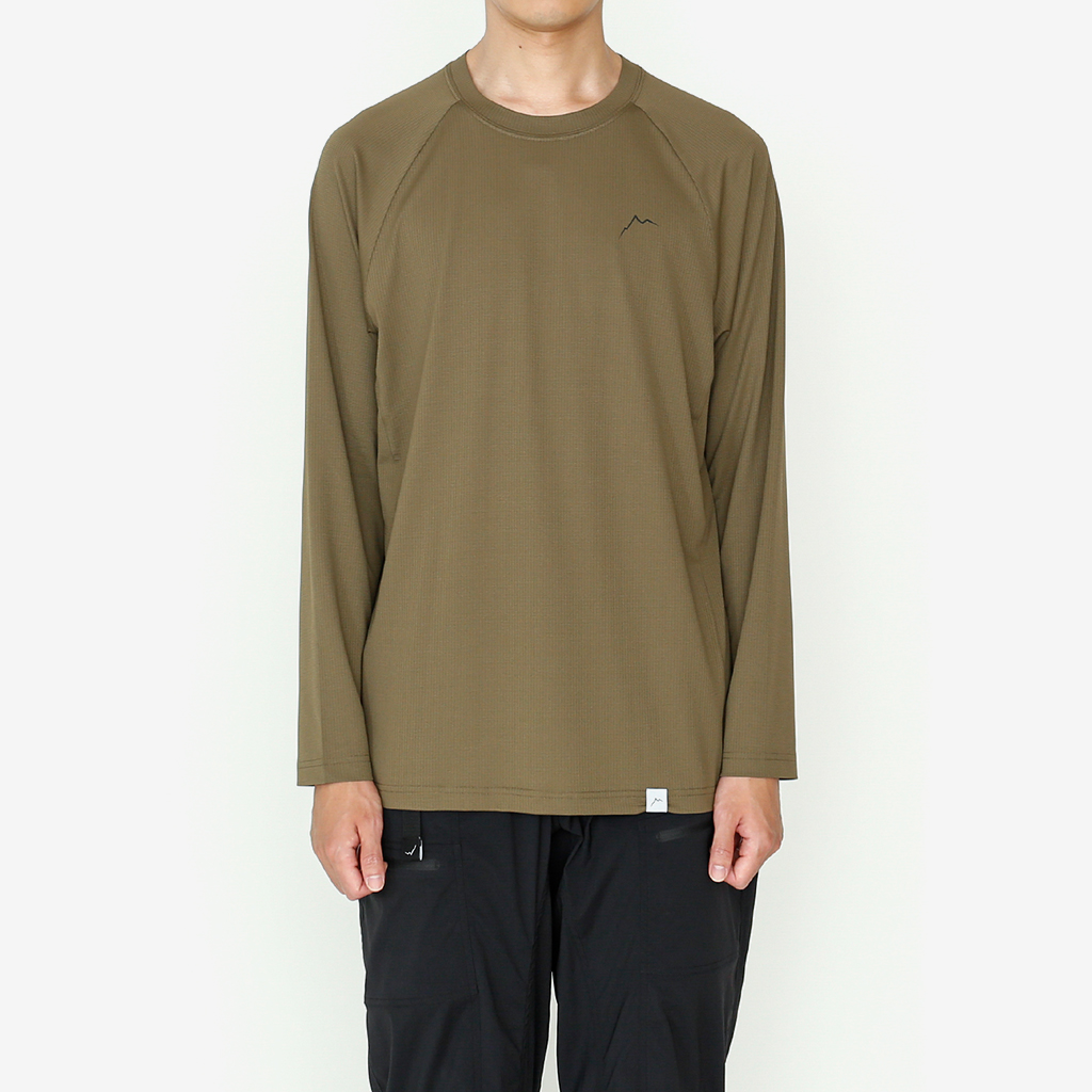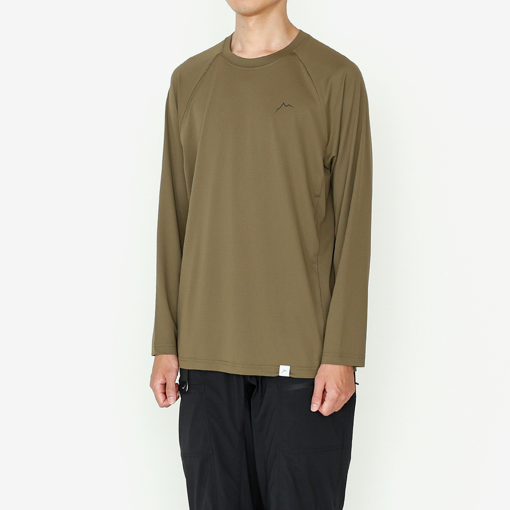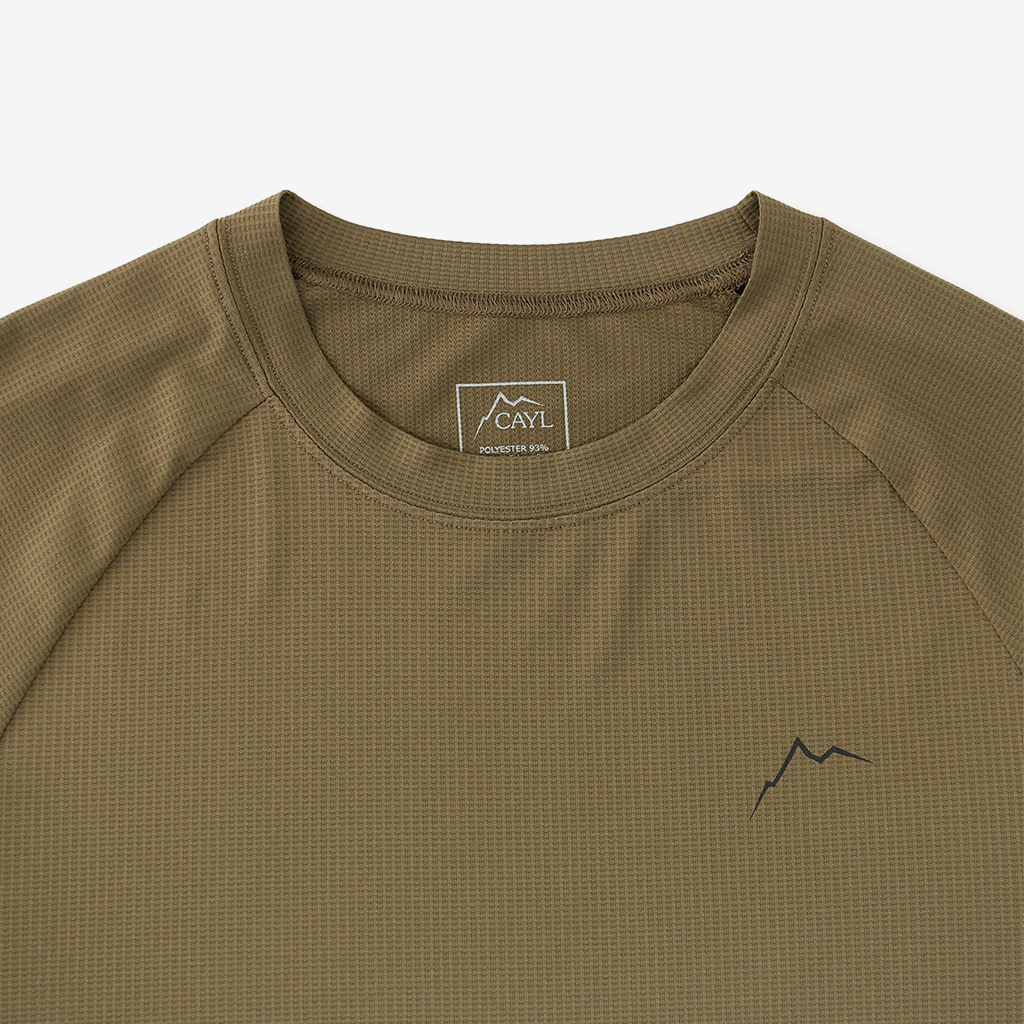 CAYL『Logo Air Short Sleeve』は、CAYLオリジナル生地で作られた速乾ラグランロングスリーブシャツ。 軽量で通気性が高く、吸汗速乾機能があり、さらにHeiq社の抗菌加工が施され、防臭効果もあります。 薄手ながら透けにくく、UVカット機能も備えているため、多くの汗をかく夏山やランニングのベースレイヤーとしても最適。 絶妙なカラー展開も魅力。 背面。 モデル:184cm Lサイズ着用