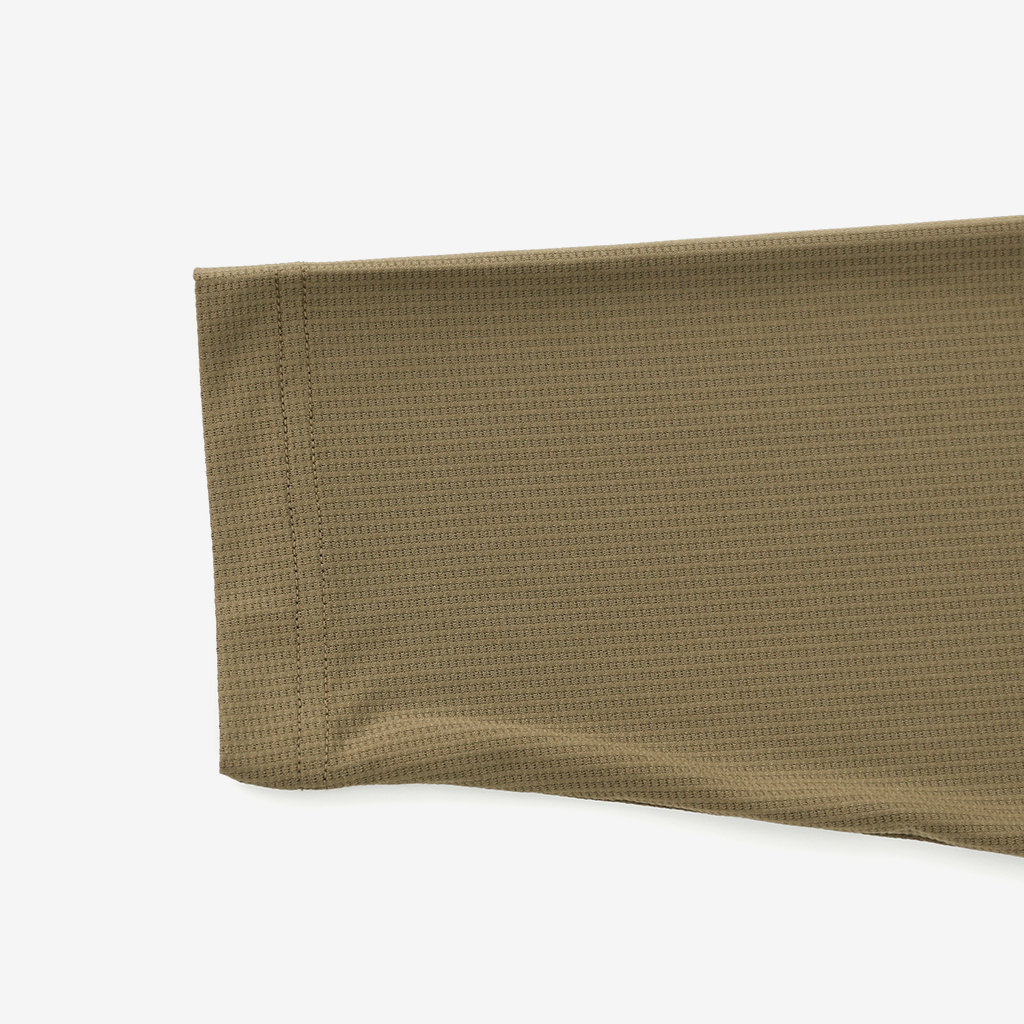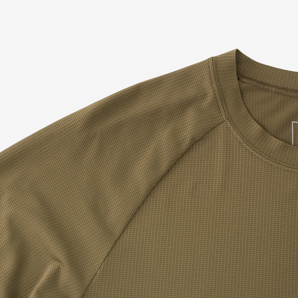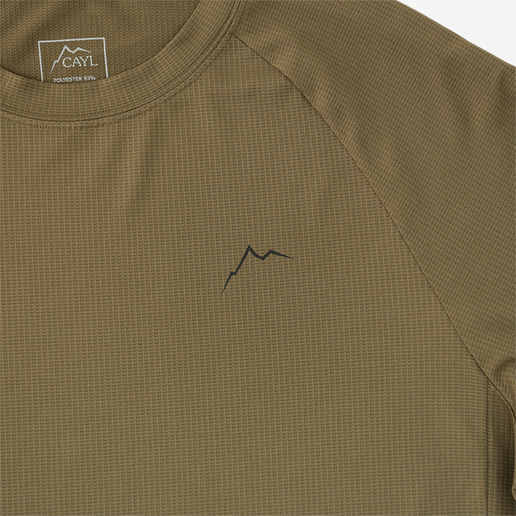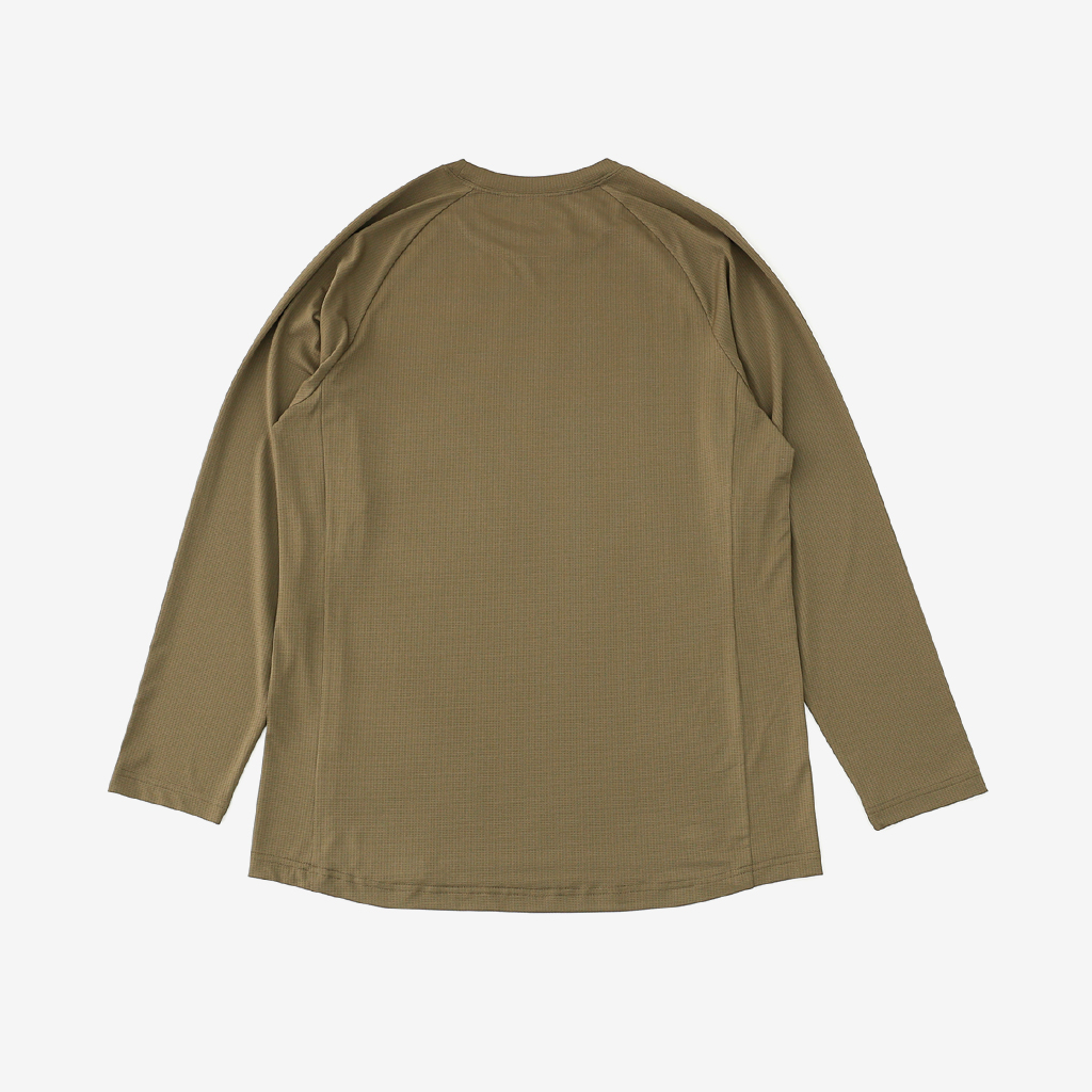 CAYL『Logo Air Short Sleeve』は、CAYLオリジナル生地で作られた速乾ラグランロングスリーブシャツ。 軽量で通気性が高く、吸汗速乾機能があり、さらにHeiq社の抗菌加工が施され、防臭効果もあります。 薄手ながら透けにくく、UVカット機能も備えているため、多くの汗をかく夏山やランニングのベースレイヤーとしても最適。 絶妙なカラー展開も魅力。 背面。 モデル:184cm Lサイズ着用