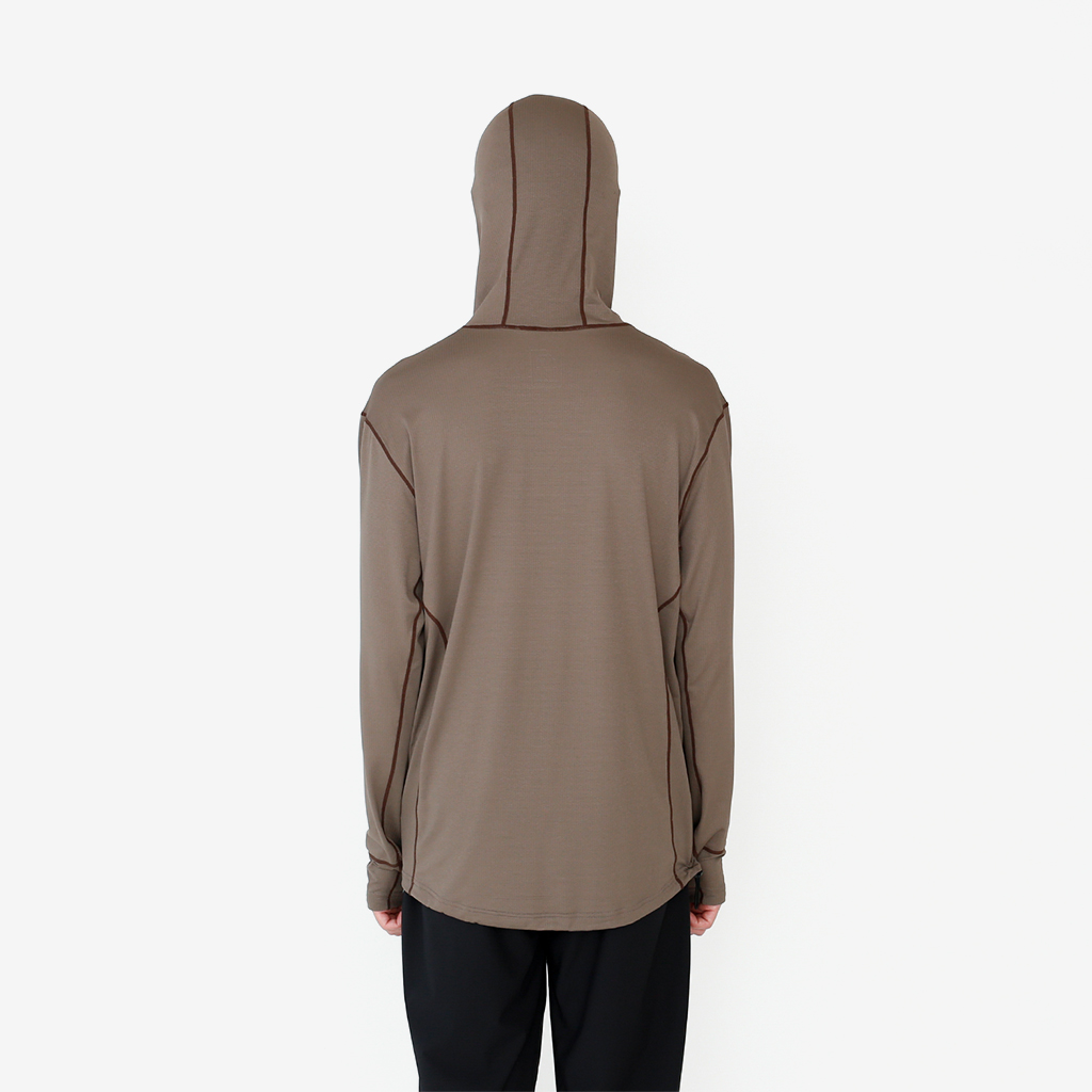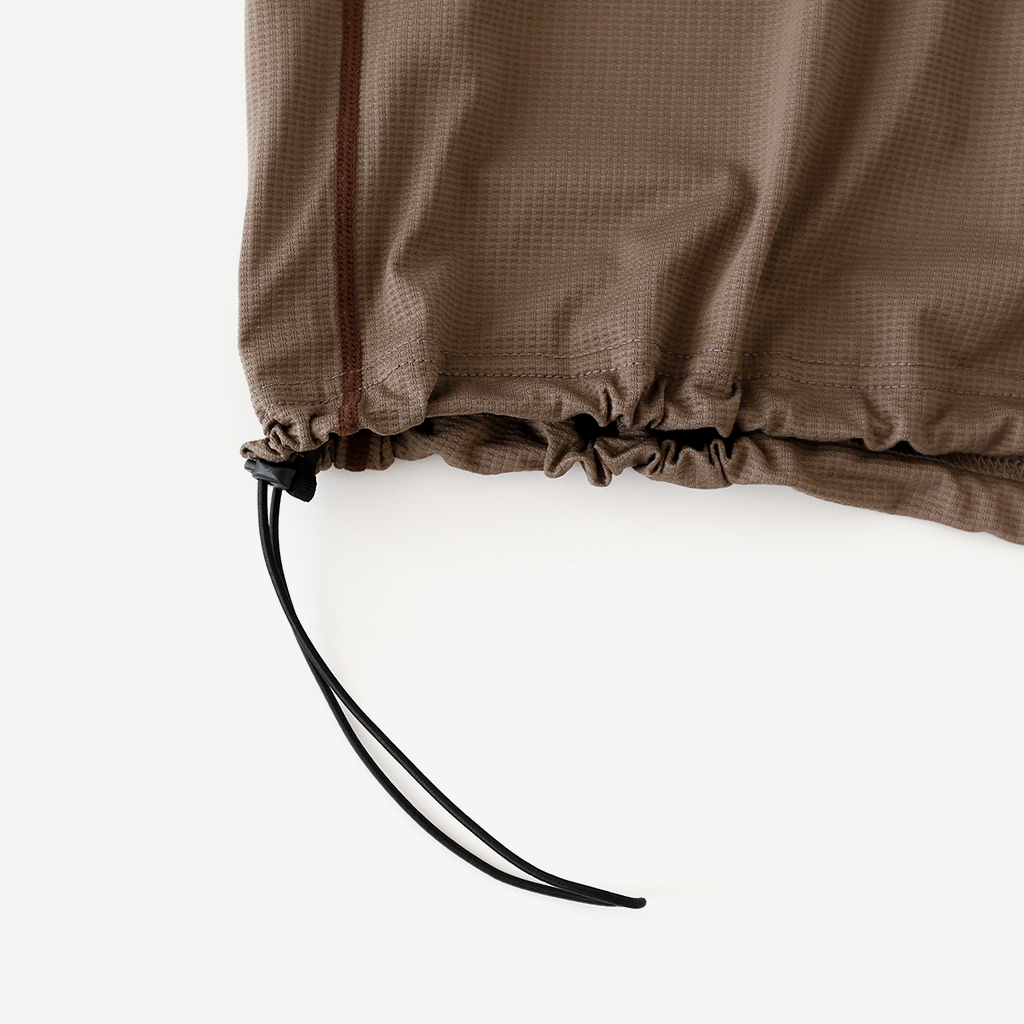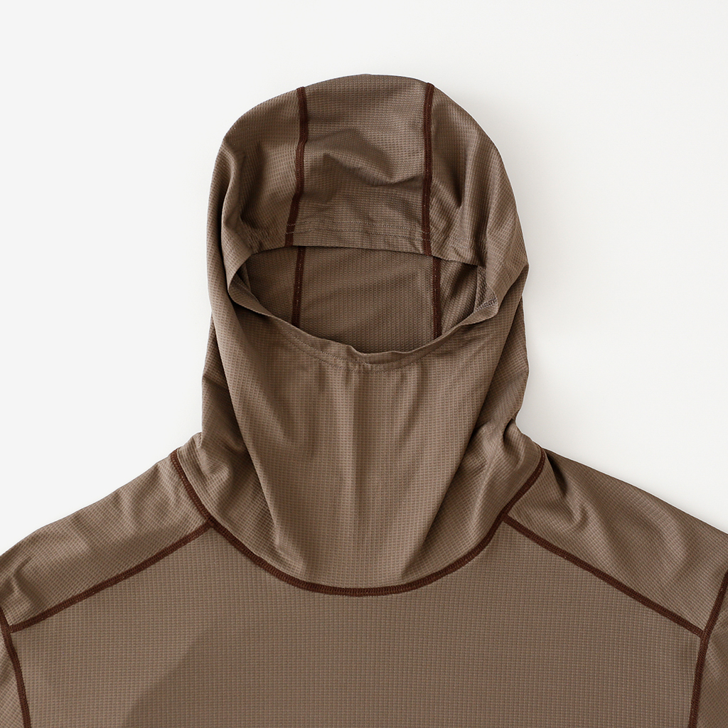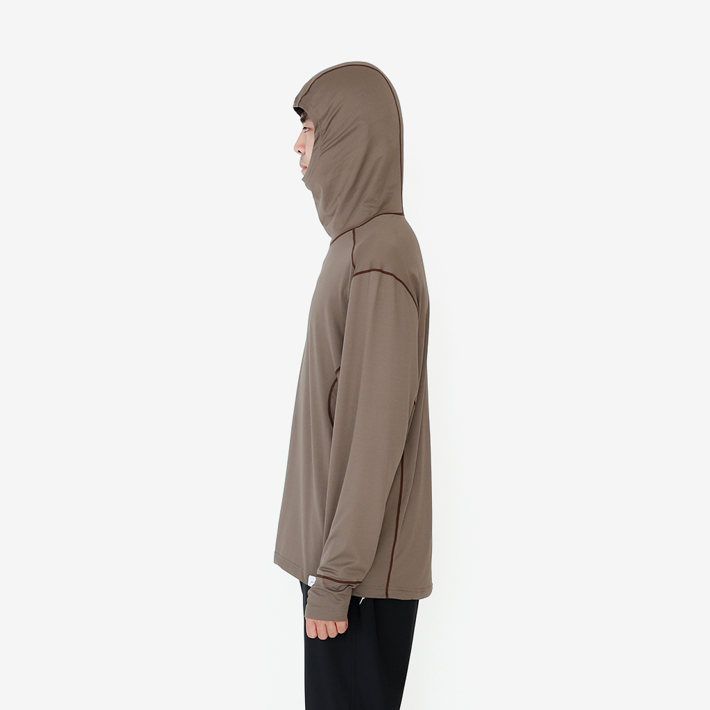 CAYL『Air Hoody S.C』は、CAYLオリジナル生地で作られた速乾ロングスリーブフーディー。 軽量で通気性が高く、吸汗速乾機能があり、さらにHeiq社の抗菌加工が施され、防臭効果もあります。 アルプスの稜線上などで日除けにフードを被っても、通気性が高く快適です。 さらに袖口はサムホール仕様で、裾はコードで絞れます。 多くの汗をかくハイクやランニングのベースレイヤーとしても最適な万能フーディーです。 裾はコードで絞って調整できます。 袖口はサムホール仕様。 モデル:184cm / Lサイズ