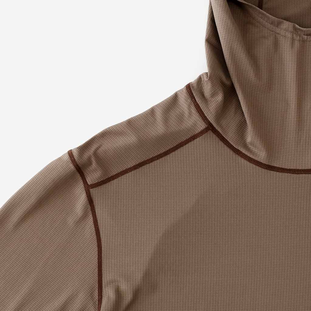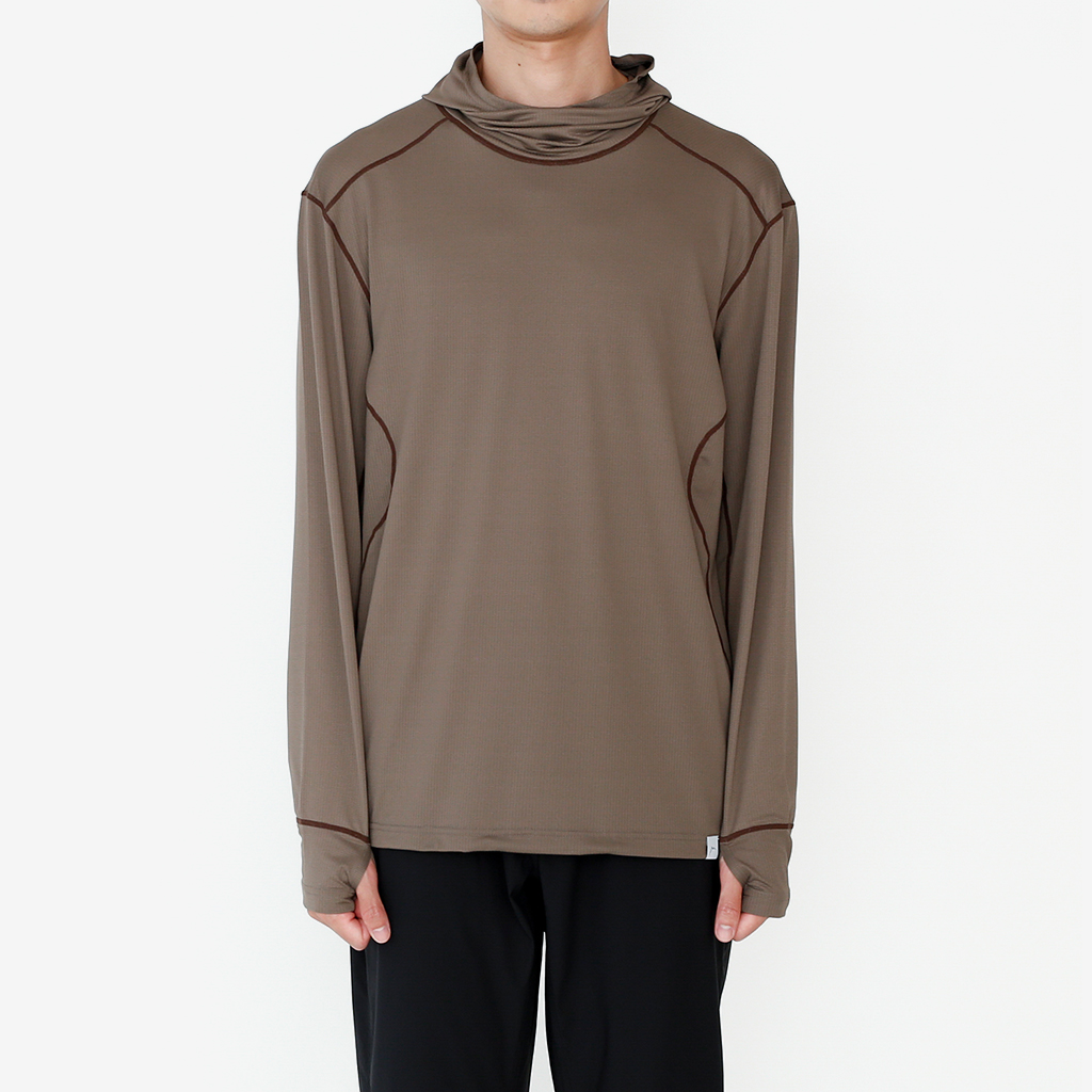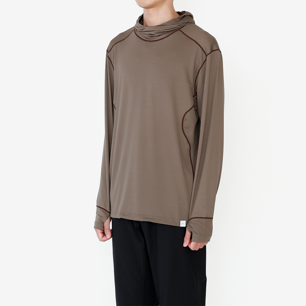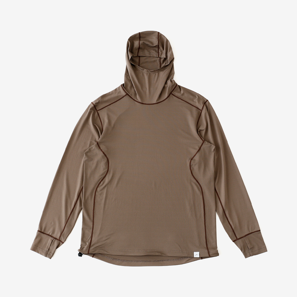 CAYL『Air Hoody S.C』は、CAYLオリジナル生地で作られた速乾ロングスリーブフーディー。 軽量で通気性が高く、吸汗速乾機能があり、さらにHeiq社の抗菌加工が施され、防臭効果もあります。 アルプスの稜線上などで日除けにフードを被っても、通気性が高く快適です。 さらに袖口はサムホール仕様で、裾はコードで絞れます。 多くの汗をかくハイクやランニングのベースレイヤーとしても最適な万能フーディーです。 裾はコードで絞って調整できます。 袖口はサムホール仕様。 モデル:184cm / Lサイズ