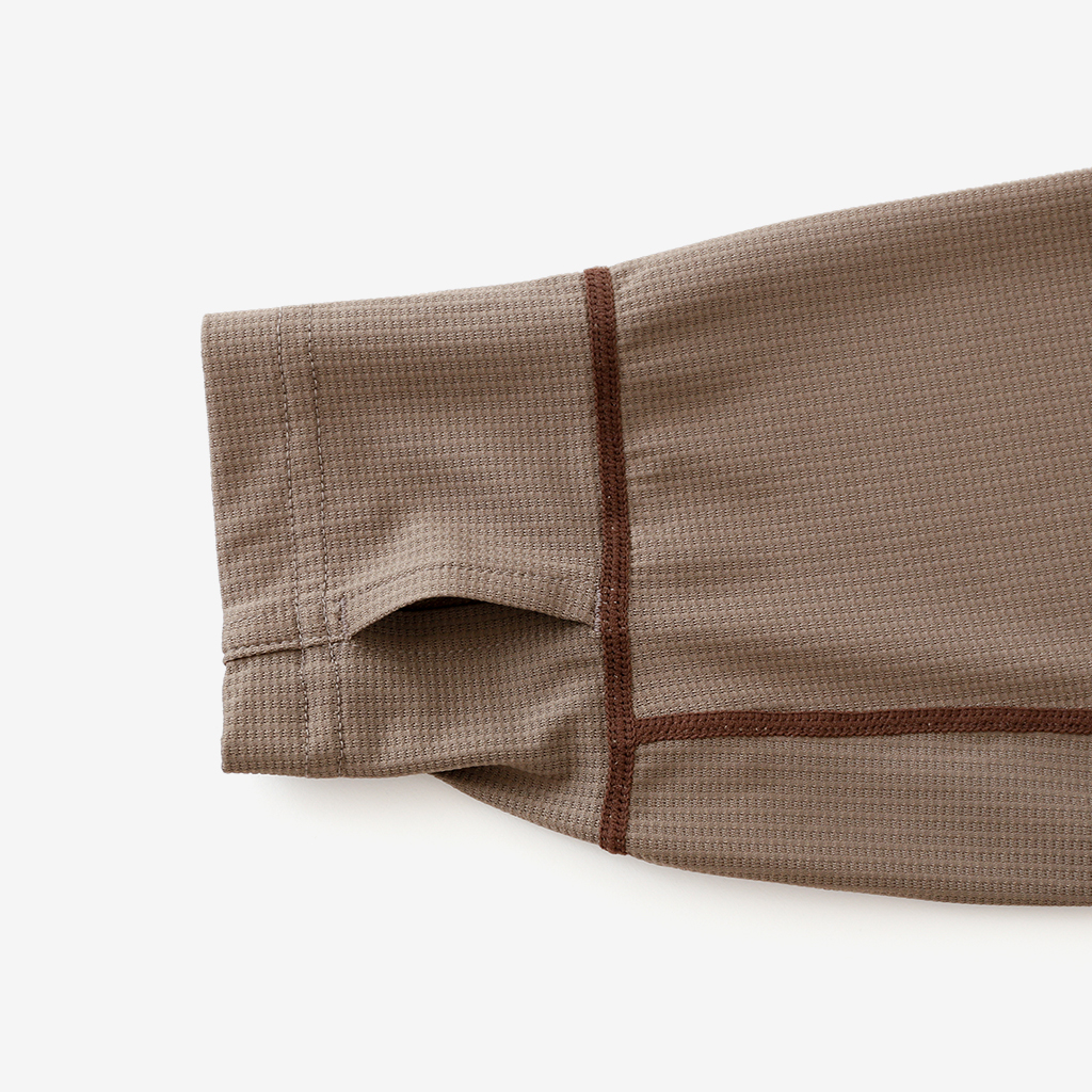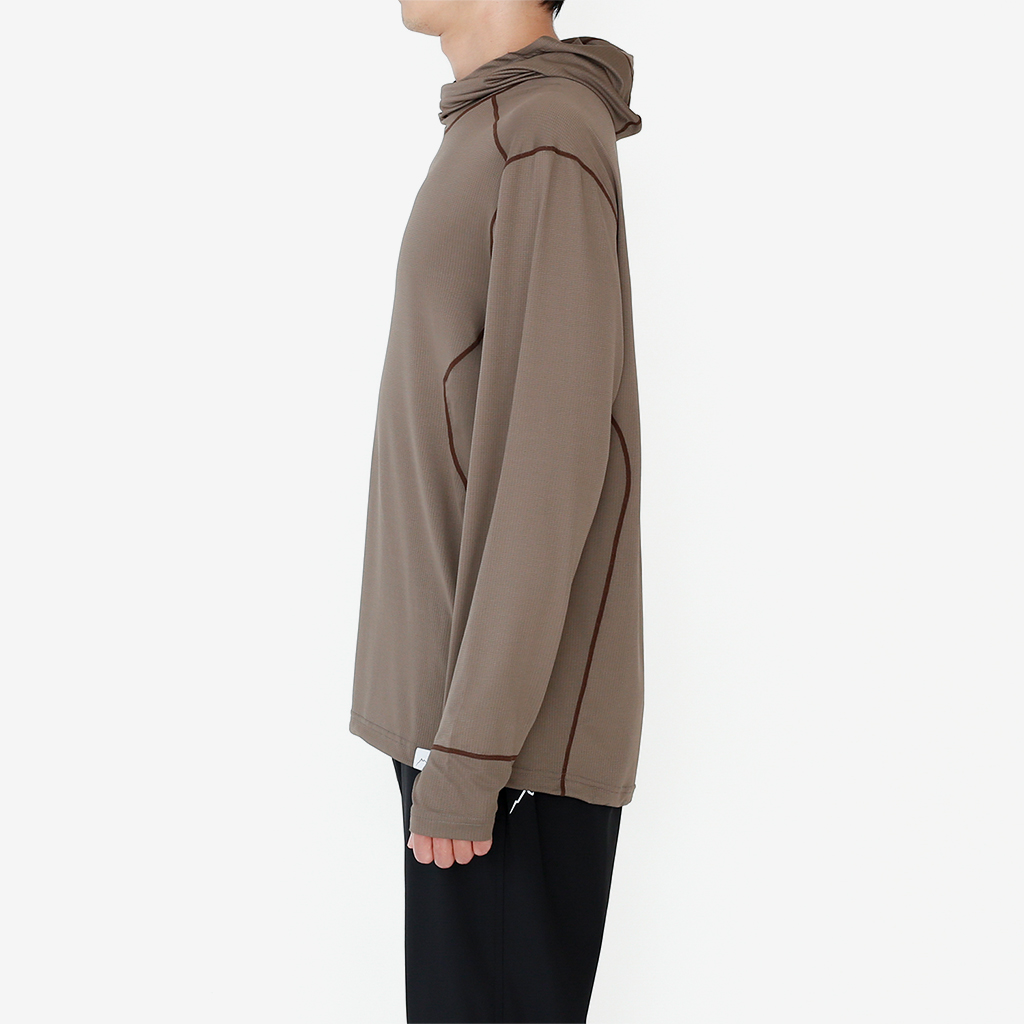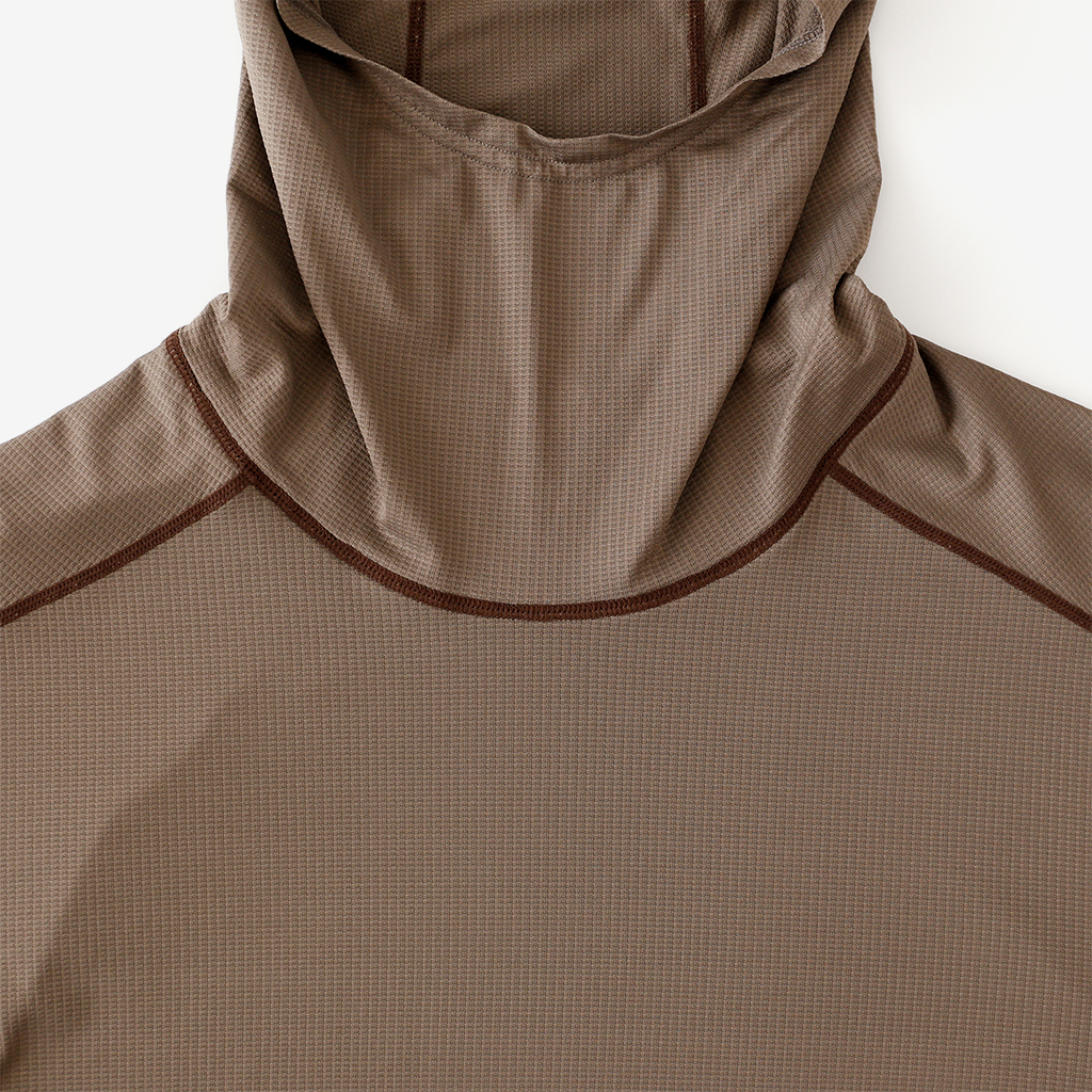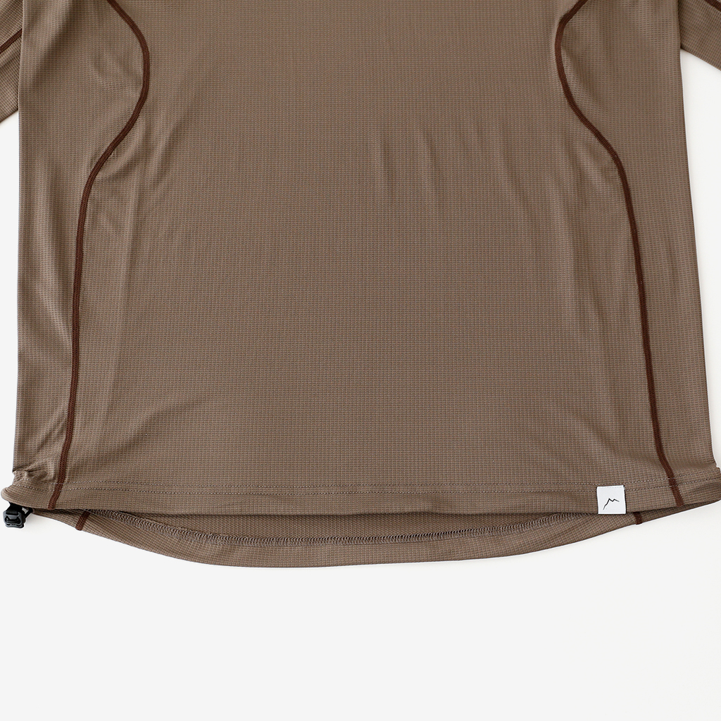 CAYL『Air Hoody S.C』は、CAYLオリジナル生地で作られた速乾ロングスリーブフーディー。 軽量で通気性が高く、吸汗速乾機能があり、さらにHeiq社の抗菌加工が施され、防臭効果もあります。 アルプスの稜線上などで日除けにフードを被っても、通気性が高く快適です。 さらに袖口はサムホール仕様で、裾はコードで絞れます。 多くの汗をかくハイクやランニングのベースレイヤーとしても最適な万能フーディーです。 裾はコードで絞って調整できます。 袖口はサムホール仕様。 モデル:184cm / Lサイズ