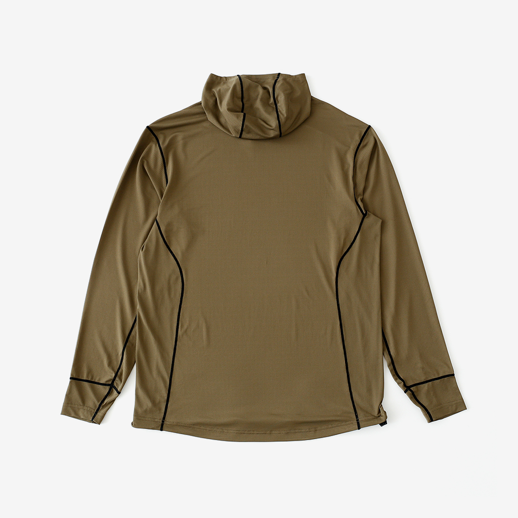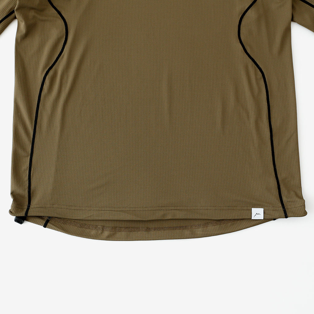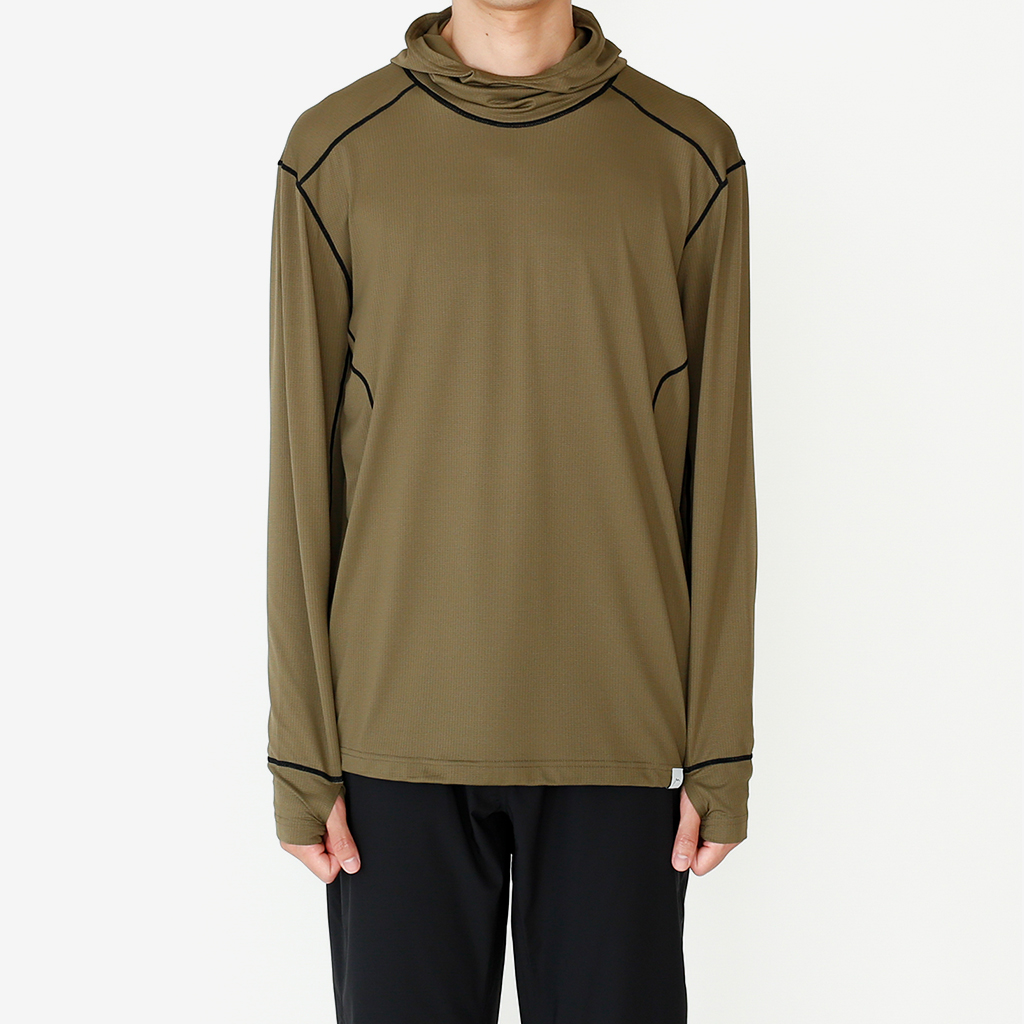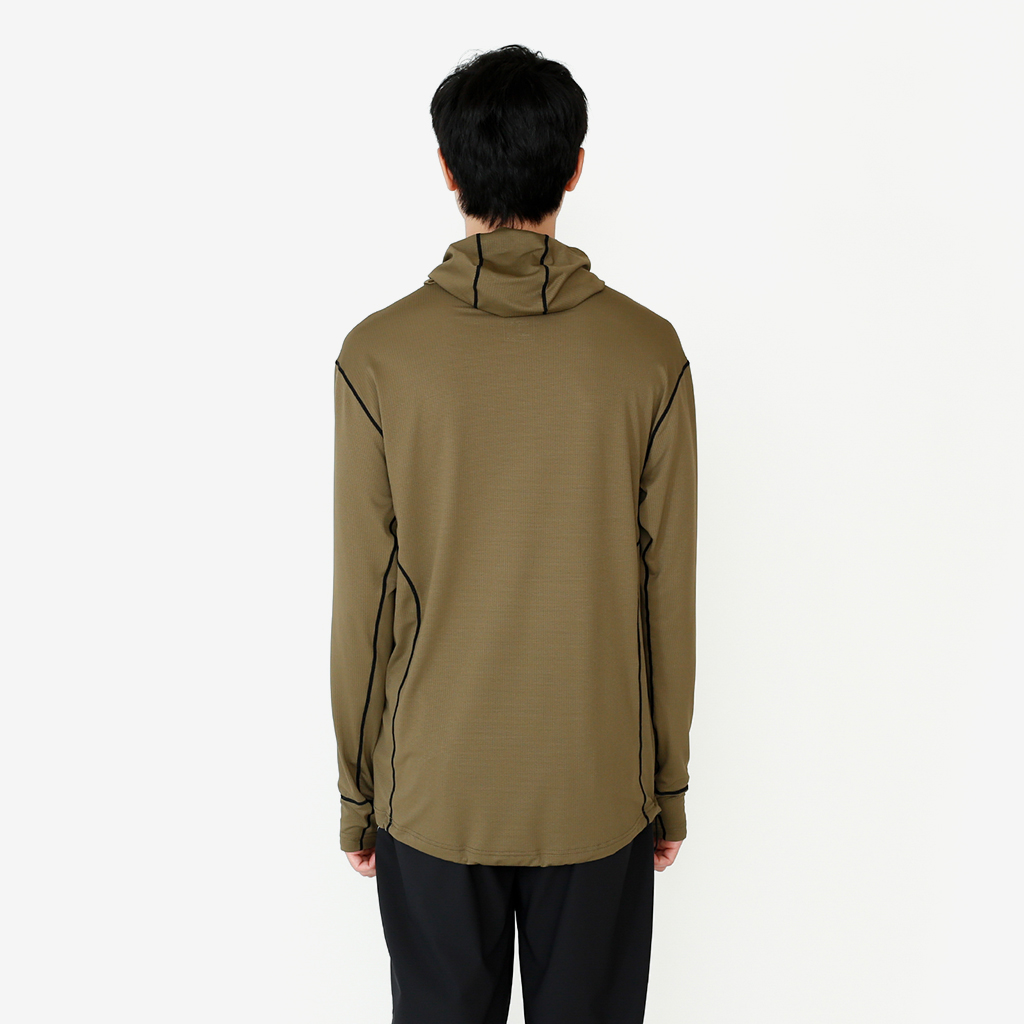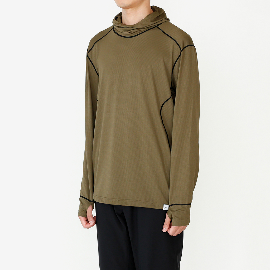 CAYL『Air Hoody S.C』は、CAYLオリジナル生地で作られた速乾ロングスリーブフーディー。 軽量で通気性が高く、吸汗速乾機能があり、さらにHeiq社の抗菌加工が施され、防臭効果もあります。 アルプスの稜線上などで日除けにフードを被っても、通気性が高く快適です。 さらに袖口はサムホール仕様で、裾はコードで絞れます。 多くの汗をかくハイクやランニングのベースレイヤーとしても最適な万能フーディーです。 裾はコードで絞って調整できます。 袖口はサムホール仕様。 モデル:184cm / Lサイズ