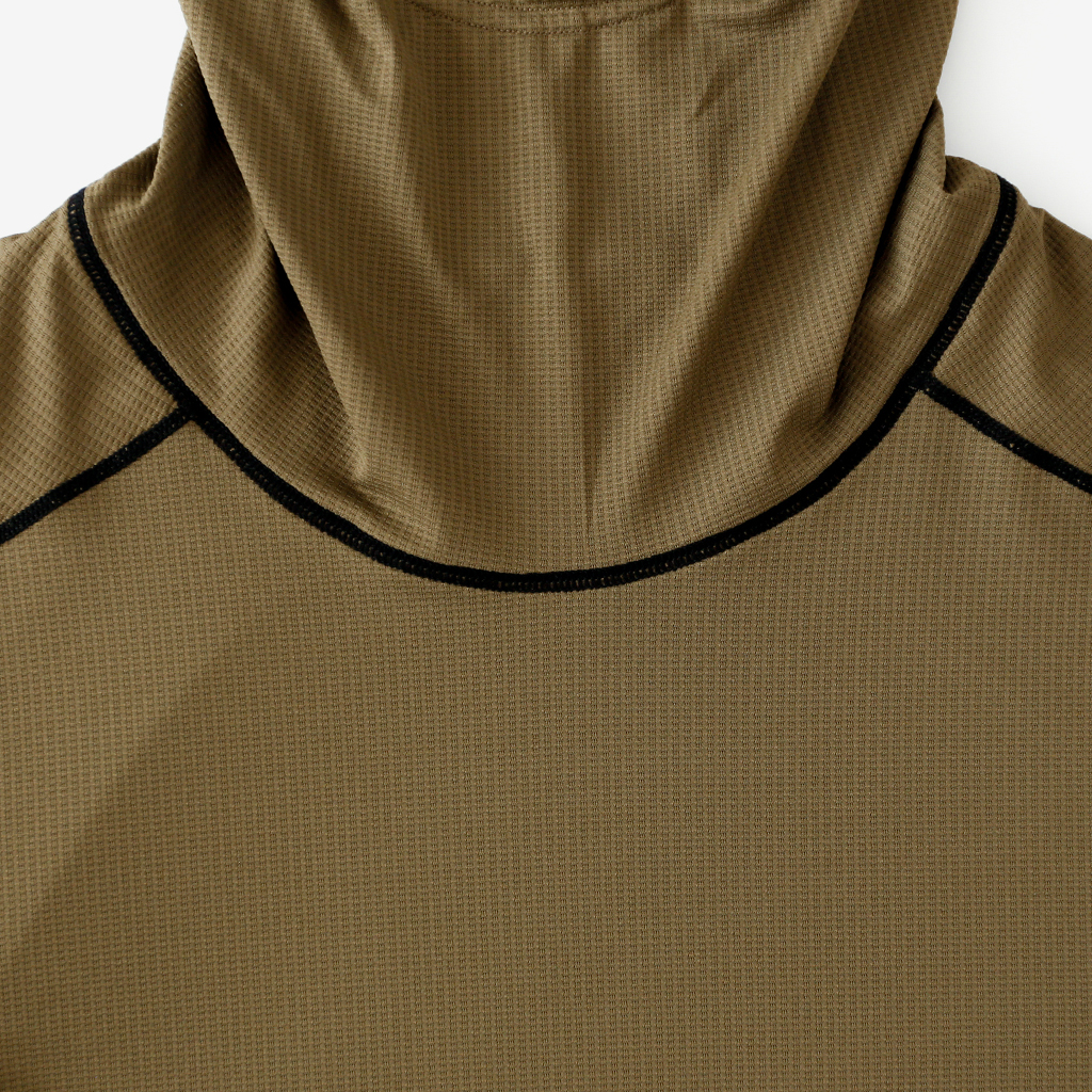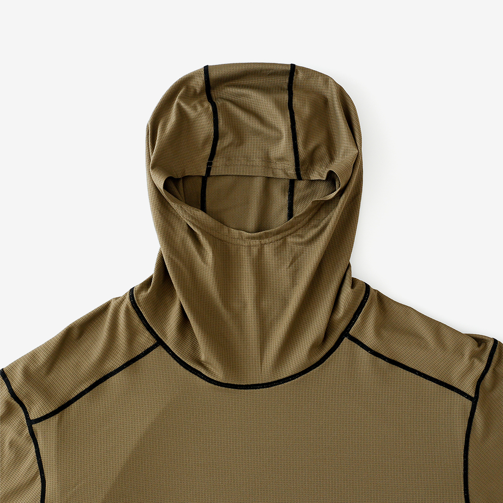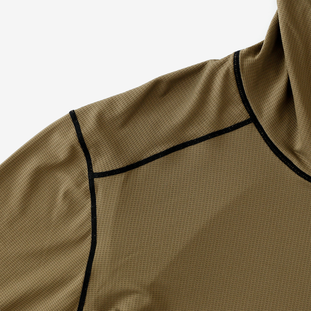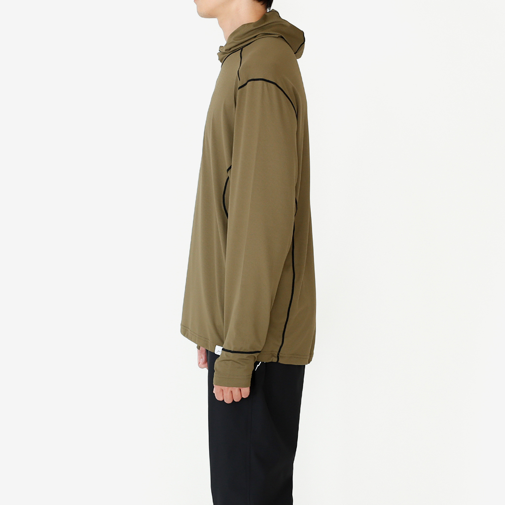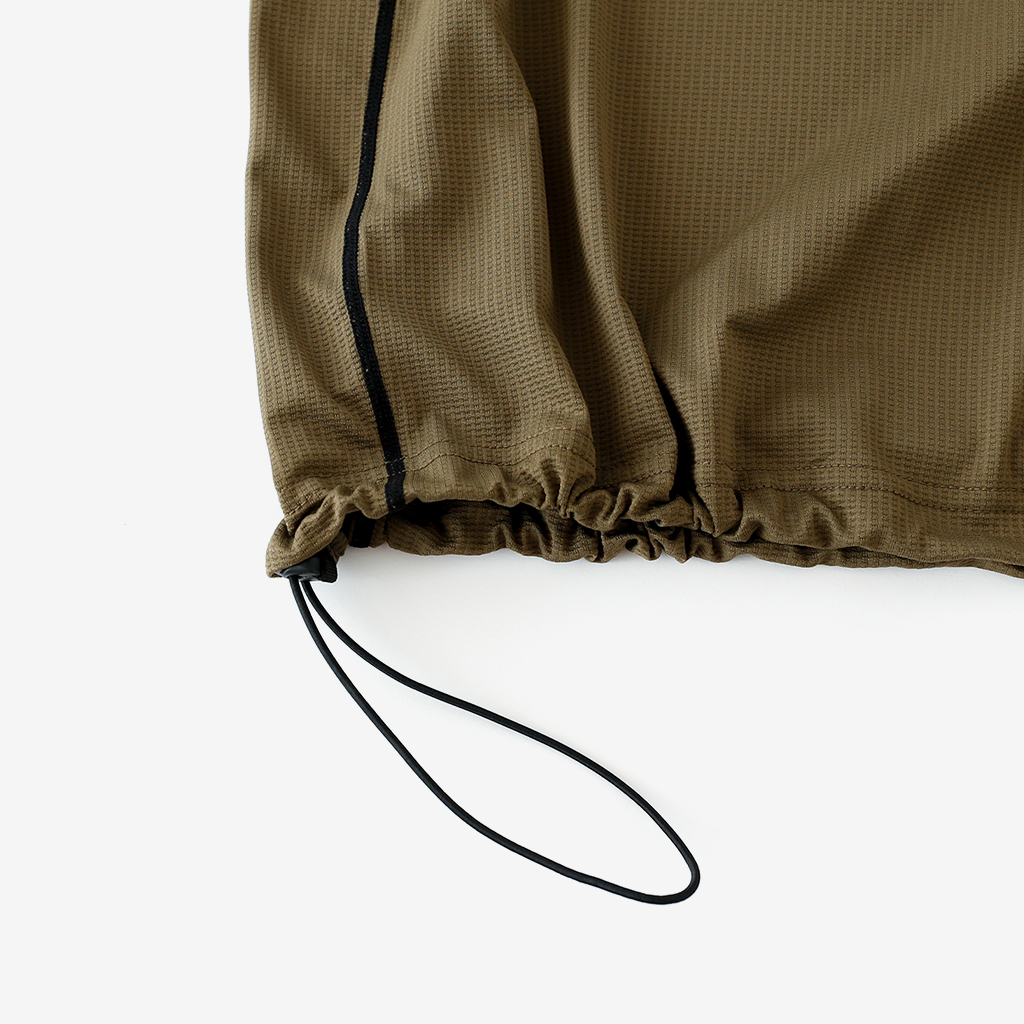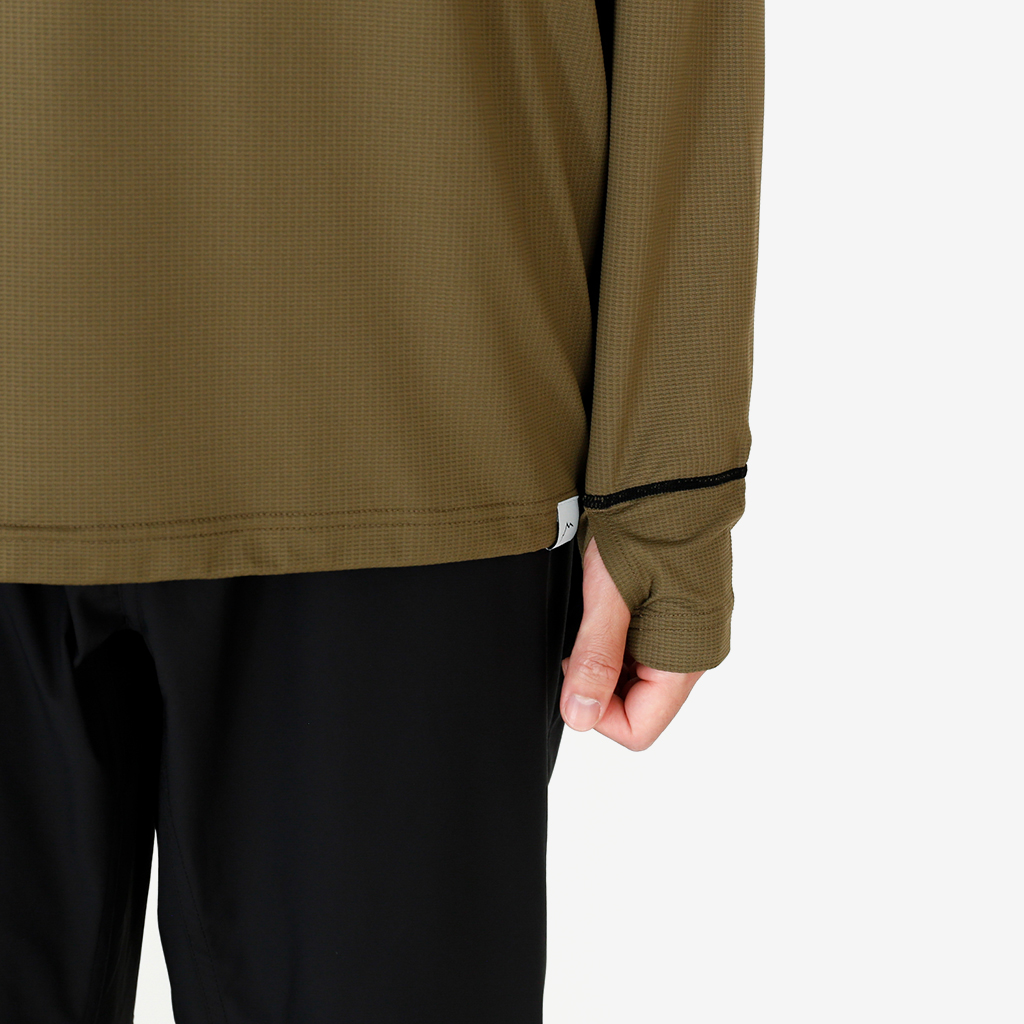 CAYL『Air Hoody S.C』は、CAYLオリジナル生地で作られた速乾ロングスリーブフーディー。 軽量で通気性が高く、吸汗速乾機能があり、さらにHeiq社の抗菌加工が施され、防臭効果もあります。 アルプスの稜線上などで日除けにフードを被っても、通気性が高く快適です。 さらに袖口はサムホール仕様で、裾はコードで絞れます。 多くの汗をかくハイクやランニングのベースレイヤーとしても最適な万能フーディーです。 裾はコードで絞って調整できます。 袖口はサムホール仕様。 モデル:184cm / Lサイズ