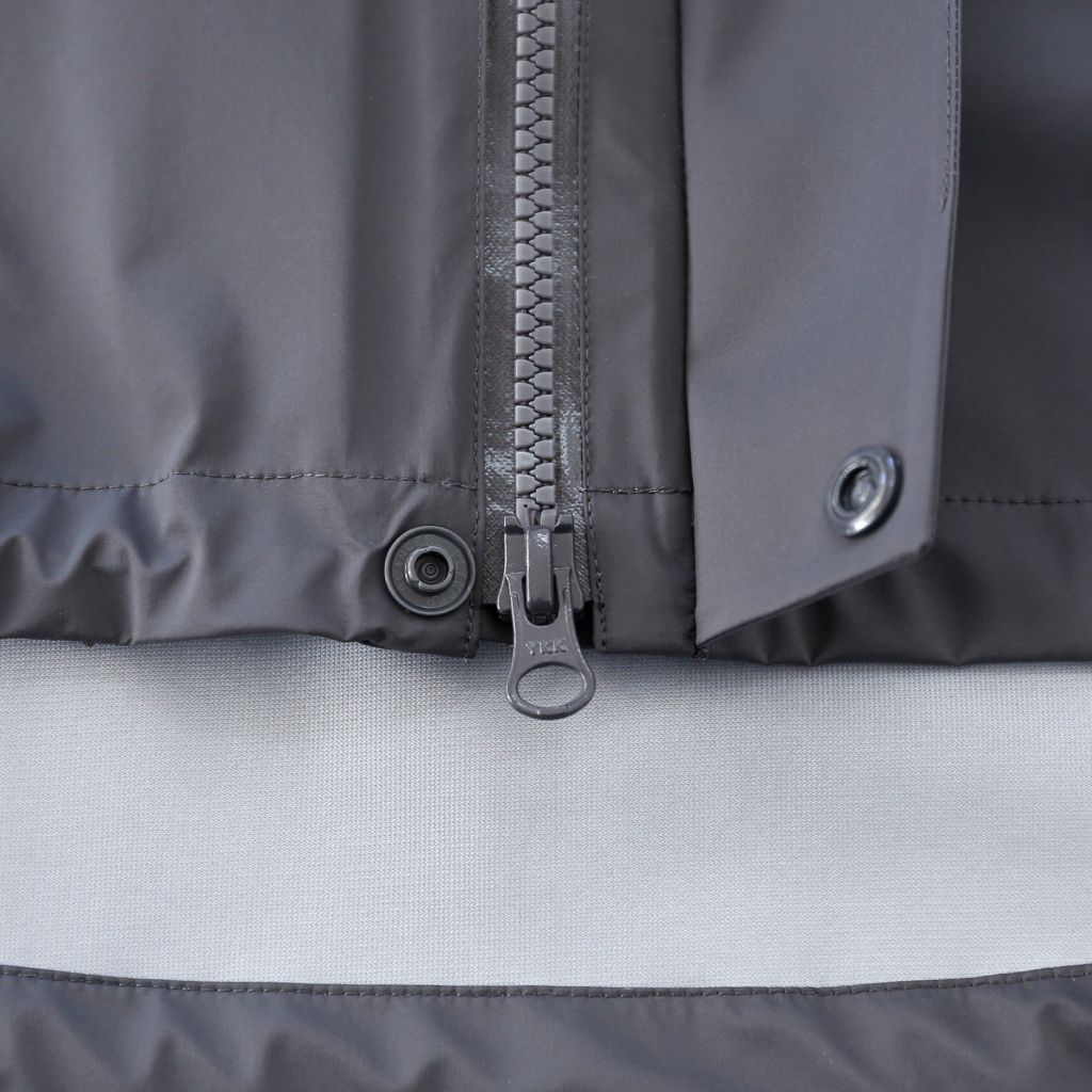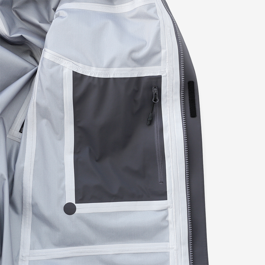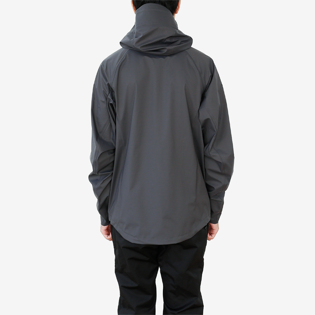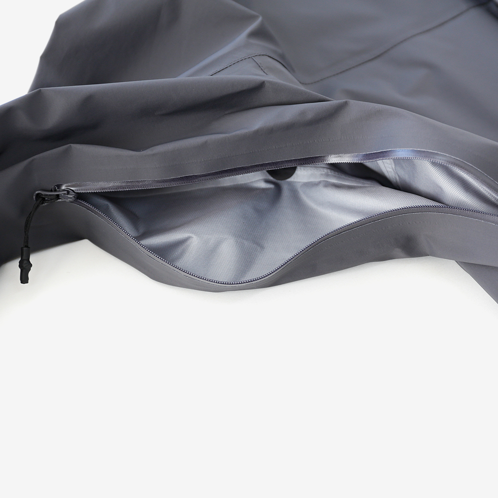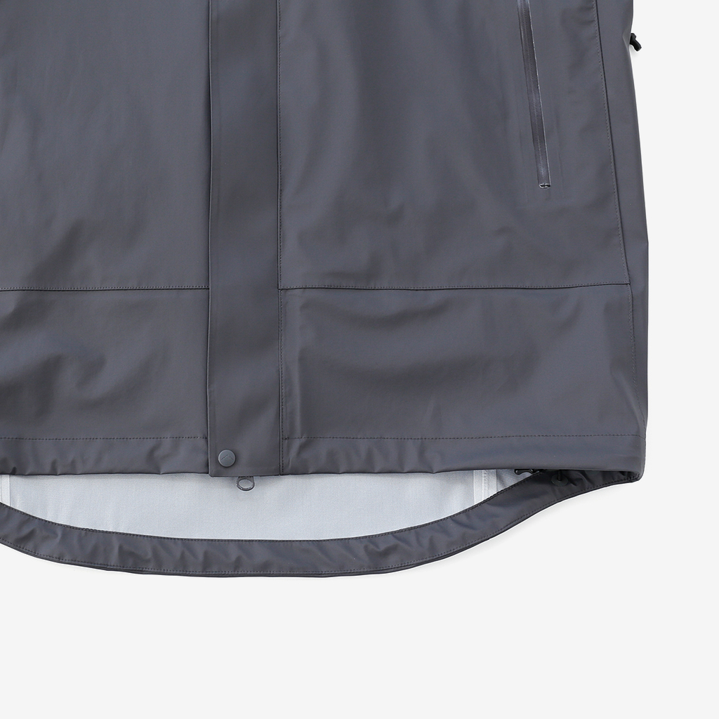 CAYL『3L Mountain Jacket』は、20Dのナイロン3レイヤー生地で作られたレインジャケット。 CAYLのレインジャケットシリーズの中では比較的厚手で、防風性、保温性の高いモデル。 両脇の下にはダブルジッパー式のベンチレーション、さらにフロントセンターもダブルジッパーなので、素早く換気できます。 フード部とウエスト部はストリングで絞れるようになっていて、手首はベルクロで調整できます。 アクティビティに適した十分なスペック、使い勝手を追求しながらも、タウンユースに馴染むデザイン性に優れた、CAYLらしいレインジャケットです。 Black、Grey、Creamの3カラー展開。 内側の左胸部にあるジッパーポケット。 モデル:184cm/Lサイズ