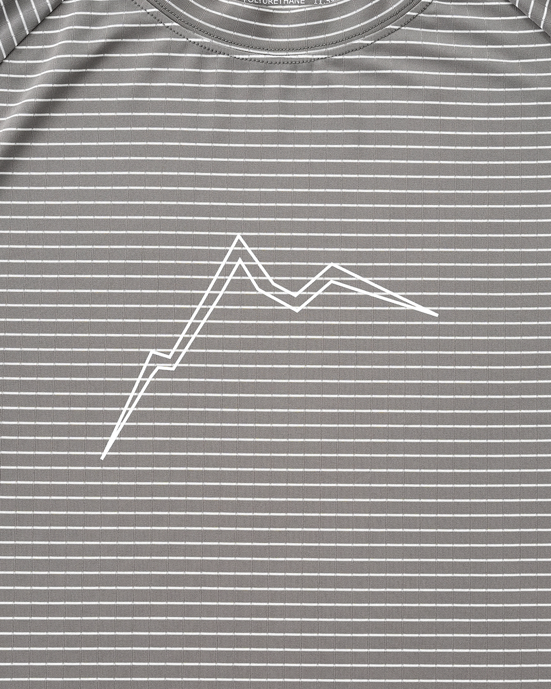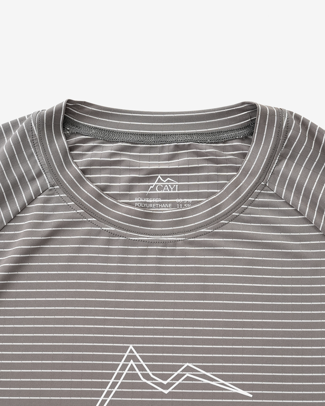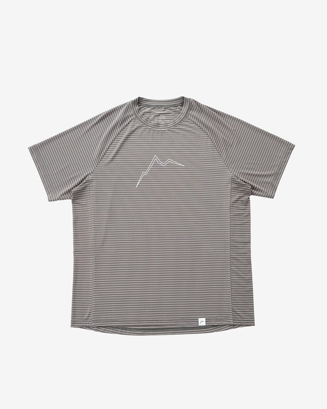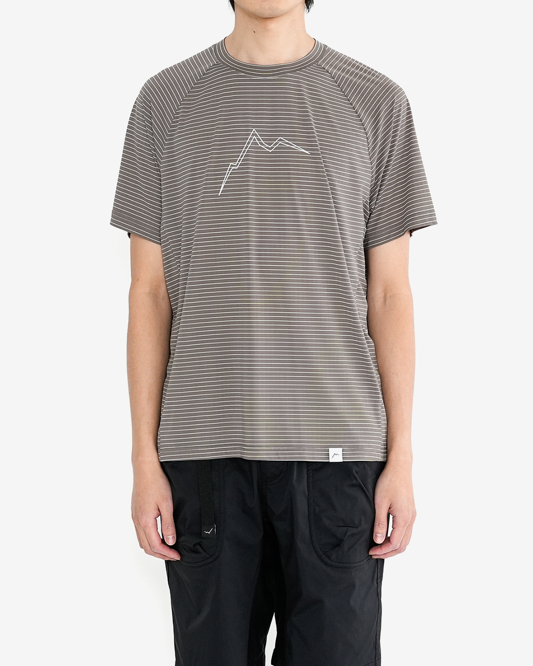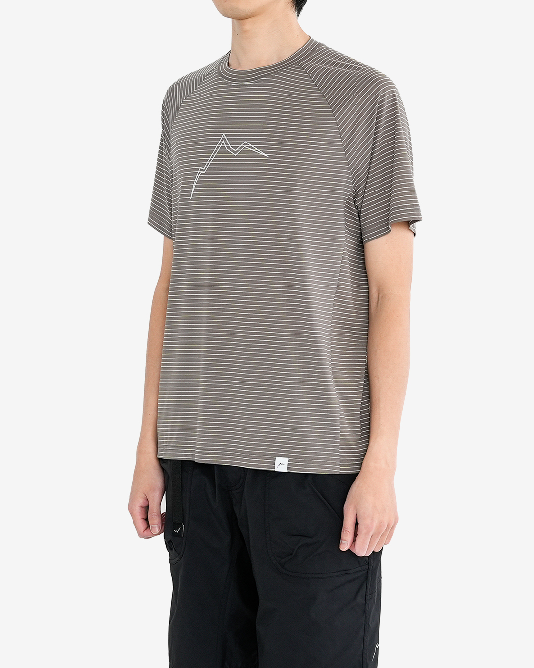 CAYL『Stripe B.L. Short Sleeve』は、ストライプ状の横メッシュ生地で作られた速乾ラグランTシャツ。 軽量で通気性が高く、吸汗速乾機能があり、ストレッチ性が高いので動きを妨げません。 多くの汗をかく夏山やランニングのベースレイヤーとしても最適です。 速乾ウェアではユニークなストライプパターンで、スタイリングのアクセントになってくれる1枚。 NMGでは、Black、Greyの2カラー展開になります。 モデル:184cm/Lサイズ