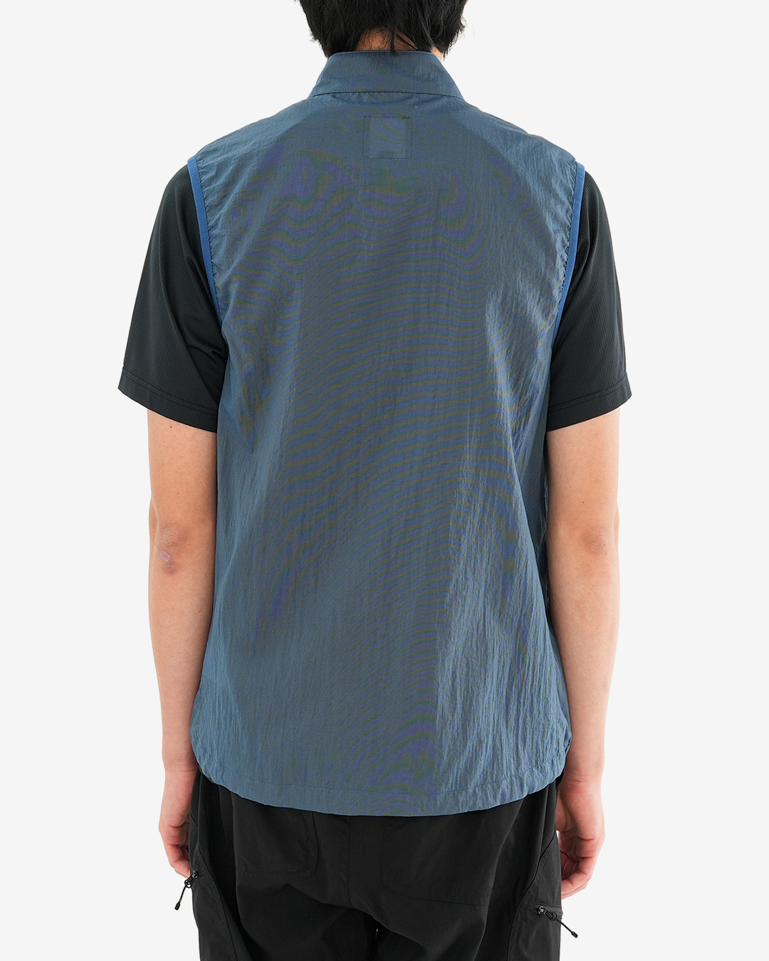 ファンの多いCAYLのReflectシリーズの最新作『Reflect Wind Vest』 軽量で防風性、通気性のバランスに優れたナイロン生地は、全体に反射プリントを施され、夜間の車やヘッドライトの光を反射し、安全に行動できます。 撥水加工もされており、ちょっとした雨なら凌げて、収納もコンパクト。 フロントはダブルジップなので、手軽にベンチレーションを調整でき、裾はコードで絞れます。 薄くてもしっかり防風してくれるので、アクティビティはもちろん、旅行、デイリーユースにも、1枚あるととても重宝するウインドベスト。スタイリングのアクセントにも最適です。 Black、Dark Grey、Dark Blueの3カラー展開になります。 背面。 フロントはダブルジップでベンチレーション調整もスムーズ。 裾はコードで絞れます。 モデル:184cm / Lサイズ 強い光が当たるとリフレクタープリントが浮かび上がります。 カラー:Dark Grey カラー:Dark Grey