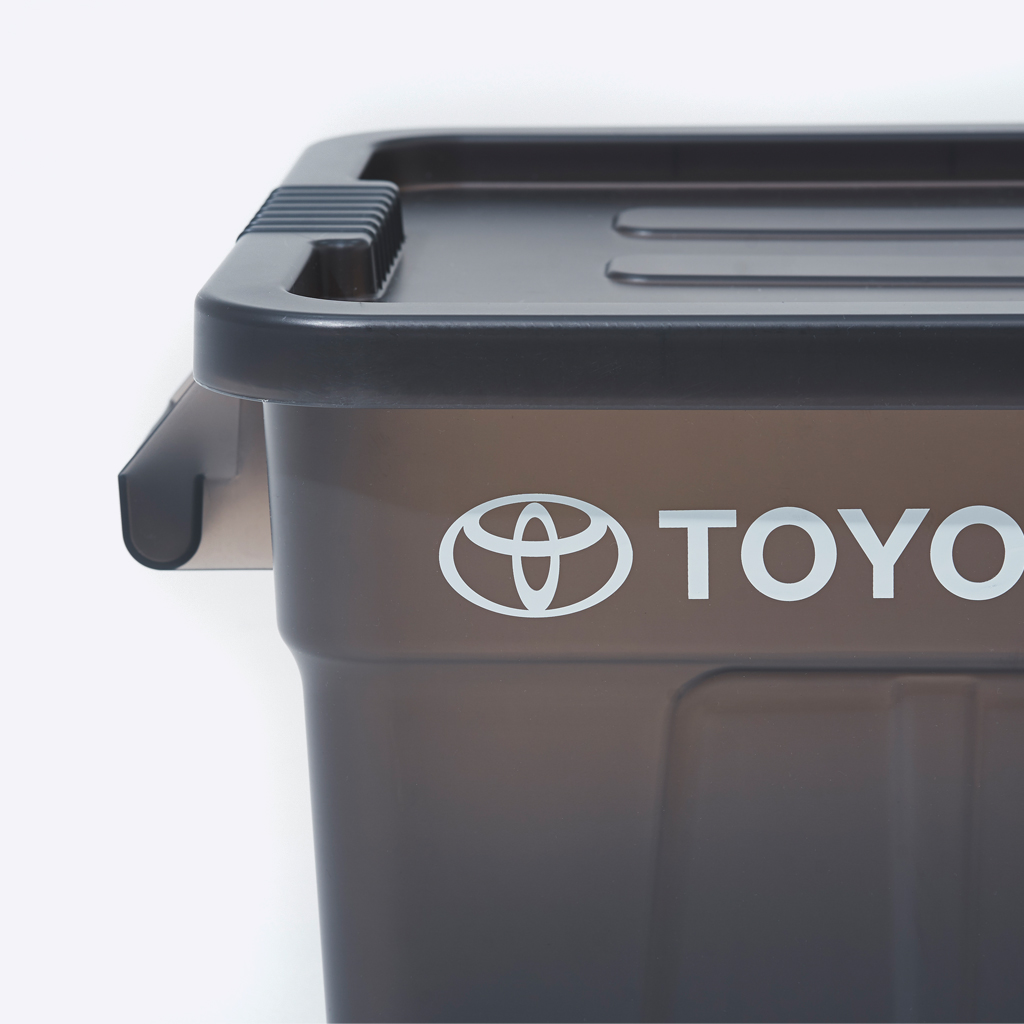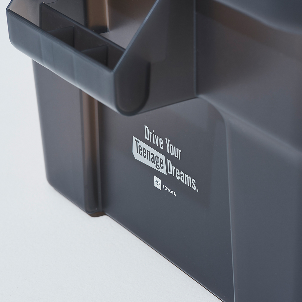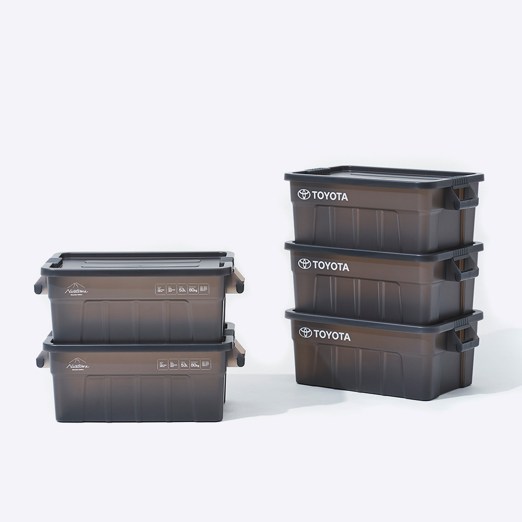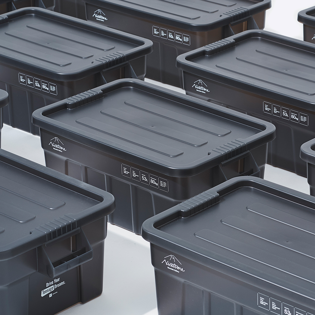 『Nicetime Mountain Gallery』×『トヨタ自動車株式会社』×『株式会社STARBASE』がコラボレーションした限定アイテム。 車の新たな魅力を次の世代に向けて発信する「Drive Your Teenage Dreams.」プロジェクト。 今回ナイスタイムでは、このプロジェクトの核となるマットブラックのハイエースをテーマに、フィールドワークをより一層快適にサポートする、機能やデザイン性に優れた4つの限定アイテムを制作いたしました。 TRUST社の高い耐性を誇るハンドル付きコンテナを、クリアブラックで別注したコラボレーションモデル。 スタッキングもでき、キャンプや登山ギア、衣類、ガレージのカー用品や工具の収納、キャンプサイトの整理整頓にも役立ちます。 中のものがギリギリ見えるか見えないか、絶妙なクリア具合にこだわりました。 ※本製品は業務用として作られているためラフな作りとなっており、本体に多少のキズやバリ、プリント擦れ、蓋に若干のゆがみなどがございます。予めご了承下さい。