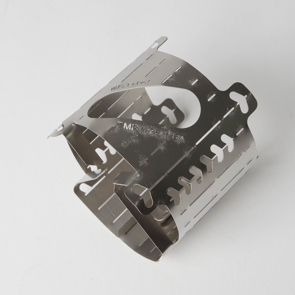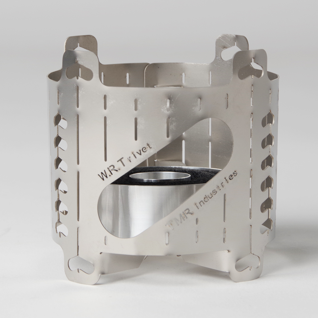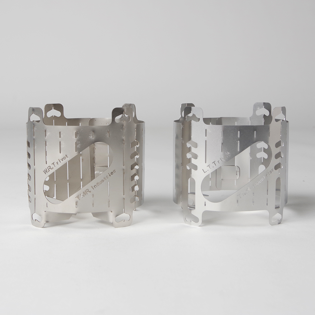 ギア好きのハートを揺さぶるTMRのチタン万能五徳『W.R.Trivet』 強度と重量のバランスを保つために厚さ0.5mmのチタンを使用。 ペグホールにペグを通して、燃料を置く台とすることができます。 地面に直置きから、6段のペグホールまでを使用して火元の高さを調節することにより、固形や液体燃料、焚火などさまざまな燃料での温度調節が可能です。 一方向を塞いだ形状が風防の役割を果たします。 スリット線は外観のバランスに加え吸気口としての働きをも担います。 空き缶を再利用してポットとして使用することも可能です。 新しい使い方の発見はアウトドアの醍醐味。所有される方々と共に経験値を高める道具としてご使用いただけましたら幸いです。 使用イメージ。 左:『W.R.Trivet』 右:『L.T.Trivet』 左:『W.R.Trivet』 右:『L.T.Trivet』