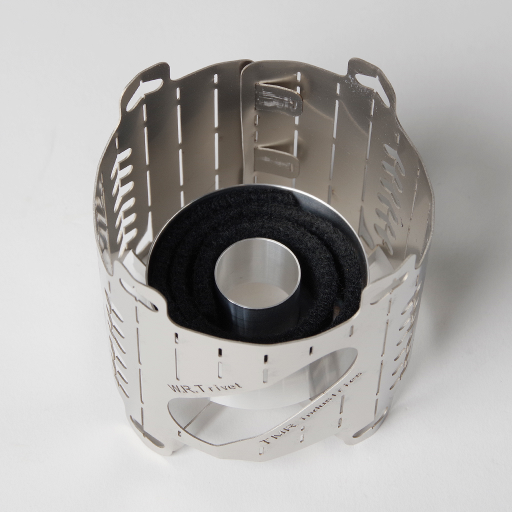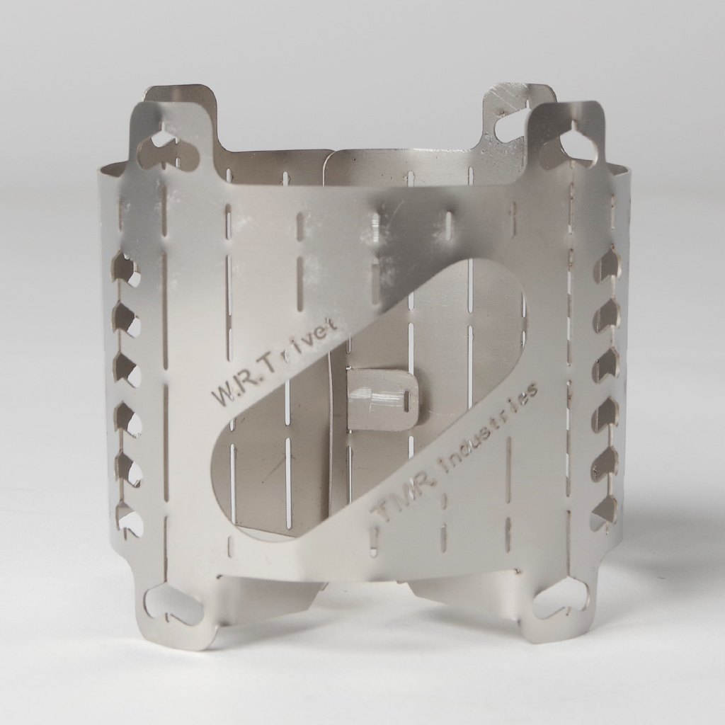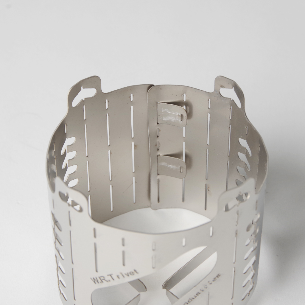 ギア好きのハートを揺さぶるTMRのチタン万能五徳『W.R.Trivet』 強度と重量のバランスを保つために厚さ0.5mmのチタンを使用。 ペグホールにペグを通して、燃料を置く台とすることができます。 地面に直置きから、6段のペグホールまでを使用して火元の高さを調節することにより、固形や液体燃料、焚火などさまざまな燃料での温度調節が可能です。 一方向を塞いだ形状が風防の役割を果たします。 スリット線は外観のバランスに加え吸気口としての働きをも担います。 空き缶を再利用してポットとして使用することも可能です。 新しい使い方の発見はアウトドアの醍醐味。所有される方々と共に経験値を高める道具としてご使用いただけましたら幸いです。 使用イメージ。 左:『W.R.Trivet』 右:『L.T.Trivet』 左:『W.R.Trivet』 右:『L.T.Trivet』