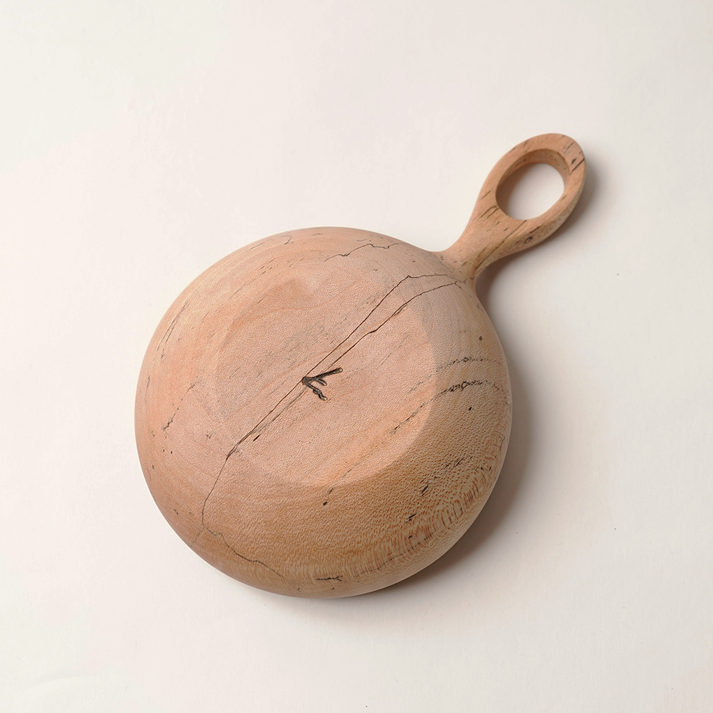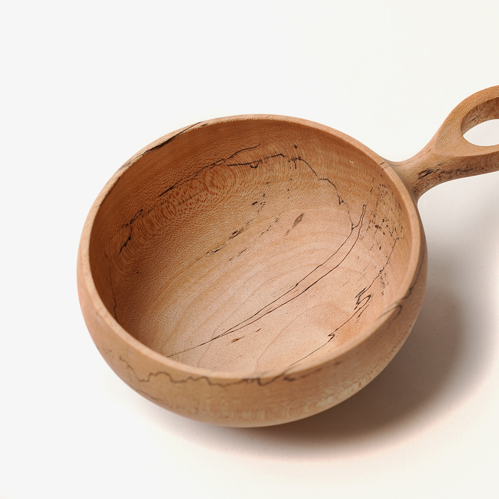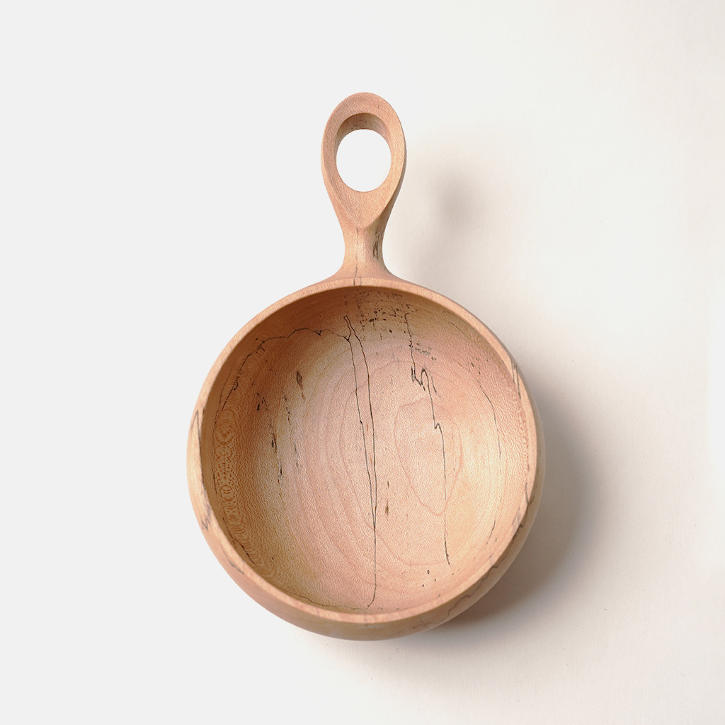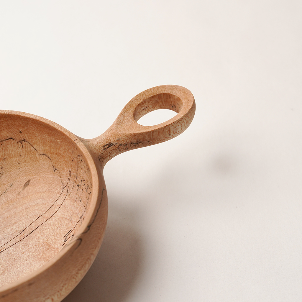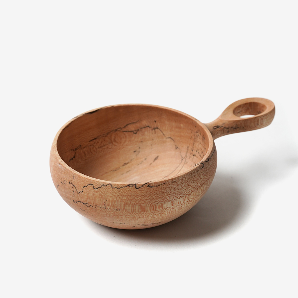 立山連峰を望む富山の地で、自分の愛する登山と料理のための木の器などを製作する木工作家、中西健太氏による【foot of the mountain】 ザックに掛けて外でも楽しめる器でありながら、暮らしにも馴染むものを手掛けています。 Nicetime Mountain Galleryからのリクエストによるシンプルなハンドルで仕上げられたボウル。 ひとかたまりの木材から削り出して、ハンドメイドで一点一点丁寧に作られています。これだけ厚みのあるかたまりを手に入れることもなかなか難しいサイズ。非常に贅沢な作りです。 こちらは希少な楓のスポルテッド材で作られた、オリジナリティあふれる作品。 Sサイズはコーヒーやスープなどの飲み物や、薬味、ソース皿に適した大きさです。 天然の木目を活かした存在感は、乾き物のおつまみなどもこれに入れるだけで特別な一皿になってくれます。 S、M、Lサイズは綺麗に重ねて収納できます。 一点一点丁寧に作られた、佇まいも美しい器です。