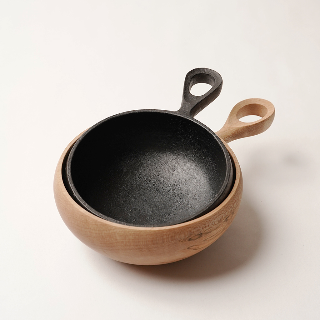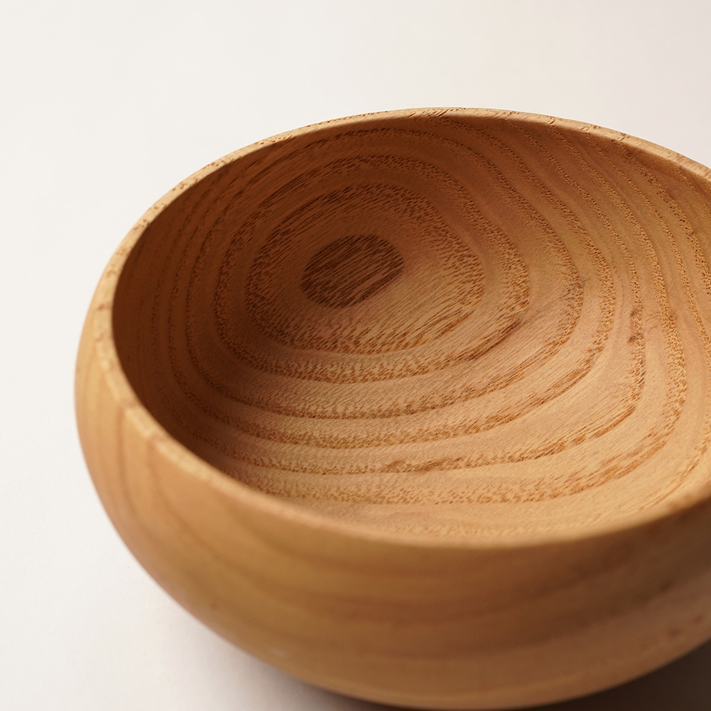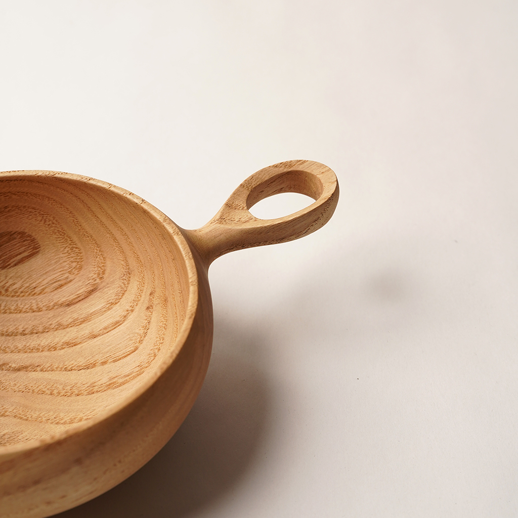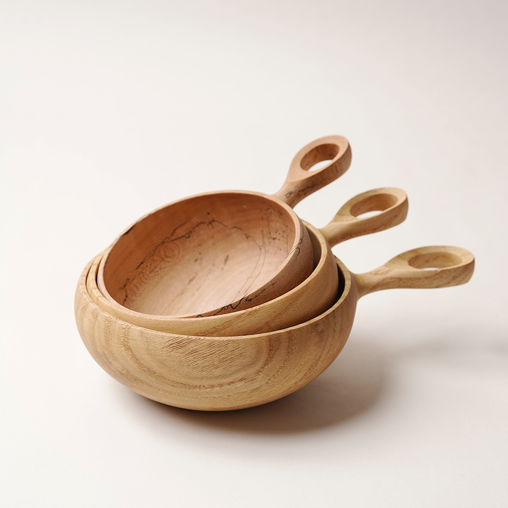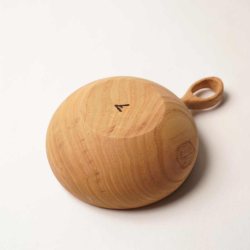 立山連峰を望む富山の地で、自分の愛する登山と料理のための木の器などを製作する木工作家、中西健太氏による【foot of the mountain】 ザックに掛けて外でも楽しめる器でありながら、暮らしにも馴染むものを手掛けています。 Nicetime Mountain Galleryからのリクエストによるシンプルなハンドルで仕上げられたボウル。 ひとかたまりの木材から削り出して、ハンドメイドで一点一点丁寧に作られています。これだけ厚みのあるかたまりを手に入れることもなかなか難しいサイズ。非常に贅沢な作りです。 こちらは水に強く耐久性の高い栗材で作られた作品。 Mサイズはコーヒーやスープなどの飲み物や、シリアルなどの食事にも適した大きさで、手に収まりの良いサイズです。 天然の木目を活かした存在感は、乾き物のおつまみなどもこれに入れるだけで特別な一皿になってくれます。 S、M、Lサイズは綺麗に重ねて収納できます。 一点一点丁寧に作られた、佇まいも美しい器です。