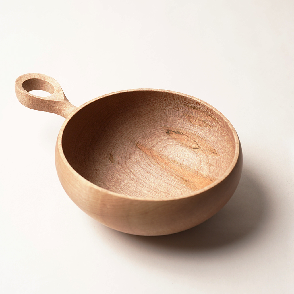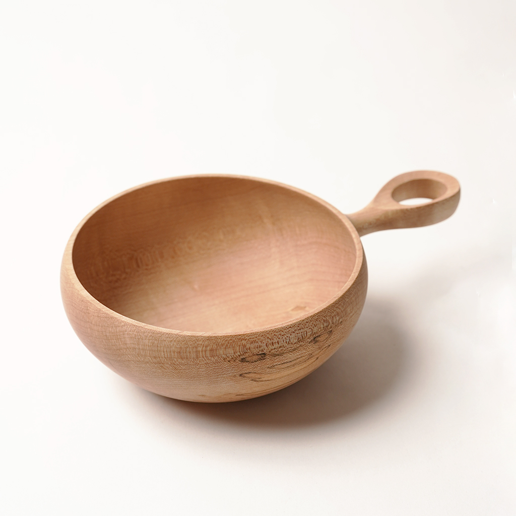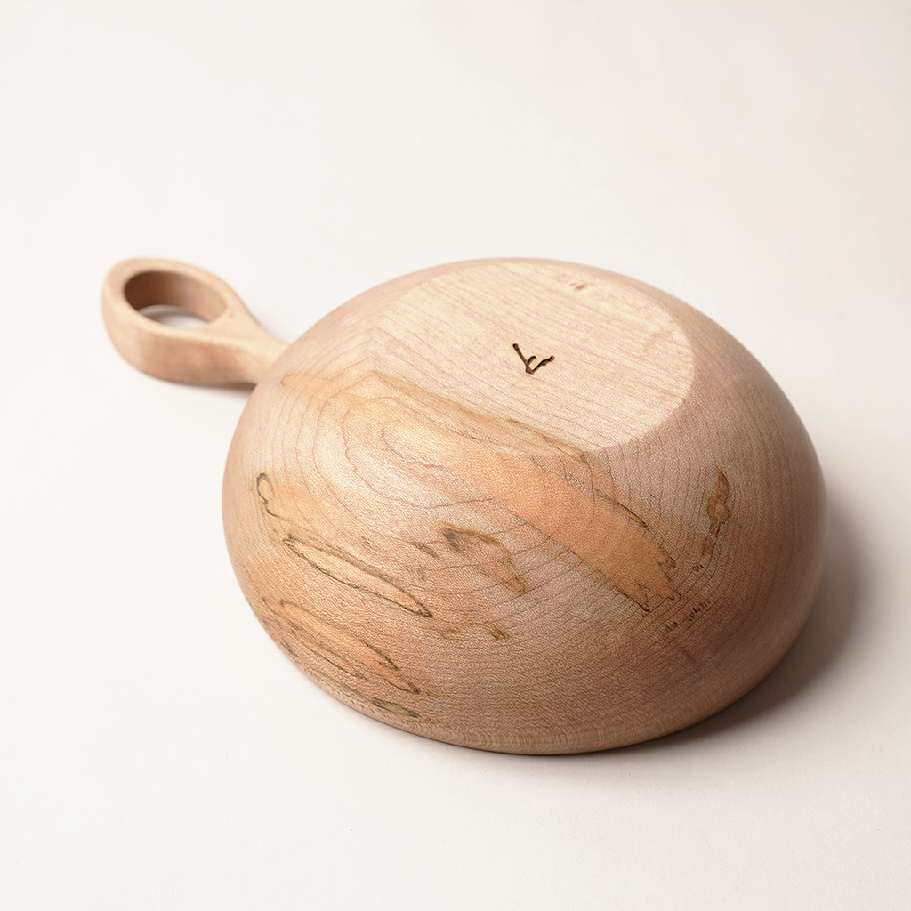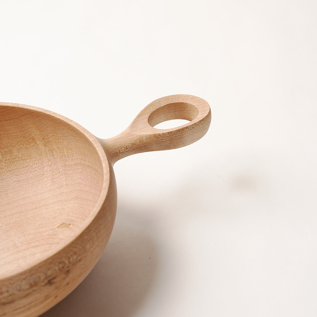 立山連峰を望む富山の地で、自分の愛する登山と料理のための木の器などを製作する木工作家、中西健太氏による【foot of the mountain】 ザックに掛けて外でも楽しめる器でありながら、暮らしにも馴染むものを手掛けています。 Nicetime Mountain Galleryからのリクエストによるシンプルなハンドルで仕上げられたボウル。 ひとかたまりの木材から削り出して、ハンドメイドで一点一点丁寧に作られています。これだけ厚みのあるかたまりを手に入れることもなかなか難しいサイズ。非常に贅沢な作りです。 非常に硬く、強度があり、緻密で滑らかな木肌の楓材で作られた作品。 Lサイズは幅広い食事に使いやすい大きさです。取り皿としても。 天然の木目を活かした存在感は、乾き物のおつまみなどもこれに入れるだけで特別な一皿になってくれます。 S、M、Lサイズは綺麗に重ねて収納できます。 一点一点丁寧に作られた、佇まいも美しい器です。