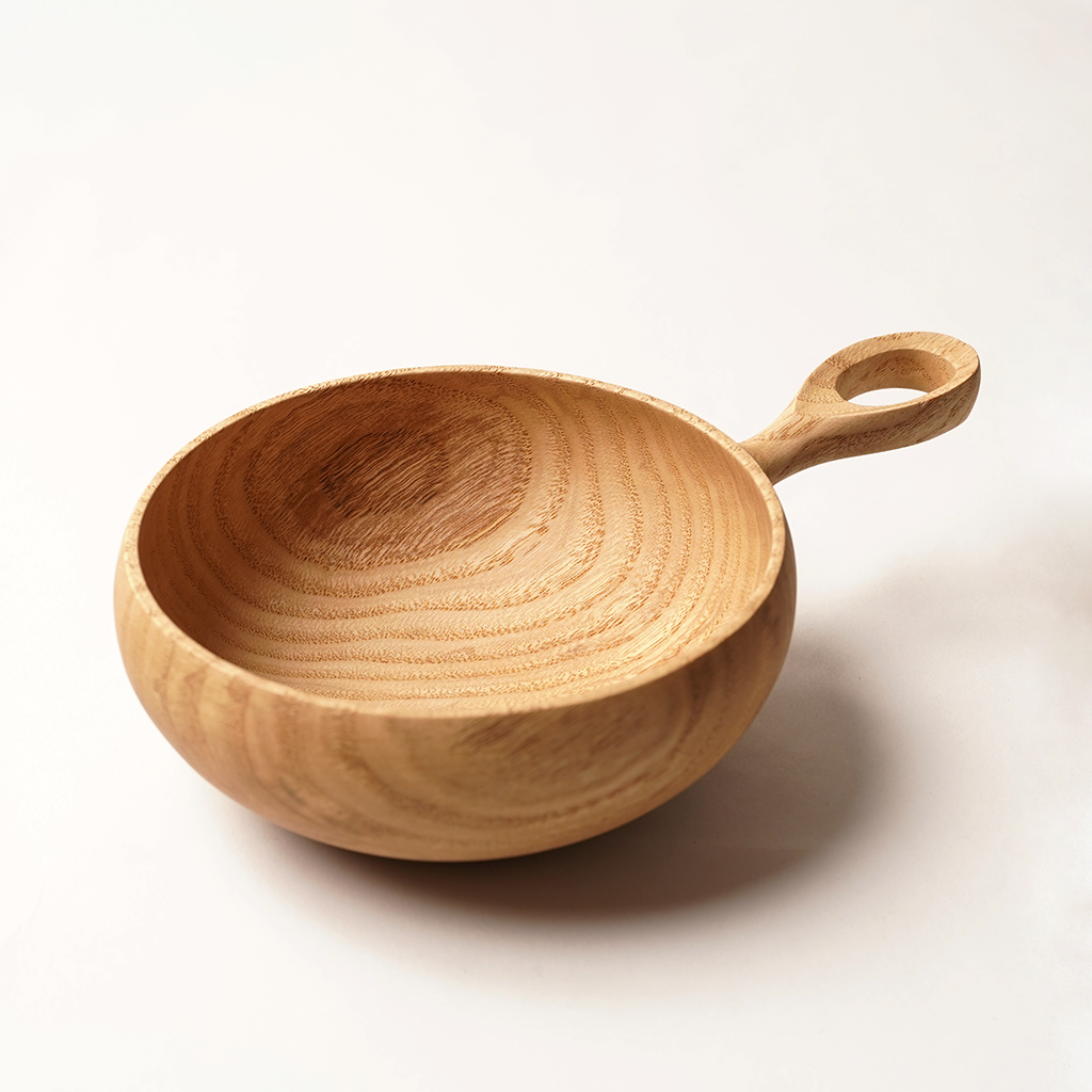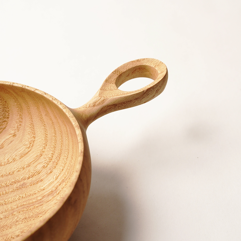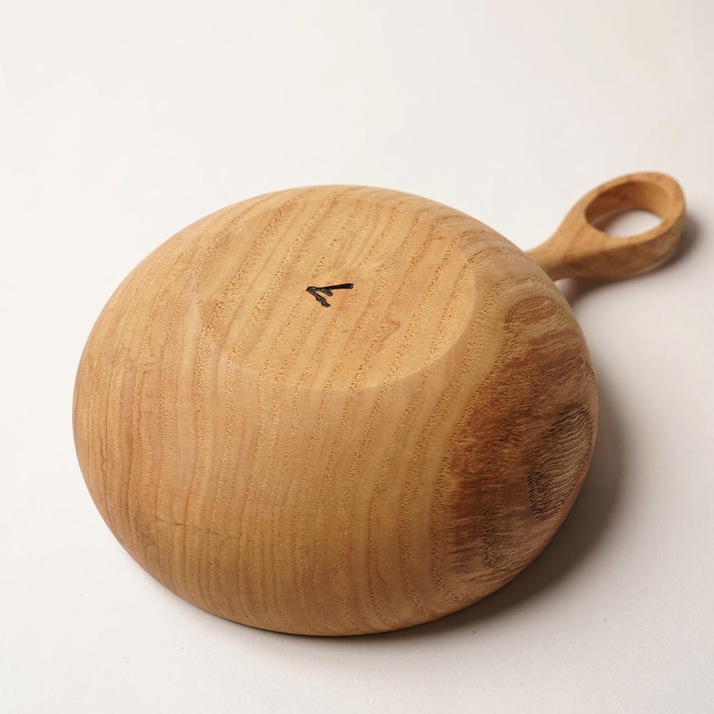 立山連峰を望む富山の地で、自分の愛する登山と料理のための木の器などを製作する木工作家、中西健太氏による【foot of the mountain】 ザックに掛けて外でも楽しめる器でありながら、暮らしにも馴染むものを手掛けています。 Nicetime Mountain Galleryからのリクエストによるシンプルなハンドルで仕上げられたボウル。 ひとかたまりの木材から削り出して、ハンドメイドで一点一点丁寧に作られています。これだけ厚みのあるかたまりを手に入れることもなかなか難しいサイズ。非常に贅沢な作りです。 こちらは水に強く耐久性の高い栗材で作られた作品。 Lサイズは幅広い食事に使いやすい大きさです。取り皿としても。 天然の木目を活かした存在感は、乾き物のおつまみなどもこれに入れるだけで特別な一皿になってくれます。