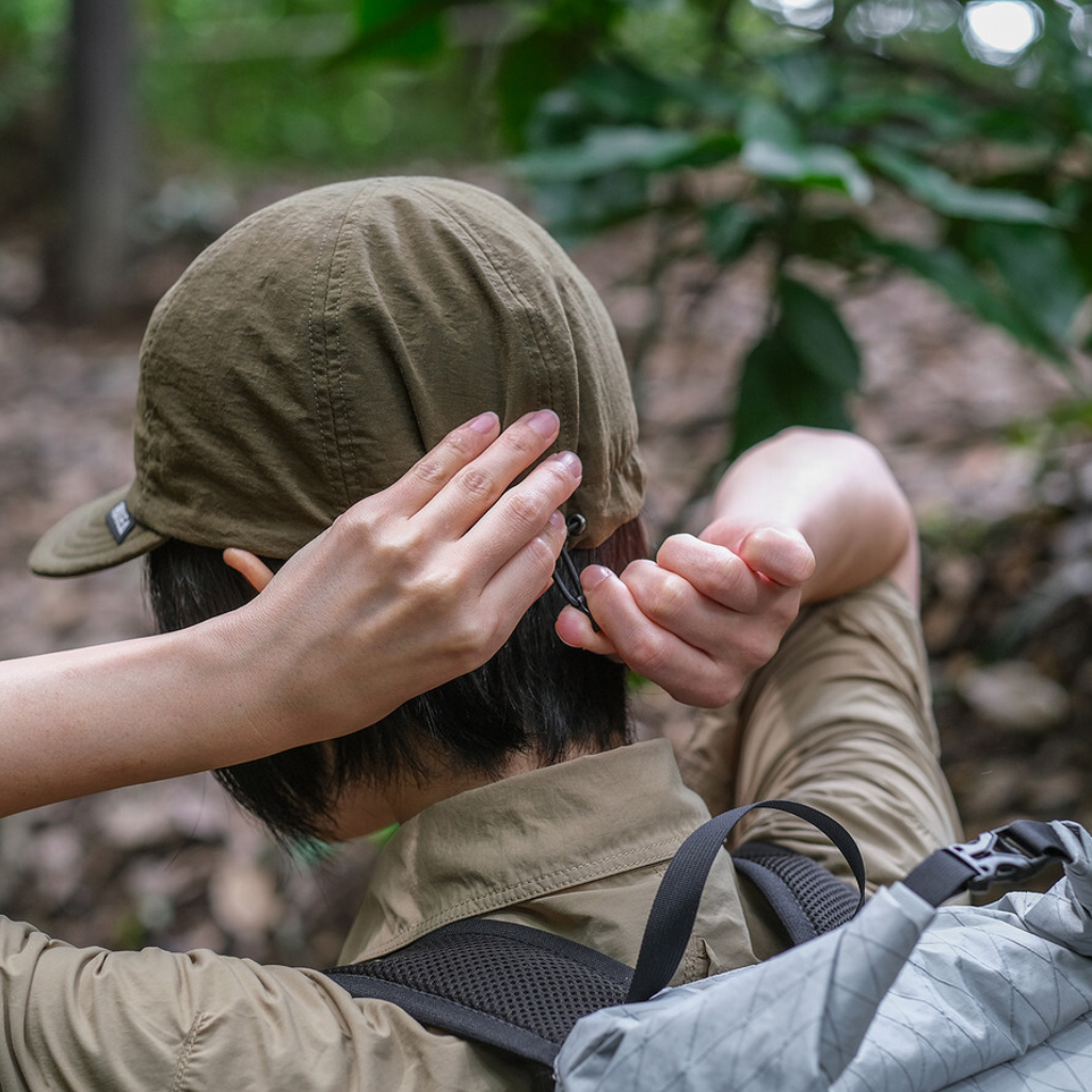 山で過ごす時間や、それにいたるまでの日々の生活をシンプルに過ごす為の道具を作るメーカー【RIDGE MOUNTAIN GEAR(リッジマウンテンギア)】 神奈川県逗子市にアトリエを構え、自分で使う為の山道具を自分自身で作ることを発想の起点にして、シンプルで長く付き合える道具を1点1点丁寧にものづくりをしています。 RIDGE MOUNTAIN GEARの代表作である『Basic Cap』に、Big Headers待望のサイズアップバージョンが登場です! いままで『Basic Cap』を被りたくてもサイズが合わなかった方、『Basic Cap』を被っているけれどもう少しサイズにゆとりが欲しい方へ。 本体部分のデザインはベーシックな6枚接ぎ。サイクルキャップの様な本体が浅くヒサシが短いデザインとは対照的に、本体はゆったりと深く、ヒサシ部分は風の影響を受けすぎず日除けの効果も期待できる丁度良い長さ。 本体部分には撥水性、防風性、浸透性のあるナイロン100%素材、東レのStunner®を使用。雨風を防ぎながら発汗による不快感を防ぎます。 汗止め部分にはCOOLMAX®ファブリックを使用。鹿の子状のポリエステル100%素材で吸水速乾性・UVカット(UPF 40+)の機能を兼ね備えています。 山で快適なスペックを持ちながら、街に戻ってきても違和感なく使えるデザイン、質感のまさに『Basic Cap』です。 カラー:Grey カラー:Black 頭周りが3cm、高さが1cmサイズアップしました。 キャップの本体部分には撥水性、防風性、浸透性のあるナイロン100%素材、東レのStunner®を使用しています。雨風を防ぎながら発汗による不快感を防ぎ、耐久撥水機能にとても優れています。 合成繊維ながらコットン混紡の様なナチュラルな表情に加え、裏面に施されたコーティングで程良いハリのある風合いを実現しています。 サイズが大きい場合や風の影響を受けやすいシチュエーションでは、後ろのプラスチックタブを引きゴムを引き締める事によりサイズ調整が可能です。 汗止め部分にはCOOLMAX®ファブリックを使用しています。 鹿の子状のポリエステル100%素材で吸水速乾性・UVカット(UPF 40+)の機能を兼ね備えています。 サイズに余裕がある場合、後ろがふんわりと膨らみます。 被る方の頭周りの大きさにより被った後の表情が変化するのも特徴です。 山で快適なスペックを持ちながら、街に戻ってきても違和感なく使えるデザインです。
