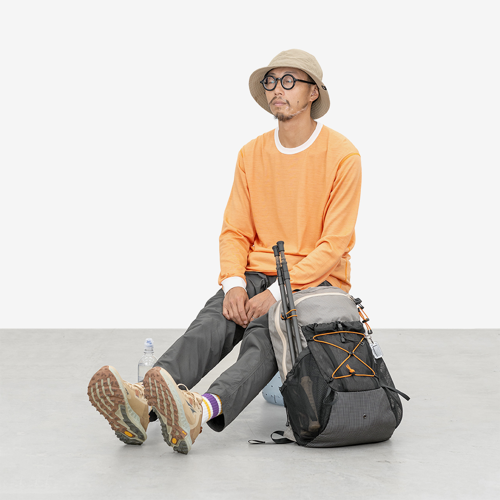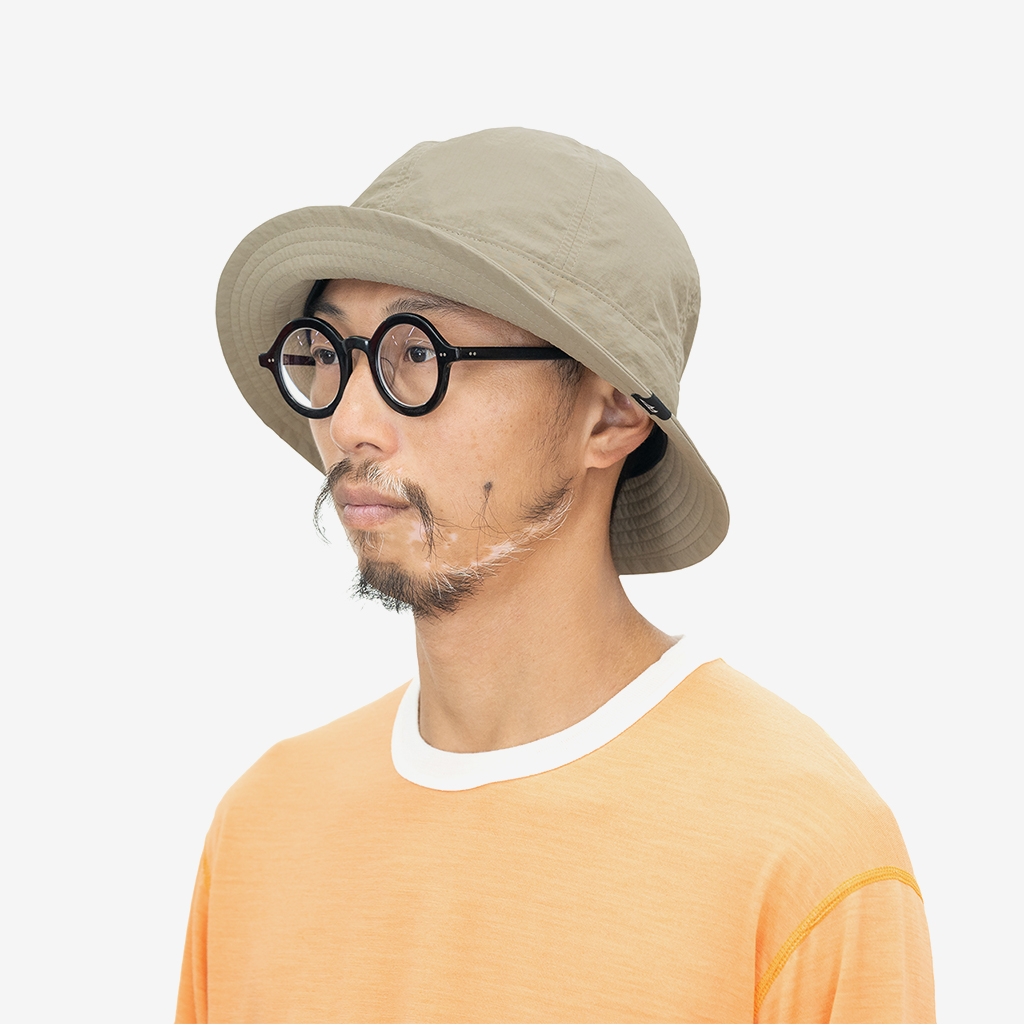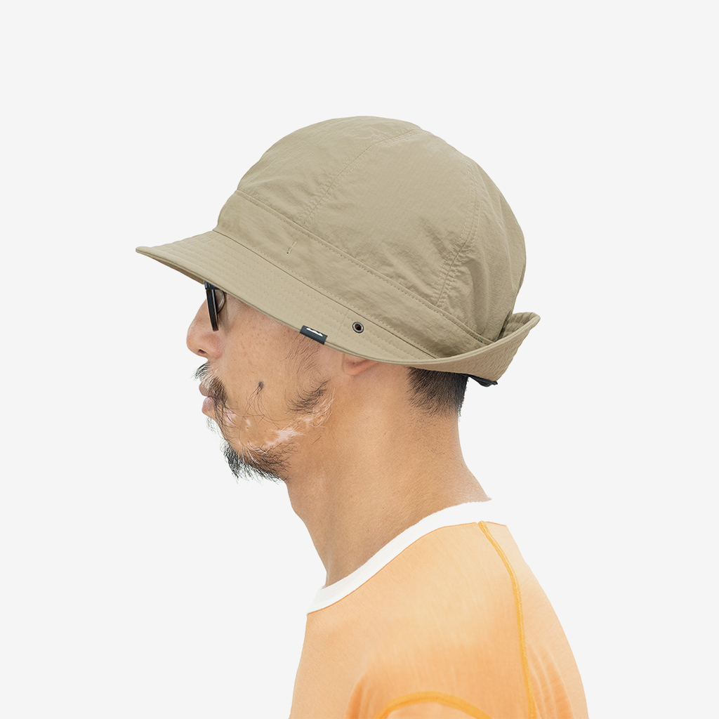 山で過ごす時間や、それにいたるまでの日々の生活をシンプルに過ごす為の道具を作るメーカー【RIDGE MOUNTAIN GEAR(リッジマウンテンギア)】 神奈川県逗子市にアトリエを構え、自分で使う為の山道具を自分自身で作ることを発想の起点にして、シンプルで長く付き合える道具を1点1点丁寧にものづくりをしています。 この『Field Hat』は、大きめのヒサシで十分な日除けの効果が期待できるハット。低山でのハイク、森の散策、日常の散歩、旅に。 頭周りが少々大きめという代表の黒澤さん自身が、ストレス無く安心して被れる『Basic Cap』をベースにしています。 本体部分には、繊維廃棄物から再生されたナイロンを使用。ナイロン特有のタフな強度はそのままに、ふわっと仕上がるタスラン糸によるコットンタッチとナイロンのソフトな風合いを兼ね備えた素材です。リップストップ組織の生地の表面には撥水加工が施されています。 汗止め部分にはCOOLMAXファブリックを使用。鹿の子状のポリエステル100%素材で吸水速乾性・UVカット(UPF 40+)の機能を兼ね備えています。 付属のロープは取り外しも可能。不要な場合は簡単に外せます。 ファンの多いRIDGE MOUNTAIN GEARの帽子の中でも、もっとも日除け効果の高いハットの登場です。 カラー:Deep Graphite カラー:Abyss Black ロープ先のプラパーツを上画像のように開くと、ロープが取り外しできます。隙間に爪を引っ掛けると簡単に外せます。 低山でのハイク、森の散策、日常の散歩、旅に。