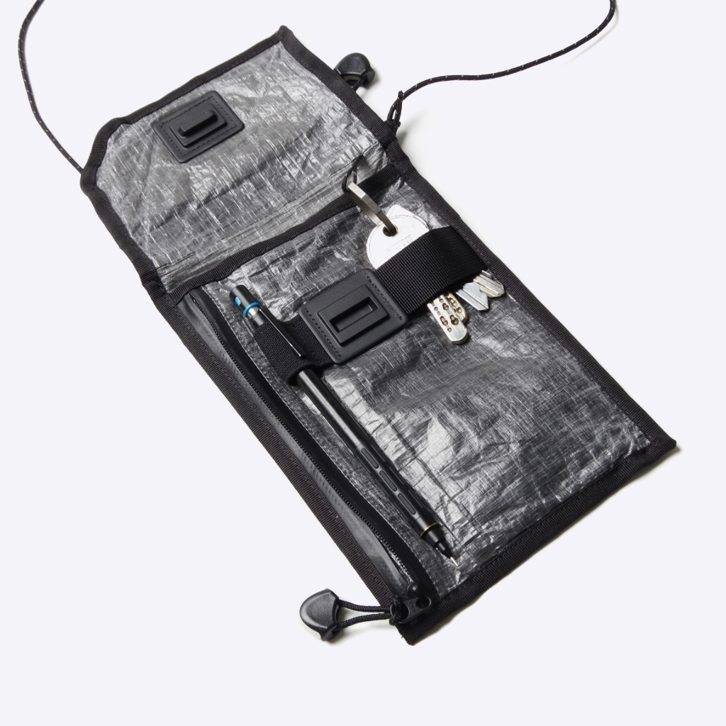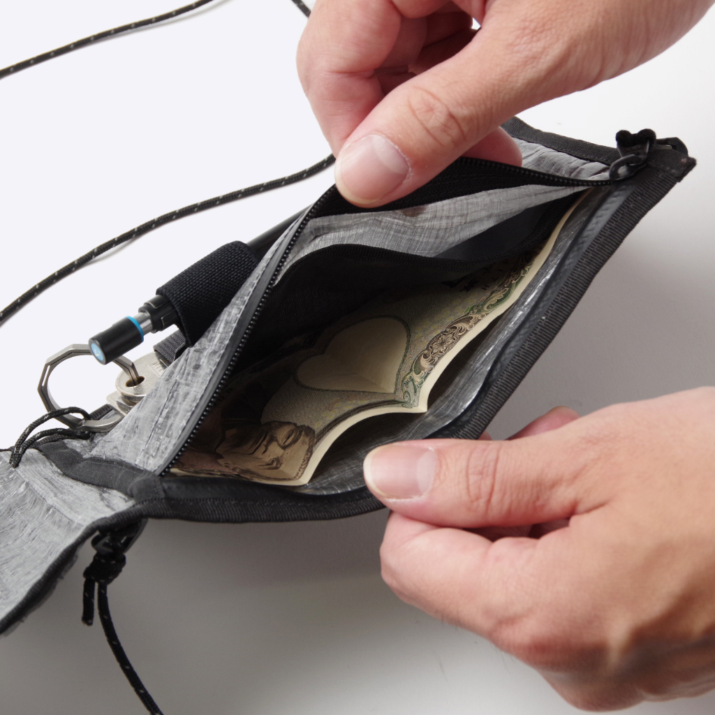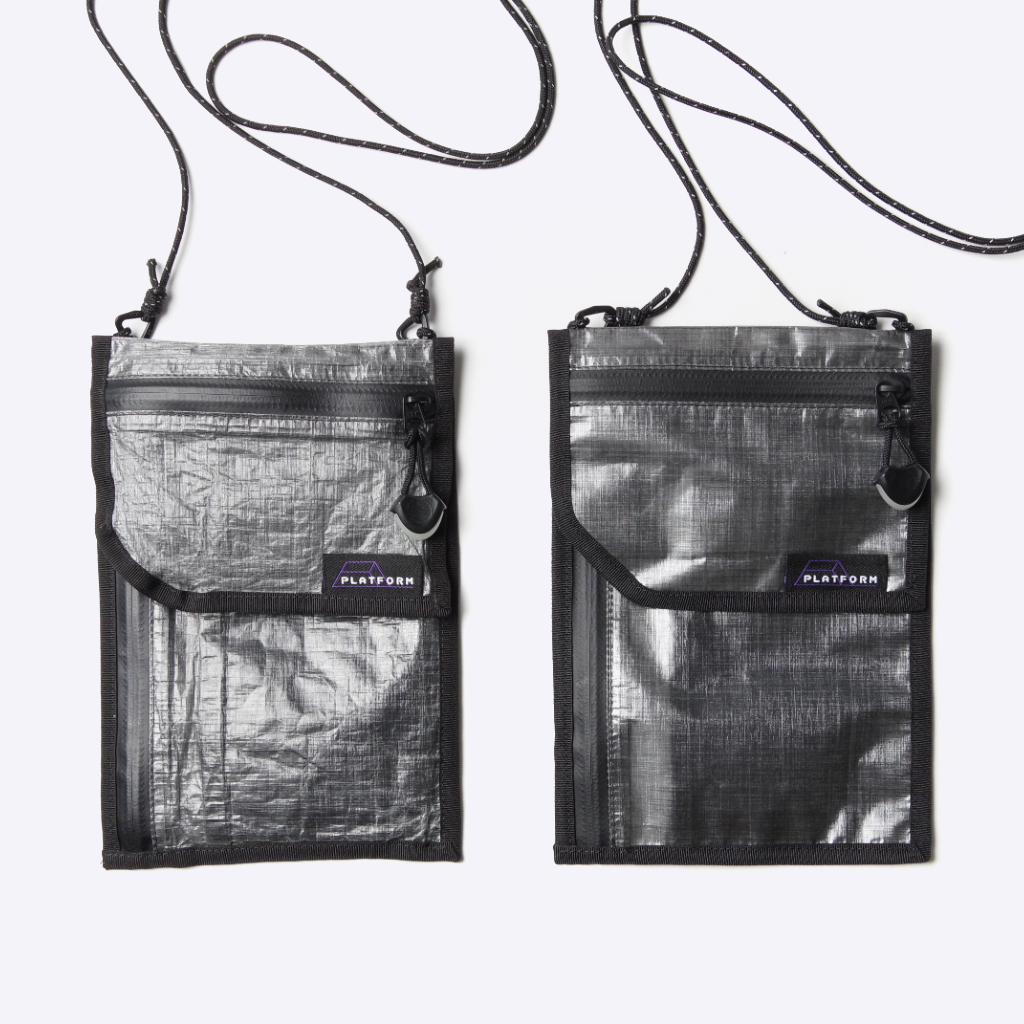 海外旅行に行けなくなって久しいですが、この窮屈な空気感が早く晴れることを願って作られたFlatPass。 シンプルな部屋割りで構成された、ミニマルサコッシュです。 パスポート、航空券、ペン、メモ、iPhone、カード、紙幣、チケットや切符などの収納に最適。 旅先で何かと増えがちな紙類の管理にもオススメです。 僕は展示会をまわる時にとても重宝しています。 もちろん旅行以外でも、登山口までのアプローチや、散歩、手ぶら感覚で使えますので日常使いにも。 フラットな形状で、他のバッグへの収まりも良く、サブバック、お財布としても。 カラー:DCF Gray カラー:Hybrid Black ジッパープルは蓄光仕様 マグネットで気持ち良く開閉可能 裏面もポケットで、コンパクトなノートなども収納可能 サイドジップのインナーは、仕切りがあるので財布としても コードロックでお好きな長さに調整可能 サイドジップのインナーは、仕切りがあるので財布としても 左は、2ヶ月毎日使用した状態。生地の特性上、少し縮んで良い感じのクタっと感がでます。