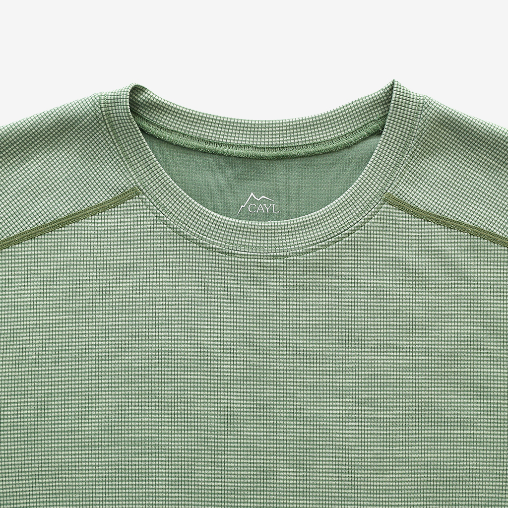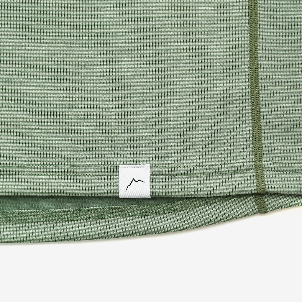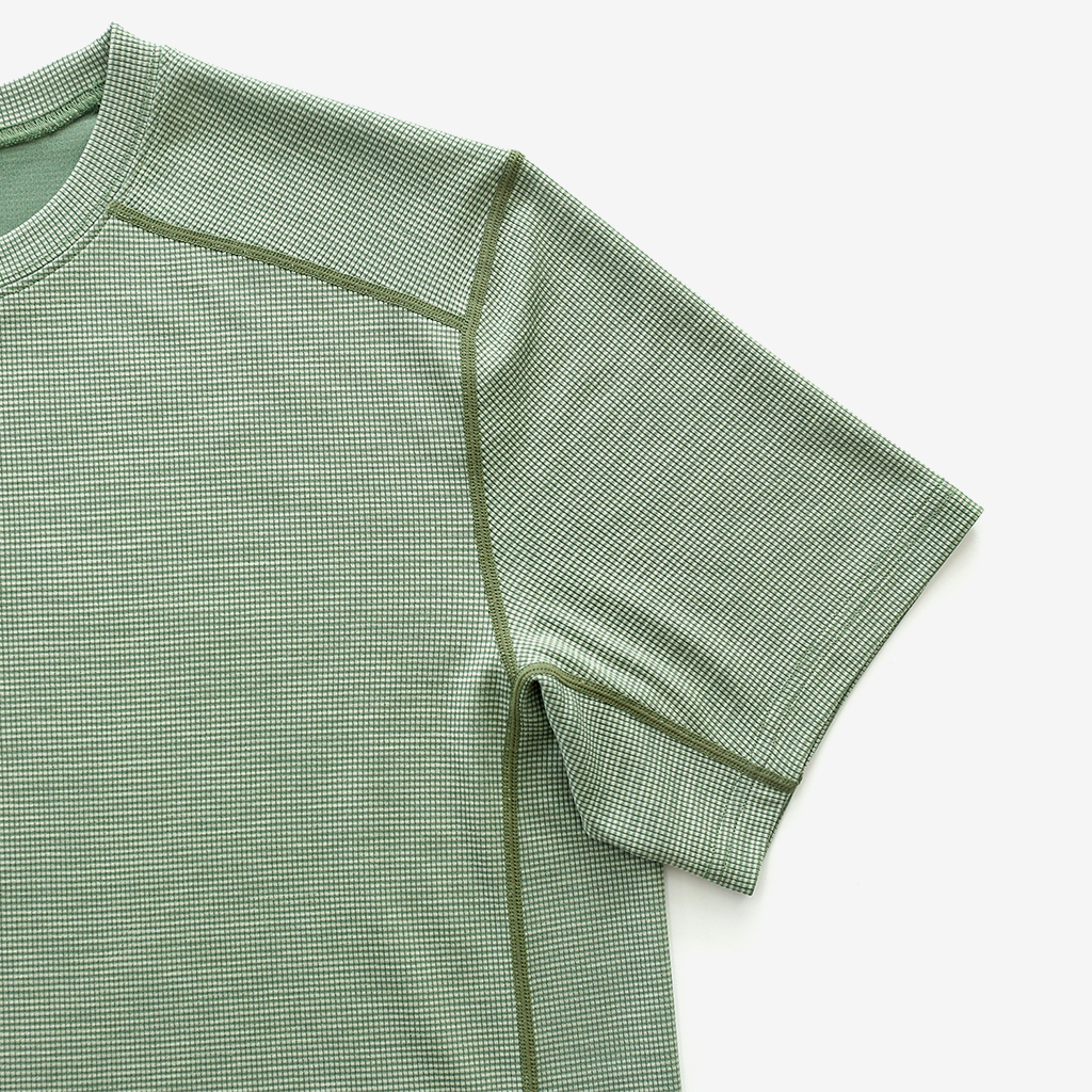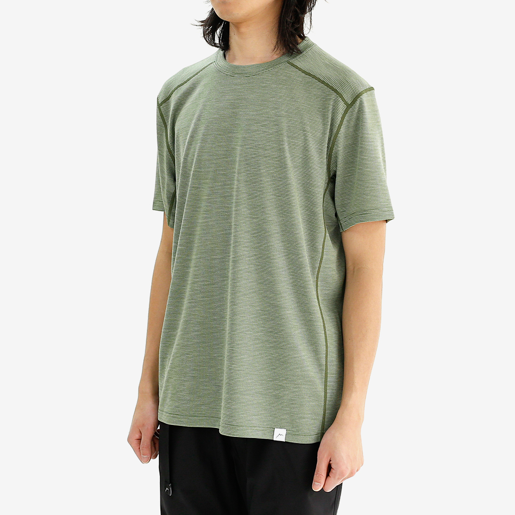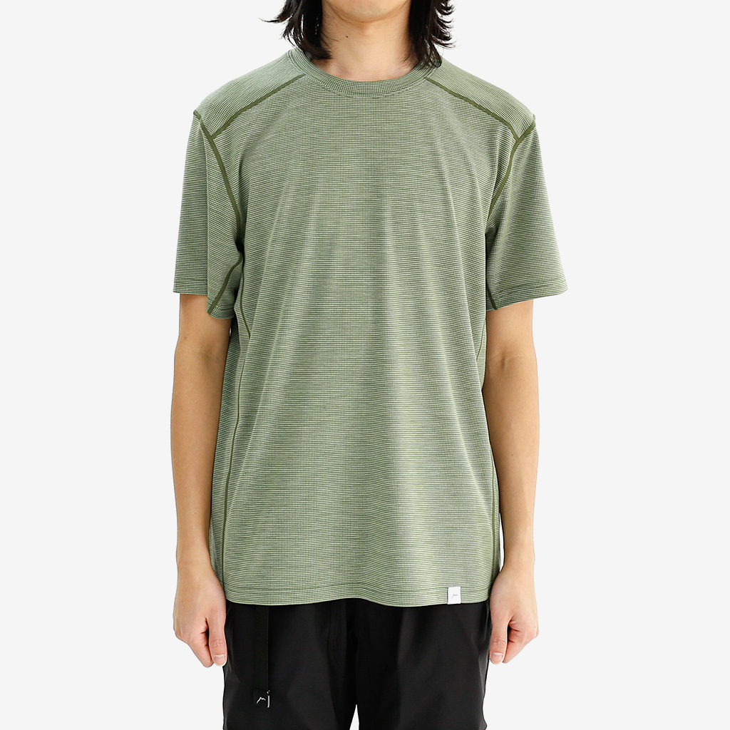 CAYL『Live Wool Mix Short Sleeve』は、メリノウールとクールマックスをメインに織られた韓国GRUBIG社のLive Wool素材を使ったショートスリーブ。 メリノウールの持つ抗菌、消臭、保温機能に加え、クールマックスの吸湿速乾性も併せ持ちます。 生地の耐久性も高く、イージーケアなところも特徴。気軽にメリノウールの良さを味わえます。 表面は凹凸があるので、1枚でサラッと着ても。 モデル:184cm/Lサイズ