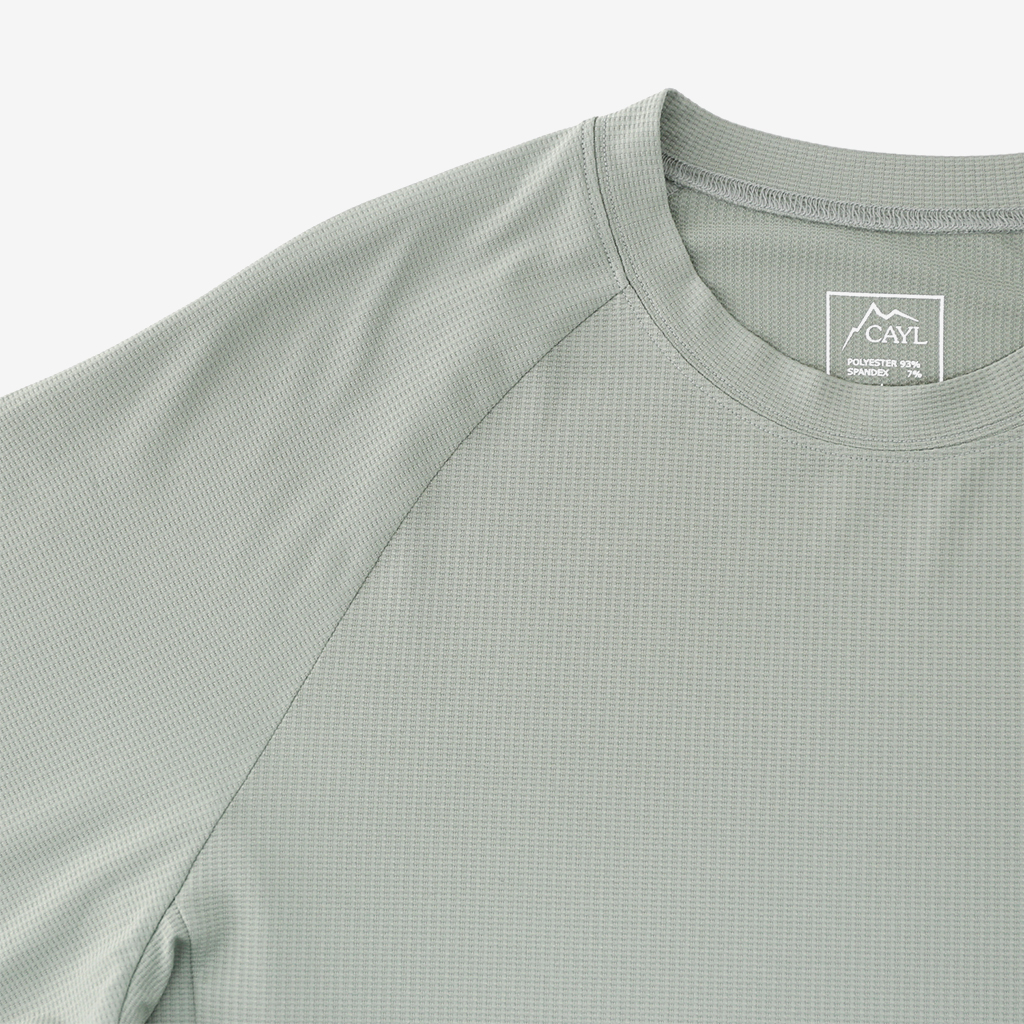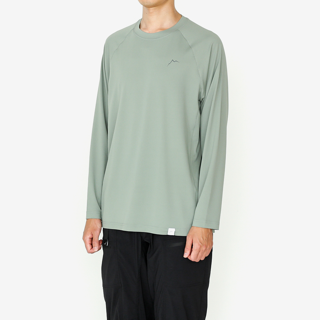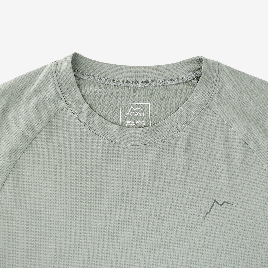 CAYL『Logo Air Short Sleeve』は、CAYLオリジナル生地で作られた速乾ラグランロングスリーブシャツ。 軽量で通気性が高く、吸汗速乾機能があり、さらにHeiq社の抗菌加工が施され、防臭効果もあります。 薄手ながら透けにくく、UVカット機能も備えているため、多くの汗をかく夏山やランニングのベースレイヤーとしても最適。 絶妙なカラー展開も魅力。 背面。 モデル:184cm Lサイズ着用