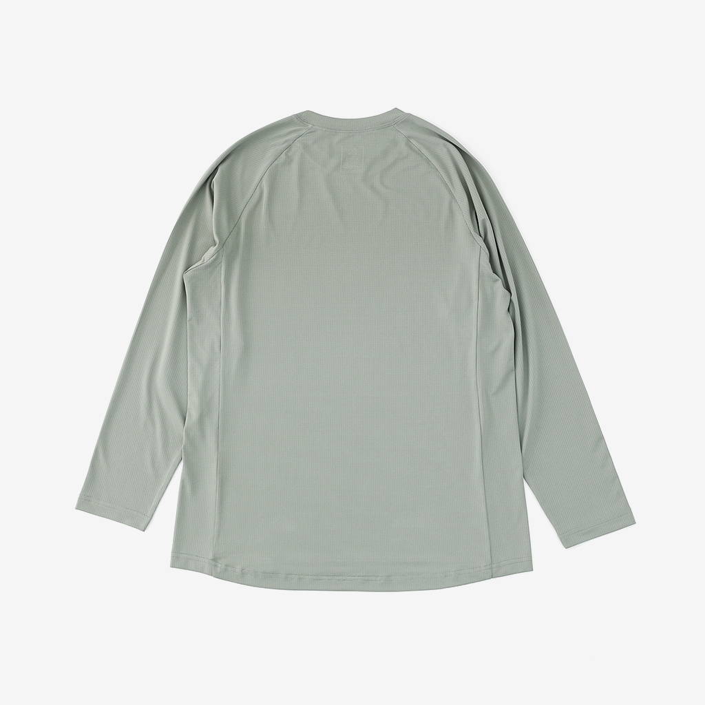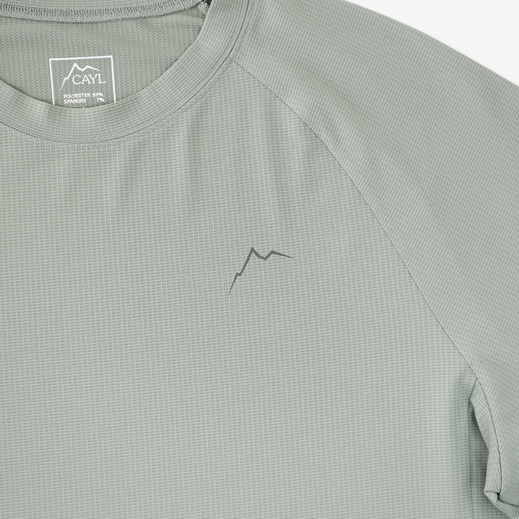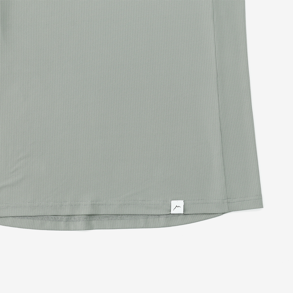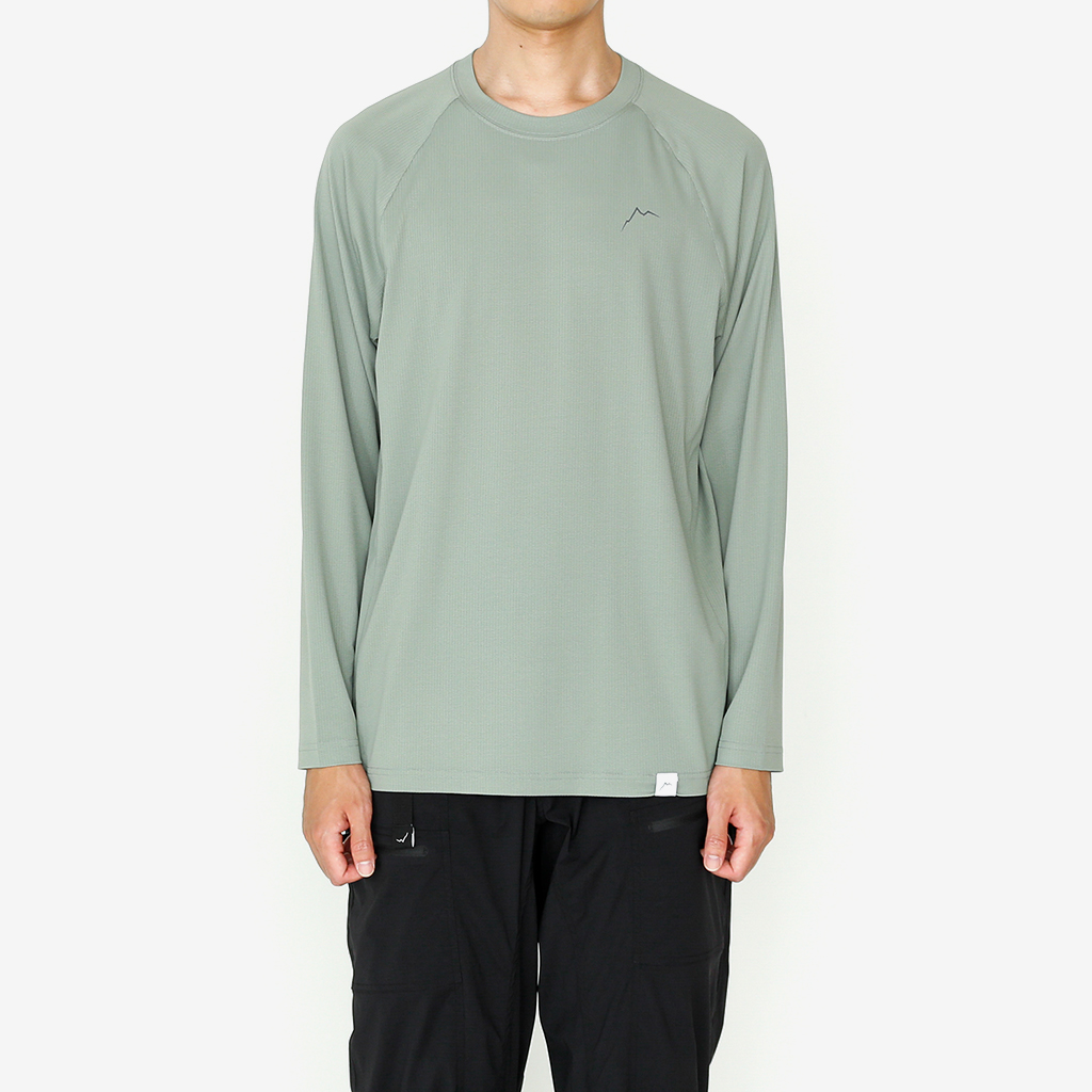 CAYL『Logo Air Short Sleeve』は、CAYLオリジナル生地で作られた速乾ラグランロングスリーブシャツ。 軽量で通気性が高く、吸汗速乾機能があり、さらにHeiq社の抗菌加工が施され、防臭効果もあります。 薄手ながら透けにくく、UVカット機能も備えているため、多くの汗をかく夏山やランニングのベースレイヤーとしても最適。 絶妙なカラー展開も魅力。 背面。 モデル:184cm Lサイズ着用